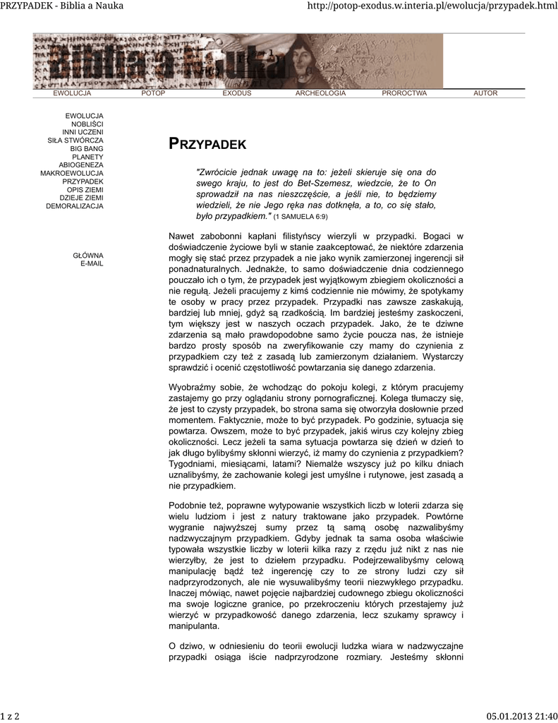 PRZYPADEK - Biblia a Nauka 1z2 EWOLUCJA EWOLUCJA NOBLIŚCI INNI UCZENI SIŁA STWÓRCZA BIG BANG PLANETY ABIOGENEZA MAKROEWOLUCJA PRZYPADEK OPIS ZIEMI DZIEJE ZIEMI DEMORALIZACJA GŁÓWNA E-MAIL http://potop-exodus.w.interia.pl/ewolucja/przypadek.html POTOP EXODUS ARCHEOLOGIA PROROCTWA AUTOR PRZYPADEK "Zwrócicie jednak uwagę na to: jeżeli skieruje się ona do swego kraju, to jest do Bet-Szemesz, wiedzcie, że to On sprowadził na nas nieszczęście, a jeśli nie, to będziemy wiedzieli, że nie Jego ręka nas dotknęła, a to, co się stało, było przypadkiem." (1 SAMUELA 6:9) Nawet zabobonni kapłani filistyńscy wierzyli w przypadki. Bogaci w doświadczenie życiowe byli w stanie zaakceptować, że niektóre zdarzenia mogły się stać przez przypadek a nie jako wynik zamierzonej ingerencji sił ponadnaturalnych. Jednakże, to samo doświadczenie dnia codziennego pouczało ich o tym, że przypadek jest wyjątkowym zbiegiem okoliczności a nie regułą. Jeżeli pracujemy z kimś codziennie nie mówimy, że spotykamy te osoby w pracy przez przypadek. Przypadki nas zawsze zaskakują, bardziej lub mniej, gdyż są rzadkością. Im bardziej jesteśmy zaskoczeni, tym większy jest w naszych oczach przypadek. Jako, że te dziwne zdarzenia są mało prawdopodobne samo życie poucza nas, że istnieje bardzo prosty sposób na zweryfikowanie czy mamy do czynienia z przypadkiem czy też z zasadą lub zamierzonym działaniem. Wystarczy sprawdzić i ocenić częstotliwość powtarzania się danego zdarzenia. Wyobraźmy sobie, że wchodząc do pokoju kolegi, z którym pracujemy zastajemy go przy oglądaniu strony pornograficznej. Kolega tłumaczy się, że jest to czysty przypadek, bo strona sama się otworzyła dosłownie przed momentem. Faktycznie, może to być przypadek. Po godzinie, sytuacja się powtarza. Owszem, może to być przypadek, jakiś wirus czy kolejny zbieg okoliczności. Lecz jeżeli ta sama sytuacja powtarza się dzień w dzień to jak długo bylibyśmy skłonni wierzyć, iż mamy do czynienia z przypadkiem? Tygodniami, miesiącami, latami? Niemalże wszyscy już po kilku dniach uznalibyśmy, że zachowanie kolegi jest umyślne i rutynowe, jest zasadą a nie przypadkiem. Podobnie też, poprawne wytypowanie wszystkich liczb w loterii zdarza się wielu ludziom i jest z natury traktowane jako przypadek. Powtórne wygranie najwyższej sumy przez tą samą osobę nazwalibyśmy nadzwyczajnym przypadkiem. Gdyby jednak ta sama osoba właściwie typowała wszystkie liczby w loterii kilka razy z rzędu już nikt z nas nie wierzyłby, że jest to dziełem przypadku. Podejrzewalibyśmy celową manipulację bądź też ingerencję czy to ze strony ludzi czy sił nadprzyrodzonych, ale nie wysuwalibyśmy teorii niezwykłego przypadku. Inaczej mówiąc, nawet pojęcie najbardziej cudownego zbiegu okoliczności ma swoje logiczne granice, po przekroczeniu których przestajemy już wierzyć w przypadkowość danego zdarzenia, lecz szukamy sprawcy i manipulanta. O dziwo, w odniesieniu do teorii ewolucji ludzka wiara w nadzwyczajne przypadki osiąga iście nadprzyrodzone rozmiary. Jesteśmy skłonni 05.01.2013 21:40 PRZYPADEK - Biblia a Nauka 2z2 http://potop-exodus.w.interia.pl/ewolucja/przypadek.html uwierzyć w to, że oczy, które doskonale widzą i umożliwiają rozróżnianie barw, uszy, które słyszą i pozwalają rozróżniać dźwięki, nos, który rozpoznaje zapachy, język, który odróżnia smaki, skóra, która pozwala nam odczuwać zewnętrzne otoczenie oraz wszystkie układy i doskonale rozwinięte narządy naszego organizmu powstały przez przypadek. Przyznajemy, że przez przypadek mamy ręce i nogi, przez przypadek pod naszą czaszką jest ukryty mózg, przez przypadek kobiety mają piersi a mężczyźni jądra, przez przypadek powstała mowa ludzka i przez przypadek doszło do powstania samej teorii ewolucji. Równie dobrze można mówić o przypadkowym wynalezieniu komputera przez małpy. Przypadkowość zbiegów okoliczności postulowanych przez teorię ewolucji jest tak absurdalnie mikroskopijna, że wymagana przez nią wiara z pewnością mogłaby przenieść wszystkie góry świata a chrześcijańska wiara w Boga Stwórcę wydaje się przy niej malutkim ziarenkiem gorczycy. Wiara w ponadnaturalne stworzenie jest z pewnością pewnym wyzwaniem dla ludzkiego umysłu, jednakże wiara w przypadkowe pochodzenie wszelkiego znanego nam życia przechodzi ludzkie pojęcie i jest całkowicie nie do ogarnięcia przez nasz rozum. Tym bardziej zaskakujący jest fakt, iż ateistyczni ewolucjoniści określają się mianem niewierzących racjonalistów... 05.01.2013 21:40