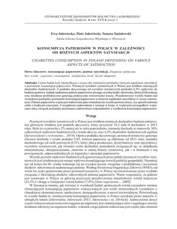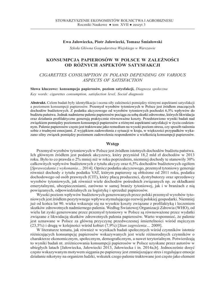 STOWARZYSZENIE EKONOMISTÓW ROLNICTWA I AGROBIZNESU Konsumpcja papierosów w Polsce w zależności od różnych aspektów satysfakcji Roczniki Naukowe ● tom XVII ● zeszyt 3 151 Ewa Jałowiecka, Piotr Jałowiecki, Tomasz Śmiałowski Szkoła Główna Gospodarstwa Wiejskiego w Warszawie KONSUMPCJA PAPIEROSÓW W POLSCE W ZALEŻNOŚCI OD RÓŻNYCH ASPEKTÓW SATYSFAKCJI CIGARETTES CONSUMPTION IN POLAND DEPENDING ON VARIOUS ASPECTS OF SATISFACTION Słowa kluczowe: konsumpcja papierosów, poziom satysfakcji, Diagnoza społeczna Key words: cigarettes consumption, satisfaction level, Social diagnosis Abstrakt. Celem badań były identyfikacja i ocena siły zależności pomiędzy różnymi aspektami satysfakcji a poziomem konsumpcji papierosów. Przemysł wyrobów tytoniowych w Polsce jest źródłem znaczących dochodów budżetowych. Z podatku akcyzowego od wyrobów tytoniowych pochodzi 6,5% wpływów do budżetu państwa. Jednak nadmierne palenie papierosów pociąga za sobą skutki zdrowotne, których likwidacja oraz działania profilaktyczne generują praktycznie równoważne koszty. Przedstawiono wyniki badań nad związkiem pomiędzy poziomem konsumpcji papierosów a różnymi aspektami satysfakcji w życiu codziennym. Palenie papierosów często jest traktowane jako remedium na wysoki poziom stresu, czy sposób radzenia sobie z trudnymi emocjami. Z wyjątkiem zadowolenia z sytuacji w kraju, w większości przypadków wykazano silny związek pomiędzy poziomem zadowolenia respondentów a wielkością konsumpcji papierosów. Wstęp Przemysł wyrobów tytoniowych w Polsce jest źródłem istotnych dochodów budżetu państwa. Ich głównym źródłem jest podatek akcyzowy, który przyniósł 18,2 mld zł dochodów w 2013 roku. Było to co prawda o 2% mniej niż w roku poprzednim, niemniej dochody te stanowiły 30% całkowitych wpływów budżetowych z tytułu akcyzy oraz 6,5% dochodów budżetowych ogółem [Sprawozdanie z wykonania… 2014]. Oprócz podatku akcyzowego, przemysł tytoniowy generuje również dochody z tytułu podatku VAT, którym papierosy są obłożone od 2011 roku, podatku dochodowego od osób prawnych (CIT), który płacą producenci, dystrybutorzy oraz sprzedawcy wyrobów tytoniowych, jak również wiele dochodów pośrednich związanych np. ze składkami emerytalnymi, ubezpieczeniami, zarówno w samej branży tytoniowej, jak i w branżach z nią powiązanych, odpowiedzialnych za logistykę i sprzedaż papierosów. Wysoki poziom wpływów budżetowych generowanych przez polski przemysł wyrobów tytoniowych jest źródłem pozytywnego wpływu stymulującego rozwój polskiej gospodarki. Niemniej już od końca lat 90. wieku wskazuje się na wysokie koszty związane z profilaktyką i leczeniem skutków zdrowotnych nadmiernego palenia. Według Światowej Organizacji Zdrowia (WHO), od wielu lat zyski generowane przez przemysł tytoniowy w Polsce są równoważone przez wydatki związane z likwidacją skutków zdrowotnych palenia papierosów. Warto wspomnieć, że palenie jest uznawane w Polsce za główną przyczynę przedwczesnej śmiertelności wśród mężczyzn (23,5%) i drugą w kolejności wśród kobiet (7,9%) [Stan zagrożenia… 2009]. W literaturze tematu, jak również w wynikach badań społecznych wśród czynników istotnie różnicujących konsumpcję papierosów wskazywanych jest wiele różnorodnych czynników o charakterze ekonomicznym, społecznym, demograficznym, a nawet terytorialnym. Potwierdzają to wyniki badań nt. zróżnicowania konsumpcji papierosów w Polsce uzyskane przez autorów w ubiegłych latach [Jałowiecka, Jałowiecki 2013, Jałowiecka i in. 2014a,b]. Jednocześnie dosyć często wskazywanym motywem sięgania po papierosy jest zmniejszające stres i regulujące emocje działanie nikotyny na organizm ludzki, wskutek czego palenie traktowane jest często jako element 152 Ewa Jałowiecka, Piotr Jałowiecki, Tomasz Śmiałowski strategii radzenia sobie z trudnymi emocjami, czy ucieczki od problemów [Cekiera 2005]. Wpływ czynników psychologicznych na konsumpcję papierosów oznacza istnienie związku pomiędzy poziomem zadowolenia, satysfakcji, szczęścia z różnych aspektów życia a paleniem papierosów [Mojs i in. 2009, Kuźmicka i in. 2012]. Dostępne w polskiej literaturze wyniki badań i ich opracowania w zdecydowanej większości koncentrują się na motywacjach palenia papierosów związanych z różnymi aspektami satysfakcji życiowej, przede wszystkim w odniesieniu do młodzieży lub wybranych dosyć wąskich grup zawodowych, głównie związanych z medycyną i edukacją [Kostiukow i in. 2007, Mojs i in. 2007, Kleszczewska, Jaszczuk 2008, Lewtak, Smolińska 2011]. W związku z powyższym celem badań, których częściowe wyniki przedstawiono w pracy, były identyfikacja i ocena siły zależności pomiędzy różnymi aspektami satysfakcji a poziomem konsumpcji papierosów. Materiał i metodyka badań Źródłem danych były wyniki badań Diagnoza społeczna, przeprowadzanych co 2 lata od 2000 roku przez Radę Monitoringu Społecznego [Czapiński, Panek 2013]. Wykorzystano najnowsze dane z 2013 roku. Obejmują one przetworzone i częściowo oczyszczone z błędów wyniki ankiet przeprowadzonych wśród 35 597 osób. Spośród nich 25 857 osób (72,6%) zadeklarowało fakt palenia lub niepalenia papierosów. Osób niepalących było 19 556 (75,6%), natomiast osób palących było 6301 (24,4%), wśród nich 6268 (99,5%) zadeklarowało liczbę papierosów wypalanych dziennie. W związku z tym w badaniach wykorzystano podzbiór bazy danych z 2013 roku obejmujący 25 824 osoby (72,6%), które zadeklarowały palenie lub niepalenie oraz liczbę papierosów wypalanych dziennie. W badaniach uwzględniono 16 aspektów satysfakcji: ze swoich stosunków z najbliższymi (Z1), z sytuacji finansowej rodziny (Z2), ze stosunków z kolegami (Z3), ze stanu swojego zdrowia (Z4), ze swoich osiągnięć życiowych (Z5), z sytuacji w kraju (Z6), z 