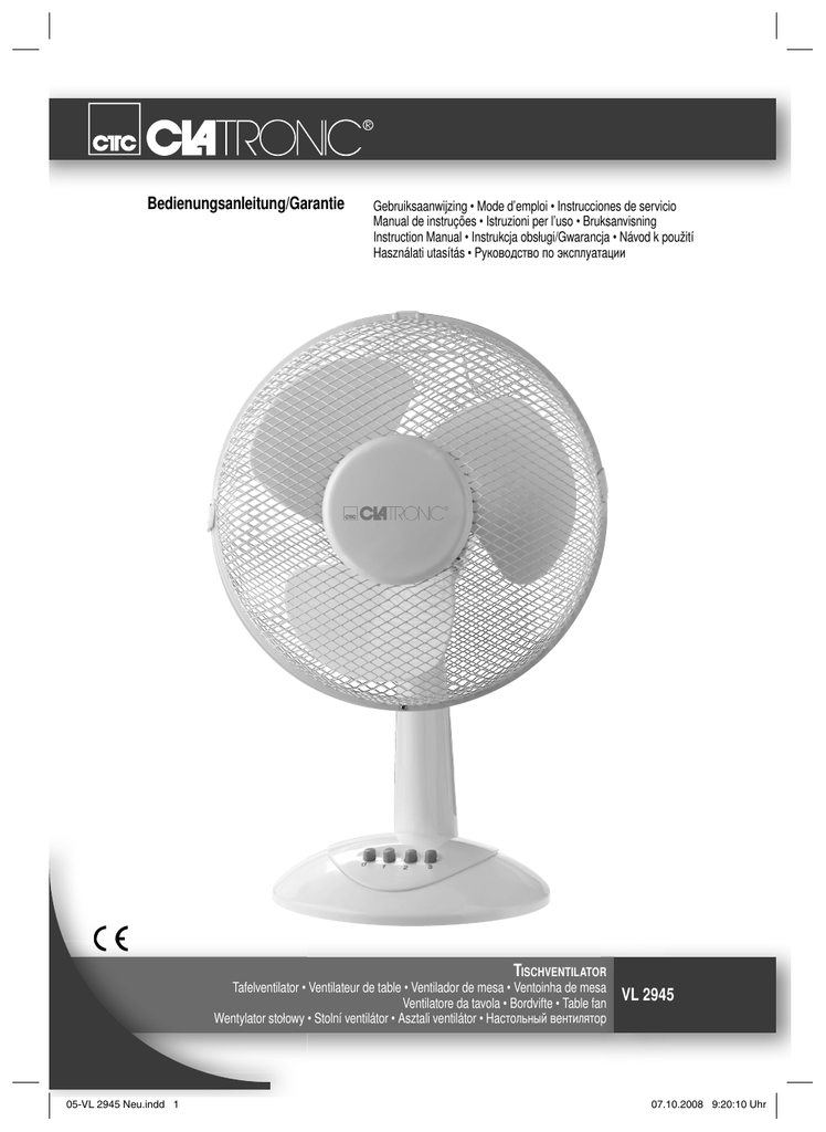 Bedienungsanleitung/Garantie Gebruiksaanwijzing • Mode d’emploi • Instrucciones de servicio Manual de instruções • Istruzioni per l’uso • Bruksanvisning Instruction Manual • Instrukcja obsługi/Gwarancja • Návod k použití Használati utasítás • Руководство по эксплуатации TISCHVENTILATORR Tafelventilator • Ventilateur de table • Ventilador de mesa • Ventoinha de mesaa Ventilatore da tavola • Bordvifte • Table fann Wentylator stołowy • Stolní ventilátor • Asztali ventilátor • Настольный вентиляторр 05-VL 2945 Neu.indd 1 VL 2945 07.10.2008 9:20:10 Uhr Oversikt over betjeningselementene............................ Side 3 Bruksanvisning ............................................................. Side 17 Tekniske data ............................................................... Side 18 ENGLISH NEDERLANDS Inhoud Overzicht van de bedieningselementen................... Pagina Gebruiksaanwijzing .................................................. Pagina Technische gegevens .............................................. Pagina 3 7 8 Contents Overview of the Components ..................................... Page 3 Instruction Manual ....................................................... Page 19 Technical Data............................................................. Page 20 JĘZYK POLSKI FRANÇAIS Sommaire Liste des différents éléments de commande .............. Page 3 Mode d’emploi ............................................................. Page 9 Données techniques ................................................... Page 10 Spis treści Przegląd elementów obłsugi .....................................Strona 3 Instrukcja obsługi ......................................................Strona 21 Dane techniczne .......................................................Strona 22 Gwarancja .................................................................Strona 22 ESPAÑOL ČESKY Indice Obsah Indicación de los elementos de manejo................... Página 3 Instrucciones de servicio.......................................... Página 11 Datos técnicos.......................................................... Página 12 Přehled ovládacích prvků..........................................Strana 3 Návod k použití..........................................................Strana 24 Technické údaje ........................................................Strana 25 PORTUGUÊS MAGYARUL Índice Tartalom Descrição dos elementos......................................... Página 3 Manual de instruções ............................................... Página 13 Características técnicas ........................................... Página 14 A kezelőelemek áttekintése ........................................ Oldal 3 Használati utasítás ...................................................... Oldal 26 Műszaki adatok ........................................................... Oldal 27 ITALIANO РУССКИЙ Indice Содержание Elementi di comando ............................................... Pagina 3 Istruzioni per l’uso .................................................... Pagina 15 Dati tecnici ................................................................ Pagina 16 Обзор деталей прибора .............................................. стр. 3 Руководство по эксплуатации .................................... стр. 28 Технические данные ................................................... стр. 29 ITALIANO PORTUGUÊS ESPAÑOL FRANÇAIS NEDERLANDS DEUTSCH 3 4 5 5 NORSK Übersicht der Bedienelemente ................................... Seite Bedienungsanleitung .................................................. Seite Technische Daten ....................................................... Seite Garantiebedingungen ................................................. Seite JĘZYK POLSKI ENGLISH Innhold ČESKY Inhalt NORSK РУССКИЙ MAGYARUL DEUTSCH 2 05-VL 2945 Neu.indd 2 07.10.2008 9:20:17 Uhr Übersicht der Einzelteile Overzicht van de onderdelen • Description des différentes parties de l’appareil • Indicación de los componentes Elementos do aparelho • Elenco dei pezzi • Oversikt over enkeltdelene Overview of the components • Przegląd poszczególnych części Přehled jednotlivých součástí • Az alkatrészek áttekintése • Обзор деталей прибора 3 05-VL 2945 Neu.indd 3 07.10.2008 9:20:18 Uhr DEUTSCH Allgemeine Sicherheitshinweise Lesen Sie vor Inbetriebnahme dieses Gerätes die Bedienungsanleitung sehr sorgfältig durch und bewahren Sie diese inkl. Garantieschein, Kassenbon und nach Möglichkeit den Karton mit Innenverpackung gut auf. Falls Sie das Gerät an Dritte weitergeben, geben Sie auch die Bedienungsanleitung mit. • Benutzen Sie das Gerät ausschließlich für den privaten und den dafür vorgesehenen Zweck. Dieses Gerät ist nicht für den gewerblichen Gebrauch bestimmt. Benutzen Sie es nicht im Freien. Halten Sie es vor Hitze, direkter Sonneneinstrahlung, Feuchtigkeit (auf keinen Fall in Flüssigkeiten tauchen) und scharfen Kanten fern. Benutzen Sie das Gerät nicht mit feuchten Händen. Bei feucht oder nass gewordenem Gerät sofort den Netzstecker ziehen. Schalten Sie das Gerät aus und ziehen Sie immer den Stecker aus der Steckdose (ziehen Sie am Stecker, nicht am Kabel) wenn Sie das Gerät nicht benutzen, Zubehörteile anbringen, zur Reinigung oder bei Störung. Betreiben Sie das Gerät nicht unbeaufsichtigt. Sollten Sie den Raum verlassen, schalten Sie das Gerät immer aus. Ziehen Sie den Stecker aus der Steckdose. Prüfen Sie Gerät und Kabel regelmäßig auf Schäden. Ein beschädigtes Gerät bitte nicht in Betrieb nehmen. Reparieren Sie das Gerät nicht selbst, sondern suchen Sie bitte einen autorisierten Fachmann auf. Um Gefährdungen zu vermeiden, ein defektes Netzka