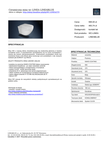 Ceramiczna misa wc LINEA LINEABLUE Adres w sklepie: http://sklep.lineablue.pl/pl/p/WC-LINEA/370 Cena: 595.00 zł Cena netto: 483,74 zł Dostępność: kontakt tel Kod produktu: WC-LINEA Producent: LINEABLUE SPECYFIKACJA Misy WC z naszej oferty charakteryzują się znakomitą jakością w bardzo rozsądnej cenie. Z powodzeniem sprzedawane są na rynku europejskim i cieszą się dużym zainteresowaniem. Znakomitym przykładem może być niemiecka firma LUX-AQUA która konkuruje w/w produktami z tak znanymi markami jak DURAVIT czy ROCA. SPECYFIKACJA TECHNICZNA Materiał ceramika Odpływ Poziomy ZALETY PRODUKTU ORAZ JAKOŚĆ USŁUGI Powłoka NANO-COATING • powłoka na ceramice NANO-COATING (łatwe czyszczenie) • spłukiwanie kropelkowe - po całym obwodzie ceramiki • deska wolnoopadająca z konglomeratu w komplecie • system CLICK - szybki demontaż deski • prawdziwa 24 m. gwarancja oraz serwis pogwarancyjny • odbiór osobisty po wcześniejszym kontakcie telefonicznym • realne zdjęcia ceramiki !!! TO NIE SĄ WIZUALIZACJE !!! • faktura VAT Długość [mm] 550 Szerokość [mm] 370 Wysokość [mm] 370 Kolor Biały Sposób montażu Wisząca Kształt Owalne Instalacja Stelaż typu GEBERIT Rozstaw otworów 180 mm Spłukiwanie Kanałowe Typ deski WOLNOOPADAJĄCA Tworzywo deski KONGLOMERAT Mocowanie deski System CLICK Misa WC pasuje do wszystkich stelaży podtynkowych sprzedawanych na polskim rynku. Informacje na temat: • kosztów i wysyłki towaru: http://sklep.lineablue.pl/pl/i/Wysylka-i-transport/8 • czasu realizacji zamówień: http://sklep.lineablue.pl/pl/i/Dostepnosc-produktow/7 LINEABLUE s.c., ul. Zabraniecka 82, 03-787 Warszawa tel.: 22 425-93-00, 504 81 81 73; fax: 022 205 04 90; e-mail: [email protected] (Firma czynna jest pon/pt w godz. 8.30-16.00.) Lineablue © 2017. Wszystkie prawa zastrzeżone.