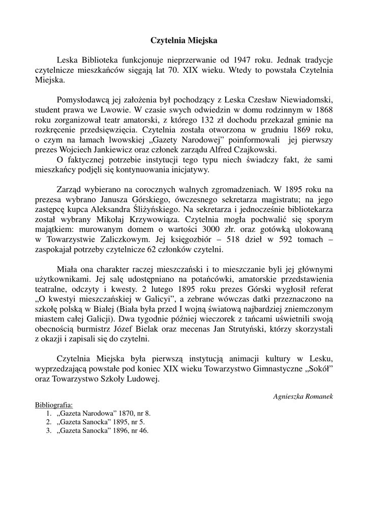 Czytelnia Miejska Leska Biblioteka funkcjonuje nieprzerwanie od 1947 roku. Jednak tradycje czytelnicze mieszkańców sięgają lat 70. XIX wieku. Wtedy to powstała Czytelnia Miejska. Pomysłodawcą jej założenia był pochodzący z Leska Czesław Niewiadomski, student prawa we Lwowie. W czasie swych odwiedzin w domu rodzinnym w 1868 roku zorganizował teatr amatorski, z którego 132 zł dochodu przekazał gminie na rozkręcenie przedsięwzięcia. Czytelnia została otworzona w grudniu 1869 roku, o czym na łamach lwowskiej „Gazety Narodowej” poinformowali jej pierwszy prezes Wojciech Jankiewicz oraz członek zarządu Alfred Czajkowski. O faktycznej potrzebie instytucji tego typu niech świadczy fakt, że sami mieszkańcy podjęli się kontynuowania inicjatywy. Zarząd wybierano na corocznych walnych zgromadzeniach. W 1895 roku na prezesa wybrano Janusza Górskiego, ówczesnego sekretarza magistratu; na jego zastępcę kupca Aleksandra Śliżyńskiego. Na sekretarza i jednocześnie bibliotekarza został wybrany Mikołaj Krzywowiąza. Czytelnia mogła pochwalić się sporym majątkiem: murowanym domem o wartości 3000 złr. oraz gotówką ulokowaną w Towarzystwie Zaliczkowym. Jej księgozbiór – 518 dzieł w 592 tomach – zaspokajał potrzeby czytelnicze 62 członków czytelni. Miała ona charakter raczej mieszczański i to mieszczanie byli jej głównymi użytkownikami. Jej salę udostępniano na potańcówki, amatorskie przedstawienia teatralne, odczyty i kwesty. 2 lutego 1895 roku prezes Górski wygłosił referat „O kwestyi mieszczańskiej w Galicyi”, a zebrane wówczas datki przeznaczono na szkołę polską w Białej (Biała była przed I wojną światową najbardziej zniemczonym miastem całej Galicji). Dwa tygodnie później wieczorek z tańcami uświetnili swoją obecnością burmistrz Józef Bielak oraz mecenas Jan Strutyński, którzy skorzystali z okazji i zapisali się do czytelni. Czytelnia Miejska była pierwszą instytucją animacji kultury w Lesku, wyprzedzającą powstałe pod koniec XIX wieku Towarzystwo Gimnastyczne „Sokół” oraz Towarzystwo Szkoły Ludowej. Agnieszka Romanek Bibliografia: 1. „Gazeta Narodowa” 1870, nr 8. 2. „Gazeta Sanocka” 1895, nr 5. 3. „Gazeta Sanocka” 1896, nr 46.