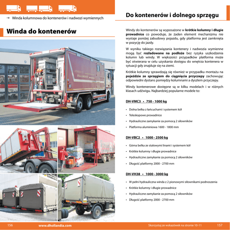 Winda kolumnowa do kontenerów i nadwozi wymiennych Winda do kontenerów Do kontenerów i dolnego sprzęgu Windy do kontenerów są wyposażone w krótkie kolumny i długie prowadnice co powoduje, że żaden element mechanizmu nie wystaje poniżej zabudowy pojazdu, gdy platforma jest zamknięta w pozycję do jazdy. W wyniku takiego rozwiązania kontenery i nadwozia wymienne mogą być rozładowane na podłoże bez ryzyka uszkodzenia kolumn lub windy. W większości przypadków platforma może być otwierana w celu uzyskania dostępu do wnętrza kontenera w sytuacji gdy znajduje się na ziemi. Krótkie kolumny sprawdzają się również w przypadku montażu na pojeździe ze sprzęgiem do ciągnięcia przyczepy zachowując odpowiedni dystans pomiędzy kolumnami a dyszlem przyczepy. Windy kontenerowe dostępne są w kilku modelach i w różnych klasach udźwigu. Najbardziej popularne modele to: DH-VMC3 • 750 - 1000 kg • Dolna belka z łańcuchami i systemem kół • Teleskopowe prowadnice • Hydrauliczne zamykanie za pomocą 2 siłowników • Platforma aluminiowa 1600 - 1800 mm DH-VBC2 • 1000 - 2500 kg • Górna belka ze stalowymi linami i systemem kół • Krótkie kolumny i długie prowadnice • Hydrauliczne zamykanie za pomocą 2 siłowników • Długość platformy 2000 - 2700 mm DH-VH38 • 1000 - 3000 kg • W pełni hydrauliczna winda z 2 pionowymi siłownikami podnoszenia • Krótkie kolumny i długie prowadnice • Hydrauliczne zamykanie za pomocą 2 siłowników • Długość platformy 2000 - 2700 mm 156 www.dhollandia.com Skorzystaj ze wskazówek na stronie 10-11 157