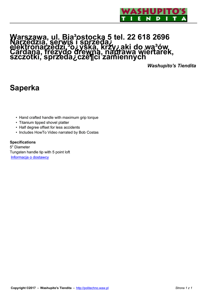 Warszawa, ul. Bia³ostocka 5 tel. 22 618 2696 Narzêdzia, serwis i sprzeda¿ elektronarzêdzi,³o¿yska, krzy¿aki do wa³ów Cardana, frezydo drewna, naprawa wiertarek, szczotki, sprzeda¿czê¶ci zamiennych Washupito's Tiendita Saperka • • • • Hand crafted handle with maximum grip torque Titanium tipped shovel platter Half degree offset for less accidents Includes HowTo Video narrated by Bob Costas Specifications 5" Diameter Tungsten handle tip with 5 point loft Informacja o dostawcy Copyright ©2017 - Washupito's Tiendita - http://politechno.waw.pl Strona 1 z 1