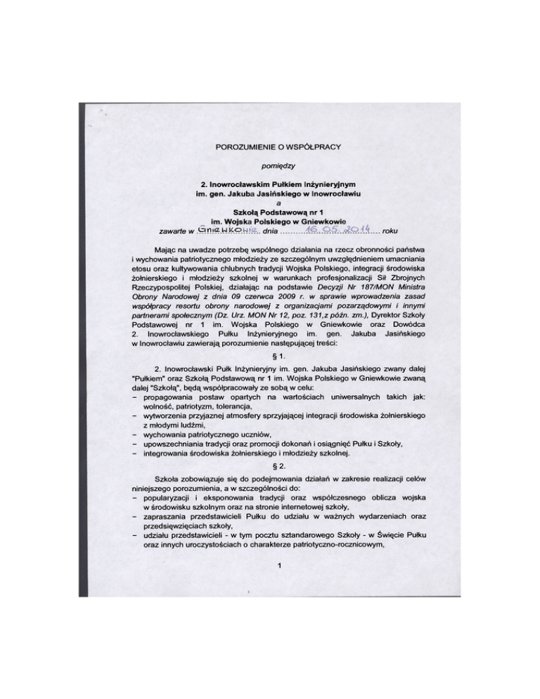 POROZUMIENIE O WSPÓŁPRACY pomiędzy 2. Inowrocławskim Pułkiem Inżynieryjnym im. gen. Jakuba Jasińskiego w Inowrocławiu a Szkołą Podstawową nr 1 im. Wojska Polskiego w Gniewkowie zawarte w W)dnia roku Mając na uwadze potrzebę wspólnego działania na rzecz obronności państwa i wychowania patriotycznego młodzieży ze szczególnym uwzględnieniem umacniania etosu oraz kultywowania chlubnych tradycji Wojska Polskiego, integracji środowiska żołnierskiego i młodzieży szkolnej w warunkach profesjonalizacji Sił Zbrojnych Rzeczypospolitej Polskiej, działając na podstawie Decyzji Nr 187/MON Ministra Obrony Narodowej z dnia 09 czerwca 2009 r. w sprawie wprowadzenia zasad współpracy resortu obrony narodowej z organizacjami pozarządowymi i innymi partnerami społecznym (Dz. Urz. MON Nr 12, poz. 131,z późn. zm.), Dyrektor Szkoły Podstawowej nr 1 im. Wojska Polskiego w Gniewkowie oraz Dowódca 2. Inowrocławskiego Pułku Inżynieryjnego im. gen. Jakuba Jasińskiego w Inowrocławiu zawierają porozumienie następującej treści: §1. 2. Inowrocławski Pułk Inżynieryjny im. gen. Jakuba Jasińskiego zwany dalej "Pułkiem" oraz Szkołą Podstawową nr 1 im. Wojska Polskiego w Gniewkowie zwaną dalej "Szkołą", będą współpracowały ze sobą w celu: - propagowania postaw opartych na wartościach uniwersalnych takich jak: wolność, patriotyzm, tolerancja, - wytworzenia przyjaznej atmosfery sprzyjającej integracji środowiska żołnierskiego z młodymi ludźmi, - wychowania patriotycznego uczniów, - upowszechniania tradycji oraz promocji dokonań i osiągnięć Pułku i Szkoły, - integrowania środowiska żołnierskiego i młodzieży szkolnej. §2. Szkoła zobowiązuje się do podejmowania działań w zakresie realizacji celów niniejszego porozumienia, a w szczególności do: - popularyzacji i eksponowania tradycji oraz współczesnego oblicza wojska w środowisku szkolnym oraz na stronie internetowej szkoły, - zapraszania przedstawicieli Pułku do udziału w ważnych wydarzeniach oraz przedsięwzięciach szkoły, - udziału przedstawicieli - w tym pocztu sztandarowego Szkoły - w Święcie Pułku oraz innych uroczystościach o charakterze patriotyczno-rocznicowym, - organizacji wspólnych przedsięwzięć kulturalno-oświatowych rekreacyjnych, wymiany doświadczeń z zakresu wychowania i edukacji. i sportowo- §3. Pułk zobowiązuje się do podejmowania działań w zakresie realizacji celów niniejszego porozumienia, w miarę posiadanych możliwości, między innymi przez: - wsparcie merytoryczne i logistyczne dla przedsięwzięć Szkoły na podstawie rocznego planu współpracy, - propagowania wśród uczniów służby wojskowej, - zapraszania kadry dydaktycznej i młodzieży szkoły do udziału w ważnych wydarzeniach rocznicowo-historycznych, - udziału przedstawicieli jednostki wojskowej w ważnych uroczystościach szkolnych, - współorganizowania przedsięwzięć kulturalno-oświatowych i sportowo rekreacyjnych; - wymiany doświadczeń z zakresu wychowania i edukacji. §4. Szczegółowy zakres i formy wsparcia udzielanego przez Pułk Szkole będą określane w „Rocznym Planie Współpracy Jednostki Wojskowej Nr 1523 z organizacjami pozarządowymi i innymi partnerami społecznymi" na podstawie wniosków składanych przez szkołę do Dowódcy Pułku poprzez Szefa Sekcji Wychowawczej. §5. Szkoła do dnia 10 września składa do Pułku wnioski do Planu Współpracy na następny rok kalendarzowy. §6. Szkoła będzie przekazywała do dnia 24 stycznia każdego roku kalendarzowego do Pułku informację o realizacji porozumienia w roku poprzednim w celu przeprowadzenia oceny jej przebiegu i wyników współpracy. §7. Strony zobowiązują się do wzajemnego informowania się o zdarzeniach i okolicznościach istotnych ze względu na przedmiot i zakres porozumienia. §8. Wzajemne przedsięwzięcia Szkoła i Pułk wykonywać będą z należytą starannością wiedzą i z zachowaniem szczególnych środków bezpieczeństwa. §9. Wejścia uczniów i nauczycieli szkoły na teren Pułku odbywać się będą w grupach zorganizowanych pod kierownictwem nauczyciela (opiekuna), na podstawie wcześniej przedstawionego uczestniczących w przedsięwzięciu. przez Dyrektora wykazu osób §10. Do koordynacji współpracy i realizacji niniejszego porozumienia wyznacza się następujące osoby: - ze strony Pułku - Szef Sekcji Wychowawczej 2pinż; - ze strony Szkoły - upoważniony przez dyrektora szkoły nauczyciel. §11. Porozumienie nie powoduje dodatkowych wydatków z budżetu JW i resortu obrony narodowej. §12. Dowódca Pułku nie ponosi odpowiedzialności cywilnej i innej za zdarzenia, które wystąpią podczas lub w związku z realizacją niniejszego porozumienia. §13. Wszelkie sprawy sporne i konfliktowe, mogące wyniknąć w związku z wykonywaniem postanowień porozumienia, strony będą rozstrzygały w drodze negocjacji, dążąc do ich polubownego załatwienia i zakończenia. §14. Porozumienie zostaje zawarte na czas nieokreślony, z możliwością jego rozwiązania przez każdą ze stron z trzymiesięcznym okresem wypowiedzenia, ze skutkiem na koniec miesiąca kalendarzowego lub w trybie natychmiastowym, bez wypowiedzenia - w przypadku rażącego naruszenia przepisów porozumienia lub wystąpienia okoliczności, o których mowa w § 15 ust. 1, Decyzji Nr 187/MON Ministra Obrony Narodowej z dnia 09 czerwca 2009 r. w sprawie wprowadzenia zasad współpracy resortu obrony narodowej z organizacjami pozarządowymi i innymi partnerami społecznym (Dz. Urz. MON Nr 12, poz. 131, z późn. zm.). §15. 1. W sprawach nieuregulowanych w porozumieniu zastosowanie mają postanowienia Ustawy z dnia 23 kwietnia 1964 r. - Kodeks Cywilny (Dz. U. Nr 16, poz. 93 z późn. zm.) oraz Decyzji Nr 187/MON Ministra Obrony Narodowej z dnia 9 czerwca 2009 r. w sprawie wprowadzenia zasad współpracy resortu obrony narodowej z organizacjami pozarządowymi i innymi partnerami społecznymi (Dz. Urz.