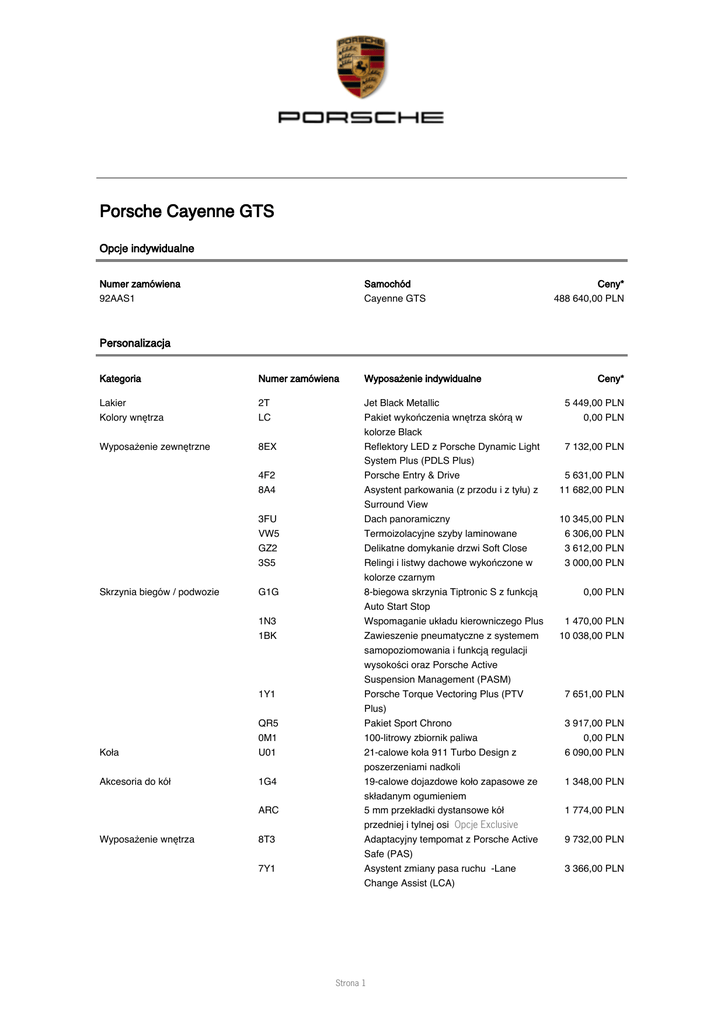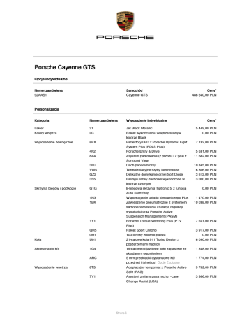 Porsche Cayenne GTS Opcje indywidualne Numer zamówiena Samochód 92AAS1 Cayenne GTS Ceny* 488 640,00 PLN Personalizacja Kategoria Numer zamówiena Wyposażenie indywidualne Lakier Kolory wnętrza 2T LC Wyposażenie zewnętrzne 8EX Jet Black Metallic Pakiet wykończenia wnętrza skórą w kolorze Black Reflektory LED z Porsche Dynamic Light System Plus (PDLS Plus) Porsche Entry & Drive Asystent parkowania (z przodu i z tyłu) z Surround View Dach panoramiczny Termoizolacyjne szyby laminowane Delikatne domykanie drzwi Soft Close Relingi i listwy dachowe wykończone w kolorze czarnym 8-biegowa skrzynia Tiptronic S z funkcją Auto Start Stop Wspomaganie układu kierowniczego Plus 4F2 8A4 3FU VW5 GZ2 3S5 Skrzynia biegów / podwozie G1G 1N3 1BK Zawieszenie pneumatyczne z systemem samopoziomowania i funkcją regulacji wysokości oraz Porsche Active Ceny* 5 449,00 PLN 0,00 PLN 7 132,00 PLN 5 631,00 PLN 11 682,00 PLN 10 345,00 PLN 6 306,00 PLN 3 612,00 PLN 3 000,00 PLN 0,00 PLN 1 470,00 PLN 10 038,00 PLN Suspension Management (PASM) 1Y1 Koła Akcesoria do kół Wyposażenie wnętrza 7 651,00 PLN QR5 0M1 Porsche Torque Vectoring Plus (PTV Plus) Pakiet Sport Chrono 100-litrowy zbiornik paliwa U01 21-calowe koła 911 Turbo Design z 6 090,00 PLN 1G4 poszerzeniami nadkoli 19-calowe dojazdowe koło zapasowe ze składanym ogumieniem 1 348,00 PLN 3 917,00 PLN 0,00 PLN ARC 5 mm przekładki dystansowe kół przedniej i tylnej osi Opcje Exclusive 1 774,00 PLN 8T3 Adaptacyjny tempomat z Porsche Active Safe (PAS) Asystent zmiany pasa ruchu -Lane 9 732,00 PLN 7Y1 Change Assist (LCA) Strona 1 3 366,00 PLN Personalizacja (dalej) Kategoria Numer zamówiena Wyposażenie indywidualne Ceny* 9Q6 System rozpoznawania ograniczenia 1 958,00 PLN PA2 prędkości Automatycznie przyciemniane lusterka 1 836,00 PLN zewnętrzne i wewnętrzne w połączeniu z pakietem pamięci PP6 Wnętrze: skóra VC1 Pakiet oświetlenia Komfort w połączeniu z pakietem pamięci HomeLink® (zdalne otwieranie drzwi PE6 garażowych) Adaptacyjne sportowe fotele z 18- 9AH 4A4 4D3 0TD 4X4 6A7 AXK AXF AXH Wnętrze: włókno węglowe 5MH 2FX Wnętrze: aluminium 6Q7 Audio / komunikacja 7T1 9W1 9VL QU0 Cena całkowita 1 470,00 PLN 9 732,00 PLN zakresową regulacją i pakietem pamięci 4-strefowy układ klimatyzacji Podgrzewane fotele (z przodu i z tyłu) Wentylowane fotele (z przodu) Dywaniki Boczne poduszki powietrzne (z tyłu) Gaśnica Pakiet wnętrza ze środkową częścią foteli ze skóry w kontrastowym kolorze Opcje Exclusive Wybrany kolor: Garnet Red Pakiet wnętrza z dekoracyjnymi przeszyciami w kolorze kontrastowym Opcje Exclusive Wybrany kolor: Garnet Red Pakiet wnętrza z dekoracyjnymi przeszyciami na fotelach w kolorze kontrastowym Opcje Exclusive Wybrany kolor: Garnet Red Pakiet wnętrza z włókna węglowego w połączeniu z dźwignią zmiany biegów Tiptronic S z aluminium Ogrzewana kierownica wielofunkcyjna wykończona włóknem węglowym Dźwignia zmiany biegów Tiptronic S z aluminium Opcje Exclusive Porsche Communication Management (PCM) Z modułem nawigacji Moduł telefoniczny BOSE® Surround Sound System Radio cyfrowe 1 592,00 PLN 4 223,00 PLN 4 469,00 PLN 4 774,00 PLN 919,00 PLN 2 112,00 PLN 766,00 PLN 11 568,00 PLN 7 927,00 PLN 7 285,00 PLN 4 407,00 PLN 3 091,00 PLN 2 356,00 PLN 17 445,00 PLN 4 041,00 PLN 6 947,00 PLN 2 449,00 PLN 688 550,00 PLN 619 695,00 PLN OFERTA SPECJALNA: *ceny zawierają 23 % VAT i nie stanowią oferty w rozumieniu art.71 Kodeksu cywilnego. Strona 2 Twój Kod Porsche: http://www.porsche-code.com/PGD8CD43 Ważne informacje Przedstawione w konfiguratorze modele samochodów prezentują wyposażenie dostępne na terenie Rzeczypospolitej Polskiej. Dostępność modeli i opcji może się różnić na poszczególnych rynkach z uwagi na lokalne przepisy i ograniczenia. Zawartość domówionego pakietu lub opcji może zmienić elementy wyposażenia standardowego – w niektorych przypadkach bezzwrotnie zastępując elementy wyposażenia standardowego. W celu uzyskania szczegółowych informacji w tym zakresie prosimy o kontakt z Porsche Centrum lub z wyłącznym przedstawicielem Dr. Ing, h.c.F. Porsche AG w Polsce – Volkswagen Group Polska Sp. z o.o. z siedzibą w Poznaniu, ul. Krańcowa 44, tel. 61 62 73 000. Dr. Ing, h.c.F. Porsche AG zastrzega sobie prawo do zmian designu, wyposażenia, kolorów, jak i specyfikacji samochodów. Kolory i materiały rzeczywiste mogą się różnić od kolorów i materiałów przedstawionych na zdjęciach. Zastrzega się prawo do błędów i pominięć w Konfiguratorze Porsche oraz na www.porsche.pl . Niniejsza konfiguracja nie stanowi oferty w rozumieniu art. 71 Kodeksu cywilnego, ma jedynie charakter poglądowy. Ceny i charakterystyka muszą być potwierdzone w wybranym Porsche Centrum. Wszystkie produkowane obecnie samochody Porsche są wykonywane z materiałów spełniających pod kątem możliwości odzysku i recyklingu wymagania określone w normie ISO 22628 i uzyskały w tym zakresie europejskie świadectwa homologacji zgodne z dyrektywą 2005/64/WE. Volkswagen Group Polska Sp. z o.o. zapewnia wszystkim użytkownikom samochodów sieć odbioru pojazdów po zakończeniu ich eksploatacji zgodną z wymaganiami ustawy z 25 stycznia 2005 r. o recyklingu pojazdów wycofanych z eksploatacji (Dz. U. Nr 25, poz. 202, z późn. zm.). Więcej informacji dotyczących ekologii znajdą państwo na stronach: www.porsche.pl. Pomiary zużycia paliwa oraz emisji CO₂ zostały wykonane zgodnie z rozporządzeniem WE 715/2007*692/2008A, 715/2007*566/2011F lub 715/2007*566/2011A. Strona 3