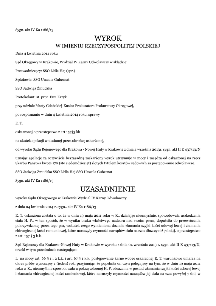 Sygn. akt IV Ka 1186/13 WYROK W IMIENIU RZECZYPOSPOLITEJ POLSKIEJ Dnia 4 kwietnia 2014 roku Sąd Okręgowy w Krakowie, Wydział IV Karny Odwoławczy w składzie: Przewodniczący: SSO Lidia Haj (spr.) Sędziowie: SSO Urszula Gubernat SSO Jadwiga Żmudzka Protokolant: st. prot. Ewa Krzyk przy udziale Marty Gdańskiej-Kusior Prokuratora Prokuratury Okręgowej, po rozpoznaniu w dniu 4 kwietnia 2014 roku, sprawy E. T. oskarżonej o przestępstwo z art 157§3 kk na skutek apelacji wniesionej przez obrońcę oskarżonej, od wyroku Sądu Rejonowego dla Krakowa - Nowej Huty w Krakowie z dnia 4 września 2013r. sygn. akt II K 437/13/N uznając apelację za oczywiście bezzasadną zaskarżony wyrok utrzymuje w mocy i zasądza od oskarżonej na rzecz Skarbu Państwa kwotę 170 (sto siedemdziesiąt) złotych tytułem kosztów sądowych za postępowanie odwoławcze. SSO Jadwiga Żmudzka SSO Lidia Haj SSO Urszula Gubernat Sygn. akt IV Ka 1186/13 UZASADNIENIE wyroku Sądu Okręgowego w Krakowie Wydział IV Karny Odwoławczy z dnia 04 kwietnia 2014 r. sygn.. akt IV Ka 1186/13 E. T. oskarżona została o to, że w dniu 19 maja 2011 roku w K., działając nieumyślnie, spowodowała uszkodzenia ciała H. P., w ten sposób, że w wyniku braku właściwego nadzoru nad swoim psem, dopuściła do przewrócenia pokrzywdzonej przez tego psa, wskutek czego wymieniona doznała złamania szyjki kości udowej lewej i złamania chirurgicznej kości ramieniowej, które naruszyły czynności narządów ciała na czas dłuższy niż 7 dni,tj. o przestępstwo z art. 157 § 3 k.k. Sąd Rejonowy dla Krakowa-Nowej Huty w Krakowie w wyroku z dnia 04 września 2013 r. sygn. akt II K 437/13/N, orzekł w tym przedmiocie następująco: I. na mocy art. 66 § 1 i 2 k.k. i art. 67 § 1 k.k. postępowanie karne wobec oskarżonej E. T. warunkowo umarza na okres próby wynoszący 1 (jeden) rok, przyjmując, że popełniła on czyn polegający na tym, że w dniu 19 maja 2011 roku w K., nieumyślnie spowodowała u pokrzywdzonej H. P. obrażenia w postaci złamania szyjki kości udowej lewej i złamania chirurgicznej kości ramieniowej, które naruszyły czynności narządów jej ciała na czas powyżej 7 dni, w ten sposób, że jako właścicielka psa nie zachowała ostrożności przy wyprowadzaniu psa na spacer i spuszczając go ze smyczy nienależycie sprawowała nad nim nadzór, przez co dopuściła do tego, że pies skoczył na idącą chodnikiem pokrzywdzoną H. P., w wyniku czego pokrzywdzona się przewróciła, doznając opisanych wyżej obrażeń ciała obrażenia ciała, mimo iż oskarżona popełnienie tego czynu mogła przewidzieć, a realizujący znamiona występku z art. 157 § 3 w zw. z § 1 k.k.; II.na mocy art. 67 § 3 k.k. zasądza od oskarżonej E. T. na rzecz pokrzywdzonej H. P. kwotę 261,34 (dwieście sześćdziesiąt jeden 34/100) złotych tytułem odszkodowania oraz kwotę 5.000,00 (pięć tysięcy) złotych tytułem zadośćuczynienia; III.na mocy art. 29 ust. 1 ustawy z dnia 26 maja 1982 roku Prawo o Adwokaturze (Dz. U. nr 16 poz. 124 z 1982 roku ze zm.) i § 14 ust. 2 pkt 3 i 4 w zw. z ust. 7, w zw. § 2 ust. 3, § 16 i § 20 Rozporządzenia Ministra Sprawiedliwości z dnia 28 września 2002 roku (Dz. U. nr 163 poz. 1348 z 2002 roku) w sprawie opłat za czynności adwokackie oraz ponoszenia przez Skarb Państwa kosztów nieopłaconej pomocy prawnej udzielonej z urzędu zasądza od Skarbu Państwa na rzecz adw. M. G. kwotę 1.033,20 (jeden tysiąc trzydzieści trzy 20/100) złote, w tym 193,20 (sto dziewięćdziesiąt trzy 20/100) złote jako podatek VAT, a to tytułem zwrotu kosztów nieopłaconej pomocy prawnej udzielonej z urzędu oskarżycielce posiłkowej H. P.; IV.na zasadzie art. 629 k.p.k. w zw. z art. 627 k.p.k. oraz art. 7 ustawy z dnia 23 czerwca 1973 roku o opłatach w sprawach karnych (t. j. Dz. U. z 1983 r., nr 49, poz. 223 ze zm.) zasądza od oskarżonej E. T. na rzecz Skarbu Państwa koszty sądowe w kwocie 2.406,40 (dwa tysiące czterysta sześć 40/100) złotych, w tym 100,00 (sto) złotych tytułem opłaty oraz 2.306,40 (dwa tysiące trzysta sześć sześć 40/100) złotych tytułem wydatków. Apelację od wyroku wniósł obrońca oskarżonej, który zaskarżając powyższy wyrok w całości , zarzucił : 1.obrazę przepisów postępowania mogących mieć wpływ na treść orzeczenia, art. 4 k.p.k. i art. 7 k.p.k. w zw. z art. 410 k.p.k., poprzez dokonanie dowolnej a nie swobodnej oceny zebranego w sprawie materiału dowodowego bez uwzględnienia zasad prawidłowego rozumowania, co w konsekwencji doprowadziło do błędu w ustaleniach faktycznych przez nieobiektywne uznanie, że pies oskarżonej z impetem skoczył na pokrzywdzoną doprowadzając w konsekwencji do utraty równowagi przez pokrzywdzoną i jej przewrócenie na chodnik, pomimo braku w niniejszej sprawie w zgromadzonym materiale dowodowym wiarygodnych dowodów pozwalających poczynić takie ustalenia, a prawidłowa ocena zebranego materiału dowodowego, w tym w szczególności wyjaśnień oskarżonej, prowadzi do odmiennych wniosków, 2.obrazę przepisów postępowania mogących mieć wpływ na treść orzeczenia, art. 193 § 1 k.p.k. poprzez zaniechanie dopuszczenia z urzędu opinii biegłego z zakresu medycyny sądowej na okoliczność stwierdzenia z uwzględnieniem wiedzy z zakresu nauk medycznych jakie są normalne, typowe następstwa przewrócenia się osoby na chodnik, w szczególności czy takim normalnym, typowym następstwem jest złamanie szyjki kości udowej lewej i złamanie chirurgiczne kości ramieniowej, ponieważ wiedza taka wymaga wiadomości specjalnych z zakresu nauk medycznych oraz stanowi istotne znaczenie dla rozstrzygnięcia sprawy, 3.błąd w ustaleniu stanu faktycznego poprzez dowolne przyjęcie, że obrażenia jakie doznała pokrzywdzona w postaci złamanie szyjki kości udowej lewej i złamanie chirurgiczne kości ramieniowej stanowią typowe, normalne następstwa przewrócenia się na chodnik i obiektywnie