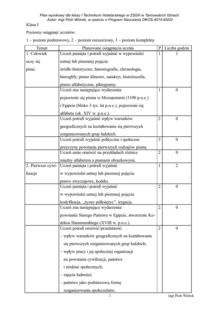 Plan wynikowy dla klasy I Technikum Hotelarskiego w ZSGH w Tarnowskich Górach. Autor: mgr Piotr Wiórek, w oparciu o Program Nauczania DKOS-4015-65/02 Klasa I Poziomy osiągnięć uczniów: 1 – poziom podstawowy, 2 – poziom rozszerzony, 3 – poziom kompletny Temat 1. Człowiek Planowane osiągnięcia ucznia Uczeń pamięta i potrafi wyjaśnić w wypowiedzi uczy się ustnej lub pisemnej pojęcia: pisać. źródło historyczne, historiografia, chronologia, P Liczba godzin 1 1 hieroglify, pismo klinowe, sanskryt, historiozofia, pismo alfabetyczne, piktogramy. Uczeń zna następujące wydarzenia: 1 0 2 0 zorganizowanych grup ludzkich. Uczeń potrafi wyjaśnić polityczne i społeczne 3 0 przyczyny powstania pierwszych rodzajów pisma. Uczeń umie omówić na przykładach różnice 2 0 1 2 2 0 2 0 2 0 pojawienie się pisma w Mezopotamii (3100 p.n.e.) i Egipcie (blisko 3 tys. lat p.n.e.), pojawienie się alfabetu (ok. XIV w. p.n.e.). Uczeń potrafi wyjaśnić wpływ warunków geograficznych na kształtowanie się pierwszych między alfabetem a pismami obrazkowymi. 2. Pierwsze cywi- Uczeń pamięta i potrafi wyjaśnić lizacje w wypowiedzi ustnej lub pisemnej pojęcia: prawo zwyczajowe, kodeks. Uczeń pamięta i potrafi wyjaśnić w wypowiedzi ustnej lub pisemnej pojęcia: kodyfikacja, „żyzny półksiężyc”, irygacja. Uczeń zna następujące wydarzenia: powstanie Starego Państwa w Egipcie, stworzenie Kodeksu Hammurabiego (XVIII w. p.n.e.). Uczeń potrafi omówić/przedstawić: – wpływ warunków geograficznych na kształtowanie się pierwszych zorganizowanych grup ludzkich; – wpływ pracy i jej społecznej organizacji na powstanie cywilizacji, państwa i struktur społecznych; – zajęcia ludności; – państwo jako podstawową formę zorganizowania społeczeństw. 1 mgr Piotr Wiórek Plan wynikowy dla klasy I Technikum Hotelarskiego w ZSGH w Tarnowskich Górach. Autor: mgr Piotr Wiórek, w oparciu o Program Nauczania DKOS-4015-65/02 Uczeń umie interpretować charakterystyczne 3 0 3 0 1 1 2 0 literatura, kanon. Uczeń umie interpretować charakterystyczne 2 0 dla epoki źródła historyczne (w tym ikonograficzne). Uczeń potrafi omówić/przedstawić osiągnięcia 2 0 3 0 dla epoki źródła historyczne (teksty staroegipskie, źródła ikonograficzne). Uczeń umie porównywać formy ustrojowe, systemy gospodarcze i prawne starożytnego Bliskiego Wschodu i dokonywać ich samodzielnej oceny. 3. Dziedzictwo Uczeń pamięta i potrafi wyjaśnić w wypowiedzi cywilizacji Bli- ustnej lub pisemnej pojęcia: skiego Wscho- hieroglify, pismo klinowe, sanskryt, du pismo alfabetyczne, piktogramy. Uczeń pamięta i potrafi wyjaśnić w wypowiedzi ustnej lub pisemnej pojęcia: cywilizacji Bliskiego Wschodu z dziedziny: matematyki, astronomii, medycyny, techniki, literatury, sztuki. Uczeń potrafi łączyć wiadomości zdobyte na zajęciach z historii, języka polskiego. Dokonuje samodzielnej oceny estetycznej źródeł historycznych i literackich. 2 mgr Piotr Wiórek Plan wynikowy dla klasy I Technikum Hotelarskiego w ZSGH w Tarnowskich Górach. Autor: mgr Piotr Wiórek, w oparciu o Program Nauczania DKOS-4015-65/02 4. Nomadzi stają Uczeń pamięta i potrafi wyjaśnić w wypowiedzi 1 2 2 0 1 0 rozpoczęcie spisywania Biblii (początek VII w. p.n.e.). panowanie Salomona w Izraelu (960–932 p.n.e.), 1 0 istnienie podzielonego królestwa Izraela i Judy Uczeń potrafi omówić/przedstawić: 2 0 3 0 3 0 się rolnikami – ustnej lub pisemnej pojęcia: dzieje Narodu nomada, rewolucja neolityczna, prawo zwyczajowe, Wybranego kodeks, dekalog, pismo alfabetyczne, politeizm, monoteizm, idea narodu wybranego, prorocy, Tora, Biblia, diaspora. Uczeń pamięta i potrafi wyjaśnić w wypowiedzi ustnej lub pisemnej pojęcia: bałwochwalstwo, religie profetyczne i tradycyjne. Uczeń zna następujące wydarzenia: pojawienie się Hebrajczyków w Palestynie (ok. 1250 p.n.e.), panowanie Dawida w Izraelu (1000–960 p.n.e.), deportacja ludności (721 p.n.e.), – zasady religii monoteistycznej (omówione na wybranych przykładach); – pozycję i znaczenie warstwy kapłańskiej w Izraelu; – wpływ religii na życie codzienne. Uczeń potrafi dostrzegać i umie omówić dynamikę procesów historycznych: – społecznych – podziały społeczne i prawa obowiązujące w Izraelu; – ustrojowych – zjawisko monarchii teokratycznej. Uczeń umie omówić wpływ religii na życie polityczne i społeczne społeczeństw starożytnych oraz potrafi odnajdywać judaistyczne wątki w kulturze europejskiej. Uczeń umie: – porównywać formy ustrojowe, religie świata starożytnego (monoteizm i politeizmy), systemy prawne (prawo Hammurabiego i prawo religijne), dorobek kulturowy; – wyjaśnić rolę wielkich indywidualności w historii 3 mgr Piotr Wiórek Plan wynikowy dla klasy I Technikum Hotelarskiego w ZSGH w Tarnowskich Górach. Autor: mgr Piotr Wiórek, w oparciu o Program Nauczania DKOS-4015-65/02 (Mojżesz, Dawid, Salomon). Uczeń umie interpretować charakterystyczne 2 0 5. Pod znakiem dla epoki źródła historyczne (fragmenty Biblii). Uczeń pamięta i potrafi wyjaśnić w wypowiedzi 1 1 swastyki ustnej lub pisemnej pojęcia: i pioruna – sanskryt, reinkarnacja, nirwana. 2 0 2 0 panowanie Cyrusa II Wielkiego (559–529 p.n.e.). Uczeń posiada wiadomości na temat działalności 2 0 Buddy (567–487 p.n.e.). Uczeń potrafi dostrzegać i umie omówić dynamikę 3 0 3 0 1 1 2 0 Indoeuropejczycy wkraczają na karty historii. Uczeń pamięta i potrafi wyjaśnić w wypowiedzi ustnej lub pisemnej pojęcia: Indoeuropejczycy, satrapa, swastyka. Uczeń zna następujące wydarzenia: ekspansja Ariów (XV w. p.n.e.), procesów historycznych: – społecznych – podziały kastowe obowiązujące w Indiach; – ustrojowych – zjawisko monarchii despotycznej w Persji. Uczeń potrafi samodzielnie ocenić rolę wybitnych jednostek w historii (Cyrus, Dariusz) i metody polityczne oparte na tolerancji 6. Rachuba cza- wobec 