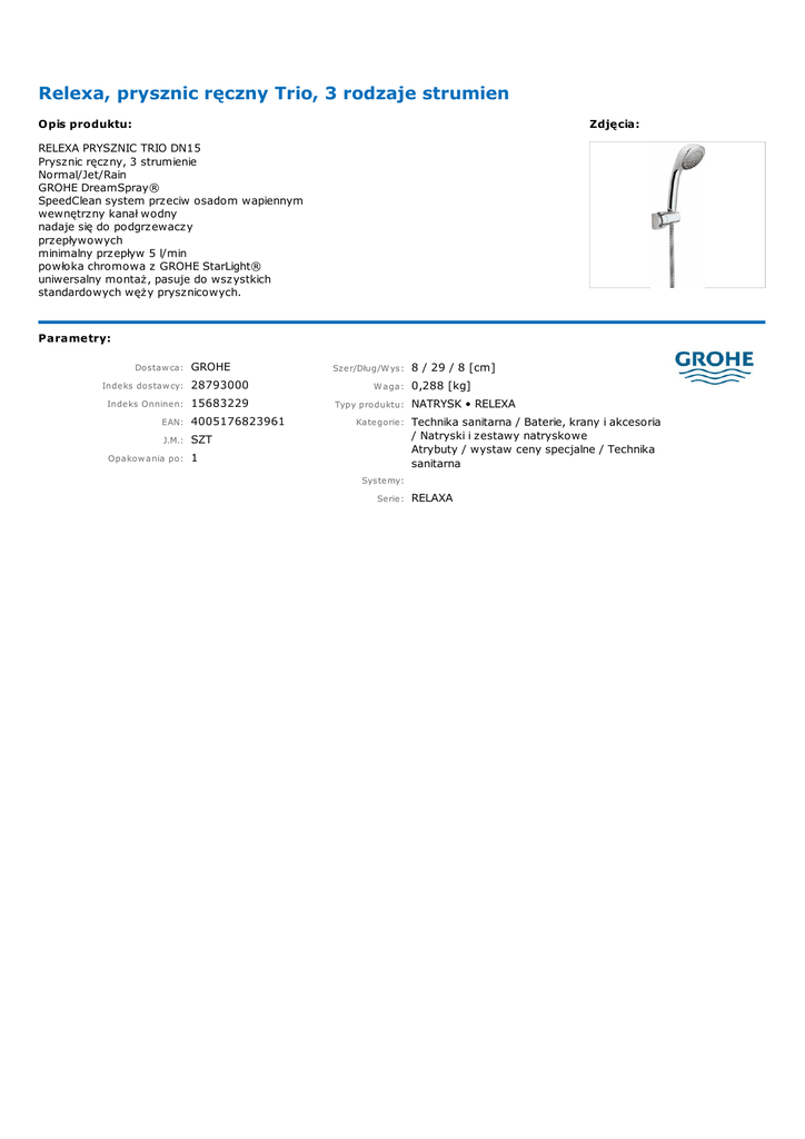 Relexa, prysznic ręczny Trio, 3 rodzaje strumien Opis produktu: Zdjęcia: RELEXA PRYSZNIC TRIO DN15 Prysznic ręczny, 3 strumienie Normal/Jet/Rain GROHE DreamSpray® SpeedClean system przeciw osadom wapiennym wewnętrzny kanał wodny nadaje się do podgrzewaczy przepływowych minimalny przepływ 5 l/min powłoka chromowa z GROHE StarLight® uniwersalny montaż, pasuje do wszystkich standardowych węży prysznicowych. Parametry: Dostaw ca: Indeks dostaw cy: Indeks Onninen: EAN: J.M.: Opakow ania po: GROHE 28793000 15683229 4005176823961 SZT 1 Szer/Dług/W ys: W aga: Typy produktu: Kategorie: 8 / 29 / 8 [cm] 0,288 [kg] NATRYSK • RELEXA Technika sanitarna / Baterie, krany i akcesoria / Natryski i zestawy natryskowe Atrybuty / wystaw ceny specjalne / Technika sanitarna Systemy: Serie: RELAXA