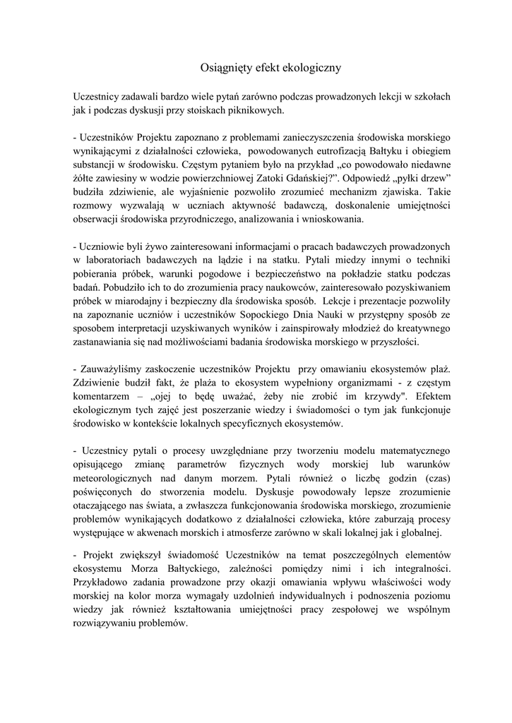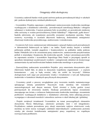 Osiągnięty efekt ekologiczny Uczestnicy zadawali bardzo wiele pytań zarówno podczas prowadzonych lekcji w szkołach jak i podczas dyskusji przy stoiskach piknikowych. - Uczestników Projektu zapoznano z problemami zanieczyszczenia środowiska morskiego wynikającymi z działalności człowieka, powodowanych eutrofizacją Bałtyku i obiegiem substancji w środowisku. Częstym pytaniem było na przykład „co powodowało niedawne żółte zawiesiny w wodzie powierzchniowej Zatoki Gdańskiej?”. Odpowiedź „pyłki drzew” budziła zdziwienie, ale wyjaśnienie pozwoliło zrozumieć mechanizm zjawiska. Takie rozmowy wyzwalają w uczniach aktywność badawczą, doskonalenie umiejętności obserwacji środowiska przyrodniczego, analizowania i wnioskowania. - Uczniowie byli żywo zainteresowani informacjami o pracach badawczych prowadzonych w laboratoriach badawczych na lądzie i na statku. Pytali miedzy innymi o techniki pobierania próbek, warunki pogodowe i bezpieczeństwo na pokładzie statku podczas badań. Pobudziło ich to do zrozumienia pracy naukowców, zainteresowało pozyskiwaniem próbek w miarodajny i bezpieczny dla środowiska sposób. Lekcje i prezentacje pozwoliły na zapoznanie uczniów i uczestników Sopockiego Dnia Nauki w przystępny sposób ze sposobem interpretacji uzyskiwanych wyników i zainspirowały młodzież do kreatywnego zastanawiania się nad możliwościami badania środowiska morskiego w przyszłości. - Zauważyliśmy zaskoczenie uczestników Projektu przy omawianiu ekosystemów plaż. Zdziwienie budził fakt, że plaża to ekosystem wypełniony organizmami - z częstym komentarzem – „ojej to będę uważać, żeby nie zrobić im krzywdy". Efektem ekologicznym tych zajęć jest poszerzanie wiedzy i świadomości o tym jak funkcjonuje środowisko w kontekście lokalnych specyficznych ekosystemów. - Uczestnicy pytali o procesy uwzględniane przy tworzeniu modelu matematycznego opisującego zmianę parametrów fizycznych wody morskiej lub warunków meteorologicznych nad danym morzem. Pytali również o liczbę godzin (czas) poświęconych do stworzenia modelu. Dyskusje powodowały lepsze zrozumienie otaczającego nas świata, a zwłaszcza funkcjonowania środowiska morskiego, zrozumienie problemów wynikających dodatkowo z działalności człowieka, które zaburzają procesy występujące w akwenach morskich i atmosferze zarówno w skali lokalnej jak i globalnej. - Projekt zwiększył świadomość Uczestników na temat poszczególnych elementów ekosystemu Morza Bałtyckiego, zależności pomiędzy nimi i ich integralności. Przykładowo zadania prowadzone przy okazji omawiania wpływu właściwości wody morskiej na kolor morza wymagały uzdolnień indywidualnych i podnoszenia poziomu wiedzy jak również kształtowania umiejętności pracy zespołowej we wspólnym rozwiązywaniu problemów.