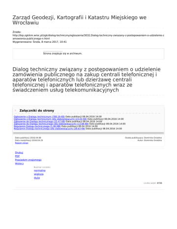 Zarząd Geodezji, Kartografii i Katastru Miejskiego we Wrocławiu Źródło: http://bip.zgkikm.wroc.pl/zgk/dialog-techniczny/ogloszenia/3032,Dialog-techniczny-zwiazany-z-postepowaniem-o-udzielenie-z amowienia-publicznego-n.html Wygenerowano: Środa, 8 marca 2017, 10:41 Strona znajduje się w archiwum. Dialog techniczny związany z postępowaniem o udzielenie zamówienia publicznego na zakup centrali telefonicznej i aparatów telefonicznych lub dzierżawę centrali telefonicznej i aparatów telefonicznych wraz ze świadczeniem usług telekomunikacyjnych Załączniki do strony Ogłoszenie o Dialogu technicznym (768.19 KB) Data publikacji 08.04.2016 14:00 Ogłoszenie o Dialogu technicznym (dla słabowidzących) (23.03 KB) Data publikacji 08.04.2016 14:00 Zgłoszenie do Dialogu technicznego (25.47 KB) Data publikacji 08.04.2016 14:00 Zgłoszenie do Dialogu technicznego (dla słabowidzących) (13.88 KB) Data publikacji 08.04.2016 14:00 Regulamin Dialogu technicznego (1.06 MB) Data publikacji 08.04.2016 14:00 Regulamin Dialogu technicznego (dla słabowidzących) (28.63 KB) Data publikacji 08.04.2016 14:00 Data publikacji 2016.04.08 Data modyfikacji 2016.04.25 Rejestr zmian Osoba publikująca: Dominika Grodzka Autor: Dominika Grodzka Drukuj PDF Powiadom znajomego Wstecz Rozmiar czcionki: normalna większa duża Liczba wejść: 6726