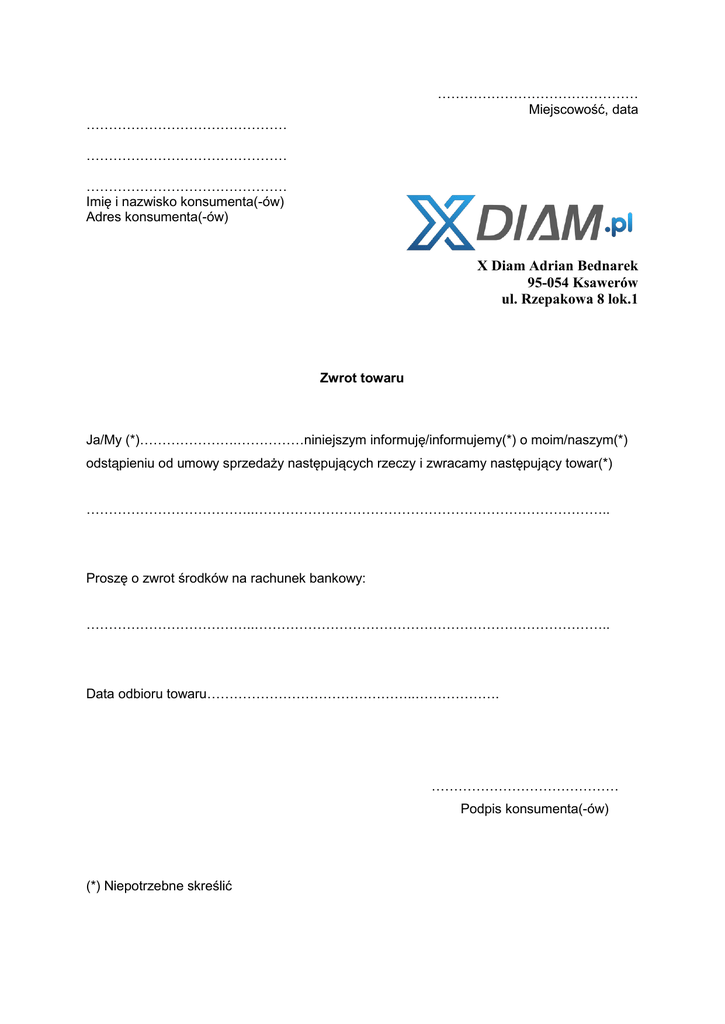 ……………………………………… Miejscowość, data ……………………………………… ……………………………………… ……………………………………… Imię i nazwisko konsumenta(-ów) Adres konsumenta(-ów) X Diam Adrian Bednarek 95-054 Ksawerów ul. Rzepakowa 8 lok.1 Zwrot towaru Ja/My (*)………………….……………niniejszym informuję/informujemy(*) o moim/naszym(*) odstąpieniu od umowy sprzedaży następujących rzeczy i zwracamy następujący towar(*) ………………………………..…………………………………………………………………….. Proszę o zwrot środków na rachunek bankowy: ………………………………..…………………………………………………………………….. Data odbioru towaru………………………………………..………………. …………………………………… Podpis konsumenta(-ów) (*) Niepotrzebne skreślić