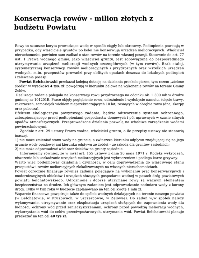 Konserwacja rowów - milion złotych z budżetu Powiatu Rowy to sztuczne koryta prowadzące wodę w sposób ciągły lub okresowy. Podtopienia powstają w przypadku, gdy właściciele gruntów po kolei nie konserwują urządzeń melioracyjnych. Właściciel nieruchomości, powinien sam zadbać o stan rowów na terenie własnej posesji. Stosownie do art. 77 ust. 1 Prawa wodnego gmina, jako właściciel gruntu, jest zobowiązana do bezpośredniego utrzymywania urządzeń melioracji wodnych szczegółowych (w tym rowów). Brak stałej, systematycznej konserwacji rowów melioracyjnych i przydrożnych oraz wszelkich urządzeń wodnych, m.in. przepustów prowadzi przy obfitych opadach deszczu do lokalnych podtopień i zalewania posesji. Powiat Bełchatowski przekazał kolejną dotację na działania proekologiczne, tym razem „zielone środki” w wysokości 4 tys. zł. powędrują w kierunku Zelowa na wykonanie rowów na terenie Gminy Zelów. Realizacja zadania polegała na konserwacji rowu przydrożnego na odcinku ok. 1 300 mb w drodze gminnej nr 101201E. Prace objęły pogłębienie rowu, udrożnienie i wydobycie namułu, ścięcie trawy, zakrzaczeń, samosiejek wiekiem nieprzekraczających 10 lat, rosnących w obrębie rowu (dna, skarpy oraz pobocza). Efektem ekologicznym powyższego zadania, będzie odtworzenie systemu ochronnego, zabezpieczającego przed podtopieniami gospodarstw domowych i pól uprawnych w czasie silnych opadów atmosferycznych. Przeprowadzone działania pozwolą na właściwe zarządzanie wodami powierzchniowymi. Zgodnie z art. 29 ustawy Prawo wodne, właściciel gruntu, o ile przepisy ustawy nie stanowią inaczej, 1) nie może zmieniać stanu wody na gruncie, a zwłaszcza kierunku odpływu znajdującej się na jego gruncie wody opadowej ani kierunku odpływu ze źródeł – ze szkodą dla gruntów sąsiednich; 2) nie może odprowadzać wód oraz ścieków na grunty sąsiednie. Informujemy również, że w myśl art. 155 ustawy z dnia 20 maja 1971 r. Kodeks wykroczeń, niszczenie lub uszkadzanie urządzeń melioracyjnych jest wykroczeniem i podlega karze grzywny. Warto więc podejmować działania i czynności, w celu doprowadzenia do właściwego stanu przepustów i rowów melioracyjnych zlokalizowanych na własnych nieruchomościach. Powiat corocznie finansuje również zadania polegające na wykonaniu prac konserwacyjnych i modernizacyjnych obiektów i urządzeń służących gospodarce wodnej w pasach dróg powiatowych powiatu bełchatowskiego. Udrożnione i dobrze utrzymane rowy są ważnym elementem bezpieczeństwa na drodze. Ich głównym zadaniem jest odprowadzanie nadmiaru wody z korony drogi. Tylko w tym roku w budżecie zaplanowano na ten cel kwotę 1 mln zł. Wsparcie finansowe powędruje także do spółek wodnych działających na terenie naszego powiatu (w Bełchatowie, w Drużbicach, w Szczercowie, w Zelowie). Do zadań w/w spółek należy wykonywanie, utrzymywanie oraz eksploatacja urządzeń służących do: zapewnienia wody dla ludności, ochrony wód przed zanieczyszczeniami, ochrony przed powodzią melioracji wodnych, wykorzystania wód do celów przeciwpożarowych, utrzymania wód. Powiat Bełchatowski planuje przekazać na ten cel 40 tys zł. Magdalena Lipińska Wydział Ochrony Środowiska, Rolnictwa i Leśnictwa
