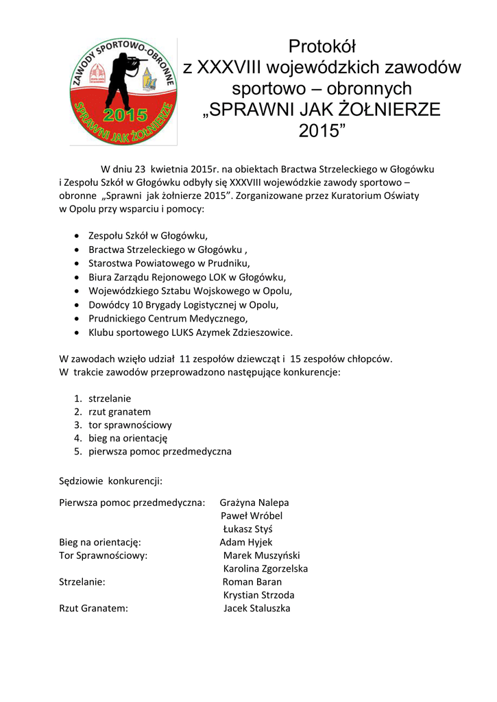 Protokół z XXXVIII wojewódzkich zawodów sportowo – obronnych „SPRAWNI JAK ŻOŁNIERZE 2015” W dniu 23 kwietnia 2015r. na obiektach Bractwa Strzeleckiego w Głogówku i Zespołu Szkół w Głogówku odbyły się XXXVIII wojewódzkie zawody sportowo – obronne „Sprawni jak żołnierze 2015”. Zorganizowane przez Kuratorium Oświaty w Opolu przy wsparciu i pomocy: Zespołu Szkół w Głogówku, Bractwa Strzeleckiego w Głogówku , Starostwa Powiatowego w Prudniku, Biura Zarządu Rejonowego LOK w Głogówku, Wojewódzkiego Sztabu Wojskowego w Opolu, Dowódcy 10 Brygady Logistycznej w Opolu, Prudnickiego Centrum Medycznego, Klubu sportowego LUKS Azymek Zdzieszowice. W zawodach wzięło udział 11 zespołów dziewcząt i 15 zespołów chłopców. W trakcie zawodów przeprowadzono następujące konkurencje: 1. 2. 3. 4. 5. strzelanie rzut granatem tor sprawnościowy bieg na orientację pierwsza pomoc przedmedyczna Sędziowie konkurencji: Pierwsza pomoc przedmedyczna: Bieg na orientację: Tor Sprawnościowy: Strzelanie: Rzut Granatem: Grażyna Nalepa Paweł Wróbel Łukasz Styś Adam Hyjek Marek Muszyński Karolina Zgorzelska Roman Baran Krystian Strzoda Jacek Staluszka Klasyfikacja końcowa chłopców: Szkoła Punkty za konkurencje Suma Rzut Test Bieg na Pierwsza punktów Strzelanie granatem sprawności. orientację Pomoc Miejsce 12 15 15 12 12,5 66,5 I 14 4 13 14 14 59 II 9 11 9 15 12,5 56,5 III Zespół Szkół LicealnoTechnicznych w Kluczborku 10 14 14 9,5 6 53,5 IV II Liceum Ogólnokształcące w Brzegu 11 12,5 11 8 10 52,5 V Zespół Szkół w Tułowicach 13 7 12 6 8 46 VI Zespół Szkół Mechanicznych w Namysłowie 5 7 7 9,5 11 39,5 VII Zespół Szkół Ogólnokształcących w Głubczycach 7 10 5 7 8 37 VIII 15 1,5 4 1 15 36,5 IX Centrum Kształcenia Zawodowego i Ustaw. w Strzelcach Opolskich 3 12,5 2 11 8 36,5 X I Liceum Ogólnokształcące w Nysie 8 4 6 13 3 34 XI Zespół Szkół Liceum Ogólnokształcące w Gogolinie 6 9 1 5 1,5 22,5 XII Zespół Szkół Rolniczych w Prudniku 4 7 3 2 4,5 20,5 XIII Gimnazjalno-Licealny Zespół Szkół w Wołczynie 2 1,5 8 4 4,5 20 XIV Zespół Szkół Gimnazjalnych, Licealno Zawodowych w Byczynie T.Polanowice 1 4 10 3 1,5 19,5 XV Zespół Szkół w Głogówku Zespół Szkół Ogólnokształcących w Kluczborku Zespół Szkół Ogólnokształcących STO w Kluczborku Zespół Szkół Elektrycznych w Opolu Klasyfikacja końcowa dziewcząt: Szkoła Punkty za konkurencje Suma Rzut Test Bieg na Pierwsza punktów Strzelanie granatem sprawność. orientacje Pomoc Zespół Szkół LicealnoTechnicznych w Kluczborku Miejsce 8 10 10 6 8 42 I 10 7 11 3 10,5 41,5 II 5 9 9 11 7 41 III 6 4,5 7 10 9 36,5 IV 1 11 6 5 10,5 33,5 V II Liceum Ogólnokształcące w Brzegu 3 8 8 7 3,5 29,5 VI Zespół Szkół w Tułowicach 11 3 5 8 1 28 VII Zespół Szkół Rolniczych w Prudniku 7 4,5 3 9 3,5 27 VIII Zespół Szkół Liceum Ogólnokształcące w Gogolinie 4 6 4 2 3,5 19,5 IX I Liceum Ogólnokształcące w Nysie 9 1 1 4 6 21 X Zespół Szkół Elektrycznych w Opolu 2 2 2 1 5 12 XI Zespół Szkół w Głogówku Gimnazjalno-Licealny Zespół Szkół w Wołczynie Zespół Szkół Ogólnokształcących w Głubczycach Zespół Szkół Ogólnokształcących w Kluczborku Do finału ogólnopolskiego zakwalifikowały się drużyny: W kategorii dziewcząt : Zespół Szkół Licealno-Technicznych w Kluczborku w składzie: 1. Justyna Czech 2. Dominika Bar 3. Justyna Atłachowicz opiekun Katarzyna Czerska W kategorii chłopców: Zespół Szkół w Głogówku w składzie: 1. Brian Pelka 2. Kewin Hilscher 3. Dominik Dudek opiekun Mirosław Jagiełło Wyróżnienia : Nagrody dla najlepszych strzelców zawodów ufundowane przez Dowódcę X Brygady Logistycznej w Opolu otrzymali : w kategorii dziewcząt Emilia Krause - Zespół Szkół w Tułowicach (46 pkt na 50) w kategorii chłopców Dawid Flaka - Zespół Szkół Rolniczych w Prudniku (46 pkt na 50) Najlepsze drużyny otrzymały puchary , medale, dyplomy Podczas zawodów nie zanotowano urazów i kontuzji oraz nie został wniesiony żaden pisemny protest. Głogówek 23 kwietnia 2015 r. Kierownik zawodów Sławomir Bogocz