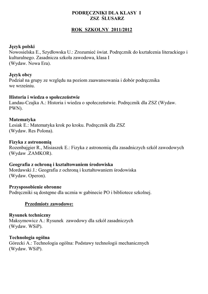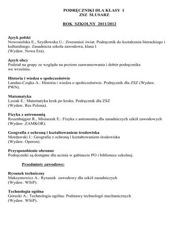 PODRĘCZNIKI DLA KLASY I ZSZ ŚLUSARZ ROK SZKOLNY 2011/2012 Język polski Nowosielska E., Szydłowska U.: Zrozumieć świat. Podręcznik do kształcenia literackiego i kulturalnego. Zasadnicza szkoła zawodowa, klasa I (Wydaw. Nowa Era). Język obcy Podział na grupy ze względu na poziom zaawansowania i dobór podręcznika we wrześniu. Historia i wiedza o społeczeństwie Landau-Czajka A.: Historia i wiedza o społeczeństwie. Podręcznik dla ZSZ (Wydaw. PWN). Matematyka Lesiak E.: Matematyka krok po kroku. Podręcznik dla ZSZ (Wydaw. Res Polona). Fizyka z astronomią Rozenbajgier R., Misiaszek E.: Fizyka z astronomią dla zasadniczych szkół zawodowych (Wydaw .ZAMKOR). Geografia z ochroną i kształtowaniem środowiska Mordawski J.: Geografia z ochroną i kształtowaniem środowiska (Wydaw. Operon). Przysposobienie obronne Podręczniki są dostępne dla ucznia w gabinecie PO i bibliotece szkolnej. Przedmioty zawodowe: Rysunek techniczny Maksymowicz A.: Rysunek zawodowy dla szkół zasadniczych (Wydaw. WSiP). Technologia ogólna Górecki A.: Technologia ogólna: Podstawy technologii mechanicznych (Wydaw. WSiP). PODRĘCZNIKI DLA KLASY I ZSZ MURARZ ROK SZKOLNY 2011/2012 Język polski Nowosielska E., Szydłowska U.: Zrozumieć świat. Podręcznik do kształcenia literackiego i kulturalnego. Zasadnicza szkoła zawodowa, klasa I (Wydaw. Nowa Era). Język obcy Podział na grupy ze względu na poziom zaawansowania i dobór podręcznika we wrześniu. Historia i wiedza o społeczeństwie Landau-Czajka A.: Historia i wiedza o społeczeństwie. Podręcznik dla ZSZ (Wydaw. PWN). Matematyka Lesiak E.: Matematyka krok po kroku. Podręcznik dla ZSZ Polona). (Wydaw. Res Fizyka z astronomią Rozenbajgier R., Misiaszek E.: Fizyka z astronomią dla zasadniczych szkół zawodowych (Wydaw. ZAMKOR). Geografia z ochroną i kształtowaniem środowiska Mordawski J.: Geografia z ochroną i kształtowaniem środowiska (Wydaw. Operon). Przysposobienie obronne Podręczniki są dostępne dla ucznia w gabinecie PO i bibliotece szkolnej. Przedmioty zawodowe: Technologia Informacja we wrześniu Dokumentacja techniczna Informacja we wrześniu PODRĘCZNIKI DLA KLASY I LICEUM OGÓLNOKSZTAŁCĄCEGO BEZPIECZEŃSTWO PUBLICZNE ROK SZKOLNY 2011/2012 Język polski Pawłowski M., Porębska K., Zych D.: Potęga słowa. Klasa I, cz. 1. Antyk, Średniowiecze, Klasa I , cz. 2 Renesans, Barok, Oświecenie (Wydaw. Nowa Era). Języki obce Podział na grupy ze względu na poziom zaawansowania i dobór podręcznika we wrześniu. Historia Choińska – Mika J., Lengauer W., Tymowski M., Zielińska K.: Historia I (Wydaw.WSiP). Geografia Wiecki W.: Geografia 1 – Geografia środowiska przyrodniczego. Zakres podstawowy (Wydaw. Operon). Matematyka Babiański W., Chańko L., Ponczek D. : Matematyka 1 – kształcenie w zakresie podstawowym i rozszerzonym (Wydaw. Nowa Era). Fizyka i astronomia Fiałkowska M., Fiałkowski K., Sagnowska B.: Fizyka dla szkół ponadgimnazjalnych (Wydaw. ZAMKOR). Chemia Litwin M.i 2 in.: Chemia ogólna i nieorganiczna. Kształcenie ogólne w zakresie podstawowym. (Wydaw. Nowa Era). Biologia Lewiński W. i 3 in.: Biologia. Zakres podstawowy. Cz. 1 (Wydaw. Operon). Technologia informacyjna Hermanowska G., Hermanowski W.: Technologia informacyjna. Podręcznik dla liceum ogólnokształcącego, liceum profilowanego i technikum (Wydaw. Operon). Przysposobienie obronne Podręczniki są dostępne dla ucznia w gabinecie PO i bibliotece szkolnej. PODRĘCZNIKI DLA KLASY I LICEUM OGÓLNOKSZTAŁCĄCEGO Z PRZYSPOSOBIENIEM WOJSKOWYM ROK SZKOLNY 2011/2012 Język polski Pawłowski M., Porębska K., Zych D.: Potęga słowa. Klasa I, cz. 1. Antyk, Średniowiecze, Klasa I , cz. 2 Renesans, Barok, Oświecenie (Wydaw. Nowa Era). Języki obce Podział na grupy ze względu na poziom zaawansowania i dobór podręcznika we wrześniu. Historia Choińska – Mika J., Lengauer W., Tymowski M., Zielińska K.: Historia I (WSiP). Geografia Wiecki W.: Geografia 1 – Geografia środowiska przyrodniczego. Zakres podstawowy (Wydaw. Operon). Matematyka Babiański W., Chańko L., Ponczek D. : Matematyka 1 – kształcenie w zakresie podstawowym i rozszerzonym (Wydaw. Nowa Era). Fizyka i astronomia Fiałkowska M., Fiałkowski K., Sagnowska B.: Fizyka dla szkół ponadgimnazjalnych (Wydaw. ZAMKOR). Chemia Litwin M.i 2 in.: Chemia ogólna i nieorganiczna. Kształcenie ogólne w zakresie podstawowym. (Wydaw. Nowa Era). Biologia Lewiński W. i 3 in.: Biologia. Zakres podstawowy. Cz. 1 (Wydaw. Operon). Technologia informacyjna Hermanowska G., Hermanowski W.: Technologia informacyjna. Podręcznik dla liceum ogólnokształcącego, liceum profilowanego i technikum (Wydaw. Operon). Przysposobienie wojskowe Przysposobienie wojskowe. Podręcznik dla szkół ponadpodstawowych. (Wydawnictwo Akademickie Centrum Graficzno - Marketingowe LODART S.A. w Łodzi). Przysposobienie obronne Podręczniki są dostępne dla ucznia w gabinecie PO i bibliotece szkolnej PODRĘCZNIKI DLA KLASY I TECHNIK BUDOWNICTWA ROK SZKOLNY 2011/2012 Język polski Pawłowski M., Porębska K., Zych D.: Potęga słowa. Klasa I, cz. 1. Antyk, Średniowiecze, Klasa I , cz. 2 Renesans, Barok, Oświecenie (Wydaw. Nowa Era). Języki obce Podział na grupy ze względu na poziom zaawansowania i dobór podręcznika we wrześniu. Historia Choińska – Mika J., Lengauer W., Tymowski M., Zielińska K.: Historia I (Wydaw. WSiP). Wiedza o kulturze Grębecka Z. i 3 in. : Człowiek w kulturze ( Wydaw. PWN ). Geografia Wójcik J.: Geografia 1 – Ziemia. Zakres podstawowy i rozszerzony (Wydaw. Nowa Era). Matematyka Babiański W., Chańko L., Ponczek D. : Matematyka 1 – kształcenie w zakresie podstawowym i rozszerzonym (Wydaw. Nowa Era). Fizyka i astronomia Fiałkowska M., Fiałkowski K., Sagnowska B.: Fizyka dla szkół ponadgimnazjalnych (Wydaw. ZAMKOR). Chemia Litwin M. i 2 in.: Chemia ogólna i nieorganiczna. Kształcenie ogólne w zakresie podstawowym. (Wydaw. Nowa Era). Biologia Lewiński W. i 3 in.: 