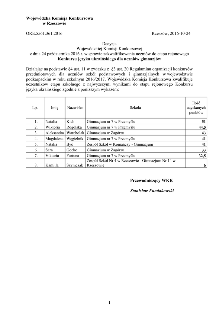 Wojewódzka Komisja Konkursowa w Rzeszowie Rzeszów, 2016-10-24 ORE.5561.361.2016 Decyzja Wojewódzkiej Komisji Konkursowej z dnia 24 października 2016 r. w sprawie zakwalifikowania uczniów do etapu rejonowego Konkursu języka ukraińskiego dla uczniów gimnazjów Działając na podstawie §4 ust. 11 w związku z §3 ust. 20 Regulaminu organizacji konkursów przedmiotowych dla uczniów szkół podstawowych i gimnazjalnych w województwie podkarpackim w roku szkolnym 2016/2017, Wojewódzka Komisja Konkursowa kwalifikuje uczestników etapu szkolnego z najwyższymi wynikami do etapu rejonowego Konkursu języka ukraińskiego zgodnie z poniższym wykazem: Lp. Imię Nazwisko 1. 2. 3. 4. 5. 6. 7. Natalia Wiktoria Aleksandra Magdalena Natalia Sara Viktoria Kich Rogólska Warcholak Węgielnik Być Gocko Fortuna 8. Kamilla Szkoła Gimnazjum nr 7 w Przemyślu Gimnazjum nr 7 w Przemyślu Gimnazjum w Zagórzu Gimnazjum nr 7 w Przemyślu Zespół Szkół w Komańczy - Gimnazjum Gimnazjum w Zagórzu Gimnazjum nr 7 w Przemyślu Zespół Szkół Nr 4 w Rzeszowie - Gimnazjum Nr 14 w Szymczak Rzeszowie Przewodniczący WKK Stanisław Fundakowski 1 Ilość uzyskanych punktów 51 44,5 43 41 41 33 32,5 6