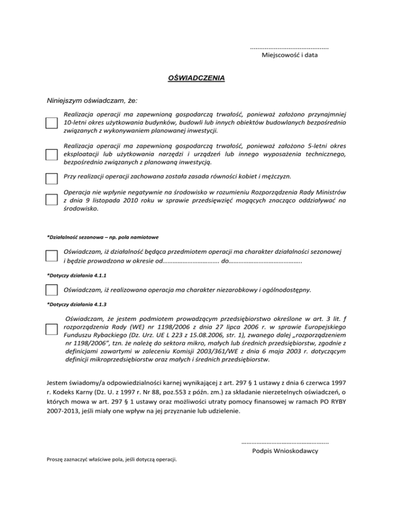 ........................................... Miejscowość i data OŚWIADCZENIA Niniejszym oświadczam, że: Realizacja operacji ma zapewnioną gospodarczą trwałość, ponieważ założono przynajmniej 10-letni okres użytkowania budynków, budowli lub innych obiektów budowlanych bezpośrednio związanych z wykonywaniem planowanej inwestycji. Realizacja operacji ma zapewnioną gospodarczą trwałość, ponieważ założono 5-letni okres eksploatacji lub użytkowania narzędzi i urządzeń lub innego wyposażenia technicznego, bezpośrednio związanych z planowaną inwestycją. Przy realizacji operacji zachowana została zasada równości kobiet i mężczyzn. Operacja nie wpłynie negatywnie na środowisko w rozumieniu Rozporządzenia Rady Ministrów z dnia 9 listopada 2010 roku w sprawie przedsięwzięć mogących znacząco oddziaływać na środowisko. *Działalność sezonowa – np. pola namiotowe Oświadczam, iż działalność będąca przedmiotem operacji ma charakter działalności sezonowej i będzie prowadzona w okresie od……………………………. do…………………………………….. *Dotyczy działania 4.1.1 Oświadczam, iż realizowana operacja ma charakter niezarobkowy i ogólnodostępny. *Dotyczy działania 4.1.3 Oświadczam, że jestem podmiotem prowadzącym przedsiębiorstwo określone w art. 3 lit. f rozporządzenia Rady (WE) nr 1198/2006 z dnia 27 lipca 2006 r. w sprawie Europejskiego Funduszu Rybackiego (Dz. Urz. UE L 223 z 15.08.2006, str. 1), zwanego dalej „rozporządzeniem nr 1198/2006”, tzn. że należę do sektora mikro, małych lub średnich przedsiębiorstw, zgodnie z definicjami zawartymi w zaleceniu Komisji 2003/361/WE z dnia 6 maja 2003 r. dotyczącym definicji mikroprzedsiębiorstw oraz małych i średnich przedsiębiorstw. Jestem świadomy/a odpowiedzialności karnej wynikającej z art. 297 § 1 ustawy z dnia 6 czerwca 1997 r. Kodeks Karny (Dz. U. z 1997 r. Nr 88, poz.553 z późn. zm.) za składanie nierzetelnych oświadczeń, o których mowa w art. 297 § 1 ustawy oraz możliwości utraty pomocy finansowej w ramach PO RYBY 2007-2013, jeśli miały one wpływ na jej przyznanie lub udzielenie. ………………………………………….... Podpis Wnioskodawcy Proszę zaznaczyć właściwe pola, jeśli dotyczą operacji.