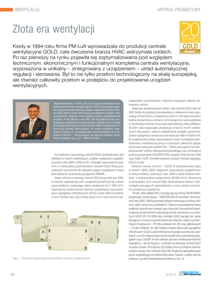 wentylacja artykuł promocyjny 20 Złota era wentylacji YEARS of Kiedy w 1994 roku firma PM-Luft wprowadzała do produkcji centrale GOLD wentylacyjne GOLD, cała ówczesna branża HVAC wstrzymała oddech. Po raz pierwszy na rynku pojawiła się zoptymalizowana pod względem technicznym, ekonomicznym i funkcjonalnym kompletna centrala wentylacyjna, wyposażona w unikalny – zintegrowany z urządzeniem – układ automatycznej regulacji i sterowania. Był to nie tylko przełom technologiczny na skalę europejską, ale również całkowity przełom w podejściu do projektowania urządzeń wentylacyjnych. „Wprowadzenie w 1994 roku do seryjnej produkcji kompaktowych central wentylacyjnych GOLD wytyczyło zupełnie nowy kierunek rozwoju całego segmentu branży instalacyjnej. Była to mała rewolucja, początkowo przyjęta dość sceptycznie. Jednak rynek bardzo szybko zaakceptował produkt. Przez dłuższy czas PM–Luft był jedyną firmą produkującą urządzenia w nowej formie, dawało nam to dużą przewagę nad innymi producentami. Kilka lat później konkurencja zaczęła wprowadzać na rynek podobne urządzenia oparte na rozwiązaniach zastosowanych w centralach GOLD!” – Tak po latach wspomina tamten okres Prezes Swegon Sp. z o.o. – Witold Leven. Początkowo typoszereg central GOLD produkowany był zaledwie w trzech wielkościach, a zakres wydajności urządzeń wynosił tylko 400÷3 000 m3/h. Centrale wyposażone były m.in. w wentylatory promieniowo–osiowe GOLD Wing oraz rotacyjne wymienniki do odzysku ciepła. Urządzenia można było dobierać za pomocą programu PMWIN. Nowe zmiany w rozwoju central GOLD przyniósł rok 1996, w którym typoszereg tych urządzeń powiększył się o dwie nowe wielkości, zwiększając zakres wydajności do 11 000 m3/h. Typoszereg central został również uzupełniony typoszeregiem agregatów chłodniczych GOLD Cooler. Równocześnie w tym okresie cały czas trwały prace m.in. nad nowymi roz- Rys. 1. Pierwszy typoszereg central GOLD o trzech wielkościach 68 wiązaniami wentylatorów i dalszym rozwojem układu sterowania central. Kolejnym przełomowym rokiem dla central GOLD był rok 2001, kiedy do produkcji wprowadzono całkowicie nowy typoszereg central GOLD o oznaczeniu GOLD A. Od tego momentu każda poważniejsza zmiana technologiczna wprowadzana w konstrukcji central oznaczana była kolejną literą alfabetu. W 2001 roku rozpoczęto produkcję central w trzech wielkościach fizycznych i sześciu wielkościach wydatku powietrza. Zakres wydajności central wynosił wówczas 400÷14 000 m3/h. W urządzeniach zostały wprowadzone nowe rozwiązania wentylatorów z możliwością pracy w wyższych zakresach sprężu oraz nowe rotacyjne wymienniki – Turbo oraz oparty na mikoprocesorach system sterowania komunikujący się z centralą za pomocą przystawki GOLDEN GATE, poprzez Internet lub GSM oraz GOLD–LON. Zmodernizowane zostały również agregaty GOLD Cooler . Kolejna wersja central – GOLD B produkowana była w latach: 2002–2005. Najpierw typoszereg uzupełniono o nową wielkość, później w roku 2004 o dwie kolejne wielkości z maksymalną wydajnością 28 000 m3/h. Nowością w przypadku tych central było zastosowanie dwóch równolegle pracujących wentylatorów w tym samym strumieniu przepływu powietrza. W roku 2005 zakłady PM-Luft połączyły się z firmą STIFAB-FAREX, przyjmując nową nazwę – SWEGON AB. W kwestiach technicznych lata 2005–2009 przyniosły kolejne interesujące zmiany, których całość oznaczono symbolem C. Oprócz wprowadzenia nowej wielkości central oraz nowego typu oznaczeń, do produkcji wprowadzony został również typoszereg central nawiewno–wywiewnych GOLD SD. Od 2006 roku centrale GOLD zaczęły być także dostępne z nowymi wymiennikami do odzysku ciepła: wymiennikami krzyżowymi – PX (dla wielkości 04–30) oraz glikolowymi – CX (dla wielkości 35–80). Kolejna zmiana dotyczyła agregatów chłodniczych GOLD Cooler, które powoli zaczęto wycofywać z produkcji, a na ich miejsce opracowany został nowy typoszereg agregatów typu CoolDX. W tym okresie, koncern zrealizował również największy – jak do tej pory – kontrakt na dostawę central GOLD na jeden obiekt. W budynku 30 St Mary Axe w Londynie zainstalowane zostały 184 centrale GOLD RX. Budynek zaprojektowany przez angielskiego architekta Normana Fostera, szybko stał się jednym z symboli londyńskiej architektury (rys. 4). 6/2014 wentylacja W roku 2009 do sprzedaży trafiły centrale podwieszane GOLD LP oraz nowa wielkość urządzeń z wymiennikiem rotacyjnym – GOLD 12. W tym samym czasie z linii produkcyjnych fabryki Swegon w Kvänum, zeszła 50-tysięczna sztuka centrali GOLD. Jubileuszowy egzemplarz trafił do klienta w Norrköping w Szwecji w dniu 16 marca 2009. Centralę zainstalowano w szkole Taborsbergs. Kolejną wersję central GOLD D wprowadzono do produkcji w roku 2010. Nowe wentylatory zastosowane w wersji D przyjęły nazwę WING+. Wprowadzono nowe typy silników EC, posiadających wiele zalet. Zastosowanie nowych rozwiązań wentylatorów znacznie wpłynęło na wzrost wydajności poszczególnych wielkości central GOLD. Nowe centrale w wersji D to nie tylko zmiany w samej centrali, ale również zmiany w wyposażeniu dodatkowym. Wszystkie wielkości central oprócz dotychczasowej wersji sekcji funkcyjnych (jak np.: nagrzewnice, chłodnice itp.) przystosowanych do montażu w kanałach, od 2010 roku są dostępne również w wariancie w obudownie. Można było więc budować konfiguracje central na podobnej zasadzie co centrale sekcyjne. Koniec roku 2010 to dalsze rozszerzenie typoszeregu central w postaci całkowicie nowej wielkości GOLD 100/120, Rys. 2. Centrale GOLD produkowane w latach 1998–2001 Rys. 3. Fabryka central klimatyzacyjnych Swegon w Kvanum, Szwecja Rys. 4. Budynek 30 St Mary Axe w Londynie ma 40 pięter i 180 m wysokości. Dzięki zastosowaniu nowoczesnych technologii (m.in. 
