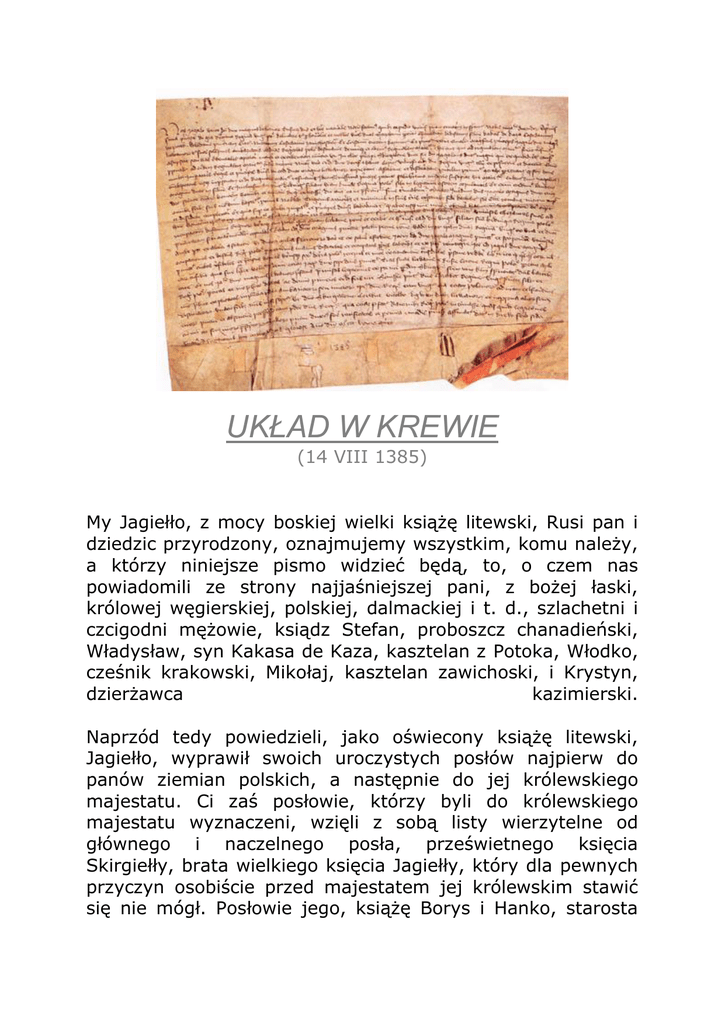 UKŁAD W KREWIE (14 VIII 1385) My Jagiełło, z mocy boskiej wielki książę litewski, Rusi pan i dziedzic przyrodzony, oznajmujemy wszystkim, komu należy, a którzy niniejsze pismo widzieć będą, to, o czem nas powiadomili ze strony najjaśniejszej pani, z bożej łaski, królowej węgierskiej, polskiej, dalmackiej i t. d., szlachetni i czcigodni mężowie, ksiądz Stefan, proboszcz chanadieński, Władysław, syn Kakasa de Kaza, kasztelan z Potoka, Włodko, cześnik krakowski, Mikołaj, kasztelan zawichoski, i Krystyn, dzierżawca kazimierski. Naprzód tedy powiedzieli, jako oświecony książę litewski, Jagiełło, wyprawił swoich uroczystych posłów najpierw do panów ziemian polskich, a następnie do jej królewskiego majestatu. Ci zaś posłowie, którzy byli do królewskiego majestatu wyznaczeni, wzięli z sobą listy wierzytelne od głównego i naczelnego posła, prześwietnego księcia Skirgiełły, brata wielkiego księcia Jagiełły, który dla pewnych przyczyn osobiście przed majestatem jej królewskim stawić się nie mógł. Posłowie jego, książę Borys i Hanko, starosta wileński, stanąwszy przed królową węgierską, tak, sprawę wykładając, mówili: Wielu cesarzów, królów i różnych książąt pragnęło wejść w stałe stosunki pokrewieństwa z tymże wielkim księciem litewskim; lecz Bóg wszechmogący zachował to dla osoby waszej królewskiej mości. Przeto, najjaśniejsza pani, spełnij to zbawienne polecenie, przyjmij wielkiego księcia Jagiełłę za syna i oddaj mu w małżeństwo najukochańszą córkę swoją, Jadwigę, królowę polską. Ufamy, że z tego związku wyniknie chwała Bogu, zbawienie duszom, cześć ludziom a pomnożenie królestwu. Nim zaś to, o czem mowa, do końca stosownego dojdzie, wielki książę Jagiełło ze wszystkimi swoimi braćmi, jeszcze nie ochrzczonymi, tudzież z krewnymi, ze szlachtą, ziemianami większymi i mniejszymi, w ziemiach jego zamieszkałymi, chce, życzy i pragnie przyjąć wiarę katolicką świętego rzymskiego Kościoła. Nie mogli tego otrzymać od niego, pomimo usilnych starań, wielu cesarzów i różnych książąt, albowiem Bóg wszechmocny sławę tę dla waszego królewskiego majestatu zachował. Na oczywistość i moc tego, obiecuje wielki książę Jagiełło złożyć i wydać wszystkie swoje skarby dla odzyskania utrat, które poniosły tak Polska jak Litwa, jeżeli tylko królowa węgierska córkę swoją, Jadwigę, królowę polską, ślubem małżeńskim z nim skojarzy. Wielki książę Jagiełło obiecuje sumę, zaręczoną między królową węgierską a księciem Austryi, mianowicie dwakroć sto tysięcy florenów, złożyć i wypłacić. Tenże wielki książę Jagiełło obiecuje i zaręcza własnym kosziem i staraniem przywrócić królestwu polskiemu wszystkie kraje, przez kogokolwiek oderwane od niego i zabrane. Tenże wielki książę Jagiełło obiecuje wrócić pierwotną wolność wszystkim chrześcijanom, zwłaszcza ludziom obojej płci, z ziemi polskiej, obyczajem wojennym zabranym i przesiedlonym, a to tak, że każdy lub każda będzie się mógł udać tam, gdzie będzie chciał. Nareszcie tenże wielki książę Jagiełło obiecuje ziemie swoje litewskie i ruskie na wieczne czasy do korony królestwa polskiego przyłączyć. My przeto, przerzeczony wielki książę litewski Jagiełło, na powyższe oświadczenie poselskie, dane i złożone w naszem imieniu panom królestwa polskiego przez wspomnianego Skirgiełłę, brata naszego ukochanego, jako też na zaręczenia, uczynione najjaśniejszej królowej węgierskiej Elżbiecie przez wyslanych od tegoż brata naszego pełnomocników, w obecności posłów królowej pani, tak Węgrów jak i Polaków, do naszej wysokości wysłanych, razem z braćmi naszymi, książętami litewskimi Skirgiełłą, Korybutem, Witoldem, Ligwenem, oraz w imieniu innych braci naszych, obecnych i nieobecnych, zgadzamy się i oświadczamy to tak rzeczonej królowej pani, jak i wspomnianym panom królestwa polskiego; te zaś oświadczenia poselskie kazaliśmy umocnić pieczęciami naszemi i braci naszych i te we wszystkiem potwierdzamy. Dan w Krewie, w poniedziałek, w wigilię Wniebowzięcia Najświętszej Maryi Panny roku pańskiego 1385-go.