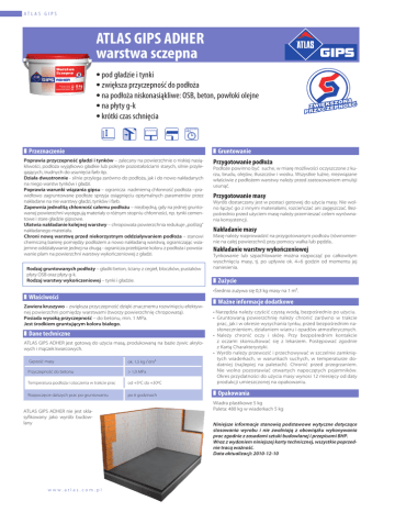 AT L A S G I P S ATLAS GIPS ADHER warstwa sczepna • pod gładzie i tynki • zwiększa przyczepność do podłoża • na podłoża niskonasiąkliwe: OSB, beton, powłoki olejne • na płyty g-k • krótki czas schnięcia ■ Przeznaczenie ■ Gruntowanie Poprawia przyczepność gładzi i tynków – zalecany na powierzchnie o niskiej nasiąkliwości, podłoża wyjątkowo gładkie lub pokryte pozostałościami starych, silnie przylegających, trudnych do usunięcia farb itp. Działa dwustronnie - silnie przylega zarówno do podłoża, jak i do nowo nakładanych na niego warstw tynków i gładzi. Poprawia warunki wiązania gipsu – ogranicza nadmierną chłonność podłoża –prawidłowo zagruntowane podłoże sprzyja osiągnięciu optymalnych parametrów przez nakładane na nie warstwy gładzi, tynków i farb. Zapewnia jednolitą chłonność całemu podłożu – niezbędną, gdy na jednej gruntowanej powierzchni występują materiały o różnym stopniu chłonności, np. tynki cementowe i stare gładzie gipsowe. Ułatwia nakładanie kolejnej warstwy – chropowata powierzchnia redukuje „poślizg” nakładanego materiału. Chroni nową warstwę przed niekorzystnym oddziaływaniem podłoża – stanowi chemiczną barierę pomiędzy podłożem a nowo nakładaną warstwą, ograniczając wzajemne oddziaływanie jednej na drugą - ogranicza przebijanie koloru z podłoża i powstawanie plam na powierzchni warstwy wykończeniowej z gładzi. Rodzaj gruntowanych podłoży – gładki beton, ściany z cegieł, bloczków, pustaków płyty OSB oraz płyty g-k. Rodzaj warstwy wykończeniowej – tynki i gładzie. Przygotowanie podłoża Podłoże powinno być suche, w miarę możliwości oczyszczone z kurzu, brudu, olejów, tłuszczów i wosku. Wszystkie luźne, niezwiązane właściwie z podłożem warstwy należy przed zastosowaniem emulsji usunąć. Przygotowanie masy Wyrób dostarczany jest w postaci gotowej do użycia masy. Nie wolno łączyć go z innymi materiałami, rozcieńczać ani zagęszczać. Bezpośrednio przed użyciem masę należy przemieszać celem wyrównania konsystencji. Nakładanie masy Masę należy rozprowadzić na przygotowanym podłożu (równomiernie na całej powierzchni) przy pomocy wałka lub pędzla.. Nakładanie warstwy wykończeniowej Tynkowanie lub szpachlowanie można rozpocząć po całkowitym wyschnięciu masy, tj. po upływie ok. 4÷6 godzin od momentu jej naniesienia. ■ Zużycie •Średnio zużywa się 0,3 kg masy na 1 m². ■ Właściwości Zawiera kruszywo – zwiększa przyczepność dzięki znacznemu rozwinięciu efektywnej powierzchni pomiędzy warstwami (tworzy powierzchnię chropowatą). Posiada wysoką przyczepność – do betonu, min. 1 MPa. Jest środkiem gruntującym koloru białego. ■ Ważne informacje dodatkowe Gęstość masy ok. 1,5 kg / dm³ Przyczepność do betonu > 1,0 MPa Temperatura podłoża i otoczenia w trakcie prac od +5ºC do +30ºC • Narzędzia należy czyścić czystą wodą, bezpośrednio po użyciu. • Gruntowaną powierzchnię należy chronić zarówno w trakcie prac, jak i w okresie wysychania tynku, przed bezpośrednim nasłonecznieniem, działaniem wiatru i opadów atmosferycznych. • Należy chronić oczy i skórę. Przy bezpośrednim kontakcie z oczami skonsultować się z lekarzem. Postępować zgodnie z Kartą Charakterystyki. • Wyrób należy przewozić i przechowywać w szczelnie zamkniętych wiaderkach, w warunkach suchych, w temperaturze dodatniej (najlepiej na paletach). Chronić przed przegrzaniem. Nie wolno pozostawiać otwartych napoczętych pojemników. Okres przydatności do użycia masy wynosi 12 miesięcy od daty produkcji umieszczonej na opakowaniu. Rozpoczęcie dalszych prac po gruntowaniu po 6 godzinach ■ Opakowania ■ Dane techniczne ATLAS GIPS ADHER jest gotową do użycia masą, produkowaną na bazie żywic akrylowych i mączek kwarcowych. ATLAS GIPS ADHER nie jest sklasyfikowany jako wyrób budowlany 236 www.atlas.com.pl Wiadra plastikowe 5 kg Paleta: 480 kg w wiaderkach 5 kg Niniejsze informacje stanowią podstawowe wytyczne dotyczące stosowania wyrobu i nie zwalniają z obowiązku wykonywania prac zgodnie z zasadami sztuki budowlanej i przepisami BHP. Wraz z wydaniem niniejszej karty technicznej, wszystkie poprzednie tracą ważność. Data aktualizacji: 2010-12-10