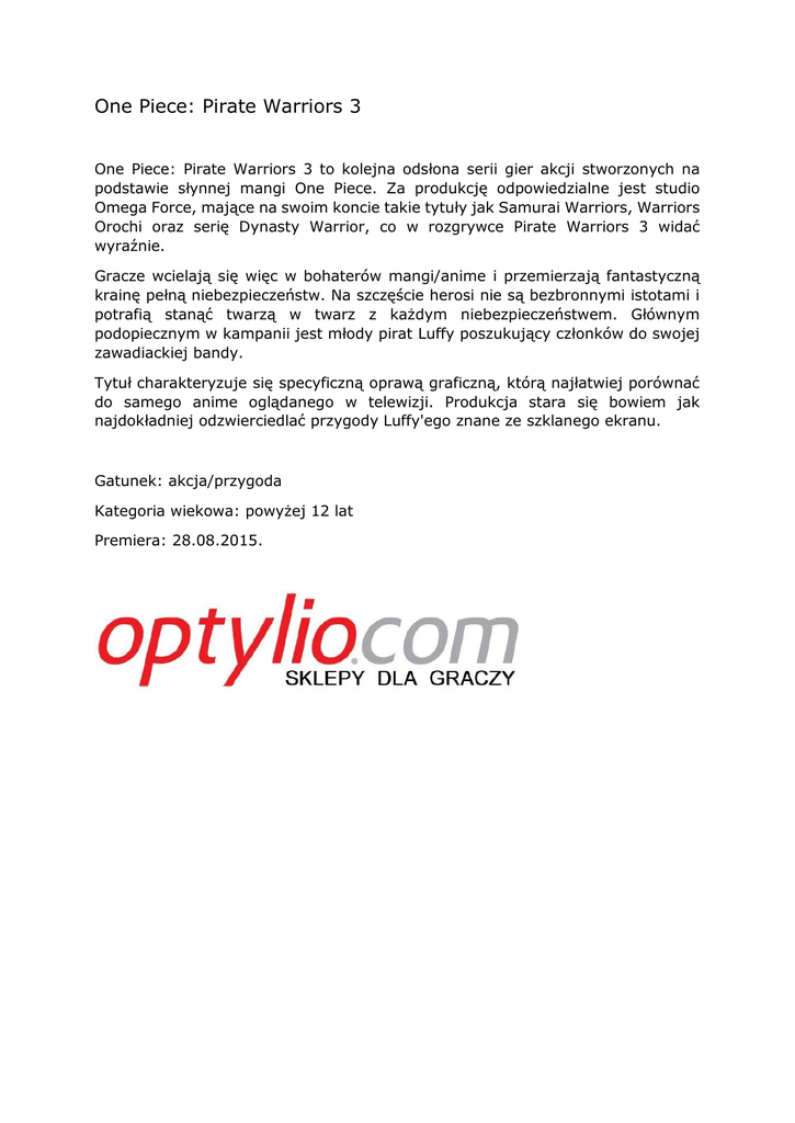 One Piece: Pirate Warriors 3 One Piece: Pirate Warriors 3 to kolejna odsłona serii gier akcji stworzonych na podstawie słynnej mangi One Piece. Za produkcję odpowiedzialne jest studio Omega Force, mające na swoim koncie takie tytuły jak Samurai Warriors, Warriors Orochi oraz serię Dynasty Warrior, co w rozgrywce Pirate Warriors 3 widać wyraźnie. Gracze wcielają się więc w bohaterów mangi/anime i przemierzają fantastyczną krainę pełną niebezpieczeństw. Na szczęście herosi nie są bezbronnymi istotami i potrafią stanąć twarzą w twarz z każdym niebezpieczeństwem. Głównym podopiecznym w kampanii jest młody pirat Luffy poszukujący członków do swojej zawadiackiej bandy. Tytuł charakteryzuje się specyficzną oprawą graficzną, którą najłatwiej porównać do samego anime oglądanego w telewizji. Produkcja stara się bowiem jak najdokładniej odzwierciedlać przygody Luffy'ego znane ze szklanego ekranu. Gatunek: akcja/przygoda Kategoria wiekowa: powyżej 12 lat Premiera: 28.08.2015.