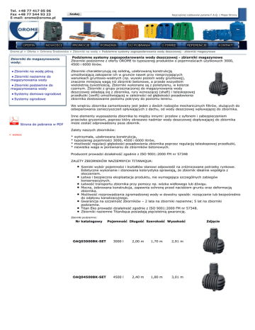 Tel. +48 77 417 05 06 Fax +48 77 544 93 23 E-mail: [email protected] Najczęściej zadawane pytania F.A.Q. | Mapa Strony Orome.pl > Oferta > Ochrona Środowiska > Zbiorniki na wodę > Podziemne systemy zagospodarowania wody deszczowej - zbiorniki magazynowe Zbiorniki do magazynowania wody: Zbiorniki na wodę pitną Zbiorniki naziemne do magazynowania wody Zbiorniki podziemne do magazynowania wody Systemy domowo-ogrodowe Systemy ogrodowe Podziemne systemy zagospodarowania wody deszczowej - zbiorniki magazynowe Zbiorniki podziemne z oferty OROME to typoszereg produktów o pojemnościach użytkowych 3000, 4500 i 6000 litrów. Zbiorniki charakteryzują się solidną, użebrowaną konstrukcją umożliwiającą zakopanie ich w gruncie nawet przy niesprzyjających warunkach gruntowo-wodnych (np. wysoki poziom wody gruntowej), znacznie mniejszą wagą niż zbiorniki betonowe, a przede wszystkim wieloletnią żywotnością. Zbiorniki wykonane są z polietylenu, w kolorze czarnym. Zbiorniki z grupy przeznaczonej do magazynowania wody deszczowej składają się z zbiornika, rury wznoszącej (shaft) i teleskopowej przedłużki (swift) umożliwiającej w zależności od głębokości posadowienia zbiornika dostosowanie poziomu pokrywy do poziomu terenu. We wnętrzu zbiornika zamontowany jest jeden z dwóch rodzajów mechanicznych filtrów, służących do odseparowania zanieczyszczeń spływających z dachu, od wody deszczowej wpływającej do zbiornika. Strona do pobrania w PDF Inne elementy wyposażenia zbiornika to między innymi: przelew z syfonem i zabezpieczeniem przeciwko gryzoniom, poprzez który okresowo nadmiar wody deszczowej dopływającej do zbiornika może zostać odprowadzony poza zbiornik. Zalety naszych zbiorników: < wstecz * * * * wytrzymała, użebrowana konstrukcja, typoszereg pojemności 3000, 4500 i 6000 litrów, możliwość regulacji głębokości posadowienia zbiornika poprzez regulację teleskopowej przedłużki, niewielka waga w porównaniu do zbiorników betonowych. Producent prowadzi działalność zgodnie z ISO 9001:2000 FM nr 57348 ZALETY ZBIORNIKÓW NAZIEMNYCH TITANAQUA: Szeroki wybór pojemności i kształtów stanowi odpowiedź na zróżnicowane potrzeby rynkowe. Estetyczne wykonanie i stonowana kolorystyka sprawiają, że zbiornik idealnie współgra z otoczeniem. Łatwa i bezpieczna eksploatacja produktu, nie wymagająca szczególnych zabiegów konserwacyjnych. Łatwość transportu zbiornika przy pomocy np. wózka widłowego lub dźwigu. Mocna, żebrowana konstrukcja, zapewnia ochronę przed naciskiem gruntu oraz deformacją zbiornika. Możliwość rozprowadzania zgromadzonej wody w dowolny sposób: rozsączanie lub bezpośrednio do odpływu kanalizacyjnego. Gwarancja na szczelność zbiorników – 2 lata na zbiorniki naziemne; 5 lat na zbiorniki podziemne. Titan Eko prowadzi działalność zgodnie z ISO 9001:2000 FM nr 57348. Zbiorniki naziemne TitanAqua posiadają pięcioletnią gwarancję. Zbiorniki podziemne: Nr katalogowy Pojemność Długość Szerokość Wysokość OAQ03000BK-SET 3000 l 2,00 m 1,70 m 2,91 m OAQ04500BK-SET 4500 l 2,40 m 1,80 m 3,01 m Zdjęcie OAQ06000BK-SET 6000 l 2,40 m 2,07 m 3,18 m *Wymiary produktów mogą się różnić w zakresie +/- 1%. AKCESORIA: Filtr zbierający Gdy nadmiar wody odprowadzany jest do systemu rozsączającego, w zbiorniku zastosowany jest filtr zbierający, który posiada możliwość gromadzenia zanieczyszczeń i późniejszego ich usuwania, tak aby nie zamulić układu rozsączającego. Filtr zbierający Woda dopływająca z dachu poprzez system rynnowy, niesie ze sobą zanieczyszczania, które poprzez zainstalowany wewnątrz zbiornika filtr nie mają możliwości dostać się do wnętrza zbiornika. Naniesione przez wodę zanieczyszczenia pozostają w filtrze i muszą zostać okresowo usunięte przez użytkownika. Podczas standardowego oczyszczania filtra polegającego na otwarciu pokrywy, wyjęciu kosza i usunięciu z niego zanieczyszczeń, zaleca się również każdorazowo przepłukać go pod bieżącą wodą tak, aby usunąć mniejsze zanieczyszczenia pozostające w oczkach filtra. Sposób działania filtra zbierającego: 1. 2. 3. 4. Dopływ wody deszczowej z rynny, Zbieranie zanieczyszczeń w koszu filtra drobno oczkowego (wielkość oczka 0,55 mm), Dodatkowy dopływ (w przypadku zbierania deszczówki z dwóch rur spustowych), Odpływ oczyszczonej wody do zbiornika podziemnego. ZALETY: * * * * prosta konstrukcja, kosz zbierający zanieczyszczenia uniemożliwiający zamulenie systemu rozsączającego, wysoka efektywność filtrowania. Filtr przepływowy Gdy nadmiar wody odprowadzany jest do kanalizacji deszczowej lub ogólnospławnej, w zbiorniku zastosowany jest filtr przepływowy, nie wymagający systematycznego usuwania zanieczyszczeń przez użytkownika. Filtr przepływowy Woda dopływająca z dachu poprzez system rynnowy, niesie ze sobą zanieczyszczania, które poprzez zainstalowany wewnątrz zbiornika filtr nie mają możliwości dostać się do wnętrza zbiornika. Naniesione przez wodę zanieczyszczenia pozostające w filtrze są okresowo odprowadzane poza zbiorniki przez występujące co jakiś czas deszcze nawalne; wtedy to woda płynąca systemem rur z dużą prędkością oczyszcza filtr. Zaleca się jednak co kilka miesięcy wyjąć wkład filtra ze zbiornika i przepłukać go pod bieżącą wodą tak, aby usunąć mniejsze zanieczyszczenia. W terenach, w których występuje gęste zadrzewienie zaleca się instalować dodatkowe siatki lub koszyczki na lejach spustowych rynny, lub czyszczaki na rurach spustowych. Spowoduje to dopływa mniej zanieczyszczonej wody do zbiornika, a tym samym rzadziej będzie trzeba dokonywać przeglądów układu filtrującego. Sposób działania filtra przepływowego: 1. Dopływ wody deszczowej z rynny, 2. Zbieranie zanieczyszczeń na filtrze drobno oczkowym 0,17 mm, 3. Odpływ nadmiaru wody wraz z zanieczyszczeniami do kanalizacji deszczowej. Zalety: * prosta konstr