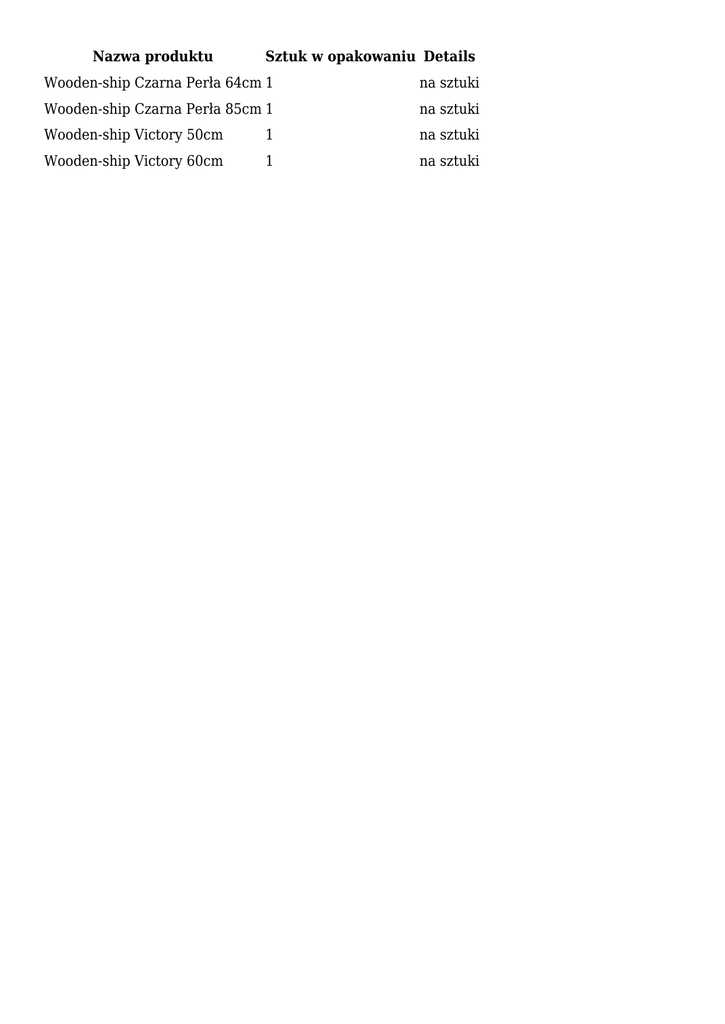 Nazwa produktu Sztuk w opakowaniu Details Wooden-ship Czarna Perła 64cm 1 na sztuki Wooden-ship Czarna Perła 85cm 1 na sztuki Wooden-ship Victory 50cm 1 na sztuki Wooden-ship Victory 60cm 1 na sztuki