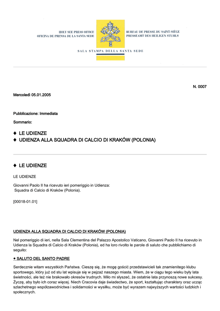 N. 0007 Mercoledì 05.01.2005 Pubblicazione: Immediata Sommario: ♦ LE UDIENZE ♦ UDIENZA ALLA SQUADRA DI CALCIO DI KRAKÓW (POLONIA) ♦ LE UDIENZE LE UDIENZE Giovanni Paolo II ha ricevuto ieri pomeriggio in Udienza: Squadra di Calcio di Kraków (Polonia). [00018-01.01] UDIENZA ALLA SQUADRA DI CALCIO DI KRAKÓW (POLONIA) Nel pomeriggio di ieri, nella Sala Clementina del Palazzo Apostolico Vaticano, Giovanni Paolo II ha ricevuto in Udienza la Squadra di Calcio di Kraków (Polonia), ed ha loro rivolto le parole di saluto che pubblichiamo di seguito: ● SALUTO DEL SANTO PADRE Serdecznie witam wszystkich Państwa. Cieszę się, że mogę gościć przedstawicieli tak znamienitego klubu sportowego, który już od stu lat wpisuje się w pejzaż naszego miasta. Wiem, że w ciągu tego wieku były lata świetności, ale też nie brakowało okresów trudnych. Miło mi słyszeć, że ostatnie lata przynoszą nowe sukcesy. Życzę, aby było ich coraz więcej. Niech Cracovia daje świadectwo, że sport, kształtując charaktery oraz ucząc szlachetnego współzawodnictwa i solidarności w wysiłku, może być wyrazem najwyższych wartości ludzkich i społecznych. Bollettino N. 0007 - 05.01.2005 2 Niech Wam Bóg błogosławi! [Vi saluto tutti cordialmente. Sono lieto di poter ospitare i rappresentanti di un club così insigne, che ormai da cento anni si iscrive nel panorama della nostra città. So che nel corso di questo secolo vi sono stati anni di splendore, ma non sono mancati anche i periodi difficili. Ho piacere sentire che gli ultimi anni hanno portato nuovi successi. Auguro che siano sempre di più. Il Cracovia dia la testimonianza che lo sport, formando i caratteri e insegnando la nobiltà nella competizione e la solidarietà nello sforzo, può essere espressione dei più alti valori umani e sociali. Dio vi benedica!] [00020-09.01] [Testo originale: Polacco] [B0007-XX.02]