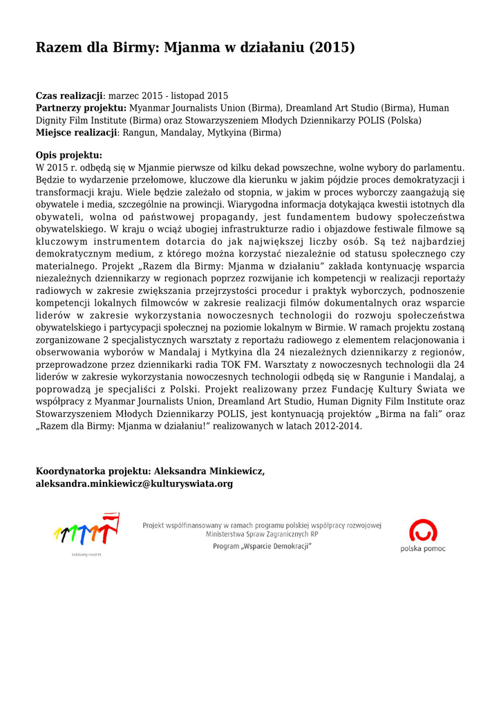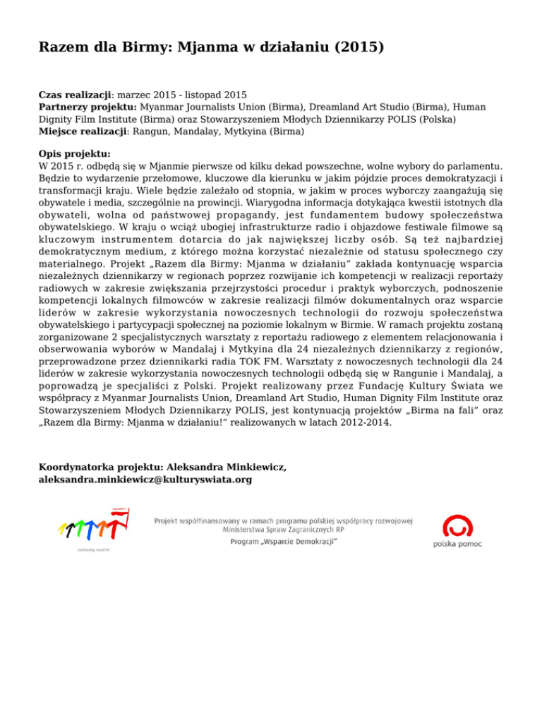 Razem dla Birmy: Mjanma w działaniu (2015) Czas realizacji: marzec 2015 - listopad 2015 Partnerzy projektu: Myanmar Journalists Union (Birma), Dreamland Art Studio (Birma), Human Dignity Film Institute (Birma) oraz Stowarzyszeniem Młodych Dziennikarzy POLIS (Polska) Miejsce realizacji: Rangun, Mandalay, Mytkyina (Birma) Opis projektu: W 2015 r. odbędą się w Mjanmie pierwsze od kilku dekad powszechne, wolne wybory do parlamentu. Będzie to wydarzenie przełomowe, kluczowe dla kierunku w jakim pójdzie proces demokratyzacji i transformacji kraju. Wiele będzie zależało od stopnia, w jakim w proces wyborczy zaangażują się obywatele i media, szczególnie na prowincji. Wiarygodna informacja dotykająca kwestii istotnych dla obywateli, wolna od państwowej propagandy, jest fundamentem budowy społeczeństwa obywatelskiego. W kraju o wciąż ubogiej infrastrukturze radio i objazdowe festiwale filmowe są kluczowym instrumentem dotarcia do jak największej liczby osób. Są też najbardziej demokratycznym medium, z którego można korzystać niezależnie od statusu społecznego czy materialnego. Projekt „Razem dla Birmy: Mjanma w działaniu” zakłada kontynuację wsparcia niezależnych dziennikarzy w regionach poprzez rozwijanie ich kompetencji w realizacji reportaży radiowych w zakresie zwiększania przejrzystości procedur i praktyk wyborczych, podnoszenie kompetencji lokalnych filmowców w zakresie realizacji filmów dokumentalnych oraz wsparcie liderów w zakresie wykorzystania nowoczesnych technologii do rozwoju społeczeństwa obywatelskiego i partycypacji społecznej na poziomie lokalnym w Birmie. W ramach projektu zostaną zorganizowane 2 specjalistycznych warsztaty z reportażu radiowego z elementem relacjonowania i obserwowania wyborów w Mandalaj i Mytkyina dla 24 niezależnych dziennikarzy z regionów, przeprowadzone przez dziennikarki radia TOK FM. Warsztaty z nowoczesnych technologii dla 24 liderów w zakresie wykorzystania nowoczesnych technologii odbędą się w Rangunie i Mandalaj, a poprowadzą je specjaliści z Polski. Projekt realizowany przez Fundację Kultury Świata we współpracy z Myanmar Journalists Union, Dreamland Art Studio, Human Dignity Film Institute oraz Stowarzyszeniem Młodych Dziennikarzy POLIS, jest kontynuacją projektów „Birma na fali” oraz „Razem dla Birmy: Mjanma w działaniu!” realizowanych w latach 2012-2014. Koordynatorka projektu: Aleksandra Minkiewicz, [email protected]