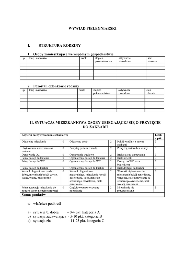 WYWIAD PIELĘGNIARSKI I. STRUKTURA RODZINY 1. Osoby zamieszkujące we wspólnym gospodarstwie Lp. Imię i nazwisko wiek stopień pokrewieństwa aktywność zawodowa stan zdrowia 2. Pozostali członkowie rodziny Lp. Imię i nazwisko wiek stopień pokrewieństwa aktywność zawodowa stan zdrowia II. SYTUACJA MIESZKANIOWA OSOBY UBIEGAJĄCEJ SIĘ O PRZYJĘCIE DO ZAKŁADU Kryteria oceny sytuacji mieszkaniowej Oddzielne mieszkanie 0 Oddzielny pokój 2 Usytuowanie mieszkania na parterze Ogrzewanie OC Pełny dostęp do łazienki Pełny dostęp do WC 0 Powyżej parteru z windą 2 0 0 0 Ogrzewanie węglowe Ograniczony dostęp do łazienki Ograniczony dostęp do WC 2 2 2 Pełny dostęp do kuchni Warunki higieniczne bardzo dobre, mieszkanie/pokój czyste, suche, widne, przestronne 0 0 2 2 Pełna adaptacja mieszkania do potrzeb osoby niepełnosprawnej 0 Ograniczony dostęp do kuchni Warunki higieniczne zadawalające, mieszkanie /pokój dość czyste, korzystanie ze sztucznego oświetlenia, mało przestronne Częściowo przystosowane mieszkanie Suma punktów • właściwe podkreśl a) sytuacja b. dobra – 0-4 pkt. kategoria A b) sytuacja zadawalająca - 5-10 pkt. kategoria B c) sytuacja zła - 11-25 pkt. kategoria C 2 Pokój wspólny z innymi osobami Powyżej parteru bez windy Brak stałego ogrzewania Brak łazienki Dostęp do WC poza budynkiem Brak dostępu do kuchni Warunki higieniczne złe, mieszkanie/pokój zaniedbane, wilgotne, stałe korzystanie ze sztucznego oświetlenia, brak wolnej przestrzeni Mieszkanie nie przystosowane Liczb a pkt. 3 3 3 3 3 3 3 3 III. OCENA WYDOLNOŚCI OPIEKUŃCZEJ RODZINY/ŚRODOWISKA Zakres sprawowanej opieki Pełna wydolność opiekuńcza rodziny Niepełna wydolność opiekuńcza rodziny( zaangażowanie innych osób) Brak opieki ze strony rodziny- pełna zależność od osób obcych IV. kategoria A B C ROZPOZNANIE PROBLEMÓW PIELĘGNACYJNYCH ....................................................................................................................................................... ....................................................................................................................................................... ....................................................................................................................................................... ....................................................................................................................................................... ....................................................................................................................................................... ....................................................................................................................................................... Zakres wymaganej opieki Nie wymaga ciągłej opieki pielęgniarskiej Wymaga ciągłej opieki pielęgniarskiej Wymaga kompleksowej intensywnej opieki pielęgniarskiej kategoria A B C ŁĄCZNIE UZYSKANE KATEGORIE W CZĘŚCIACH II-IV Data i podpis pielęgniarki przeprowadzającej wywiad ......................................................................................................................................... ............. Wyrażam / nie wyrażam zgody na gromadzenie i przechowywanie danych osobowych dotyczących osoby ubiegającej się o skierowanie do zakładu ......................................................................................................................................................