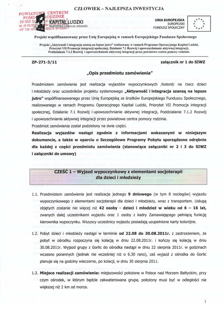 1 1.4. Wykonawca będący organizatorem wyjazdu zapewni: 1.4.1 realizację pobytu na wyjeździe dla nie więcej niż 42 dzieci i młodzieży, zgodnie z rozporządzeniem Ministra Edukacji Narodowej z dnia 21 stycznia 1997 r. w sprawie warunków jakie muszą spełniać organizatorzy wypoczynku dla dzieci i młodzieży szkolnej, a także zasad jego organizowania i nadzorowania ze zmianami wynikającymi z rozporządzenia Ministra Edukacji Narodowej z dnia 09 grudnia 2009 r. (Dz. U. z 2009r. nr 218 poz. 1696), zwany dalej rozporządzeniem. Dopełnienie wszystkich obowiązków wynikających z w/w rozporządzenia należy do Wykonawcy, z wyłączeniem kierownika wypoczynku, którego zapewnienia Zamawiający. 1.4.2 zakwaterowanie w obiekcie, który spełnia następujące warunki: 1.4.2.1 1.4.2.2 1.4.2.3 1.4.2.4 zapewnia zakwaterowanie uczestników wyjazdu w dwu/trzy/cztero - osobowych pokojach: z pełnym węzłem sanitarnym – wc, umywalka, natrysk w każdym pokoju (z całodobowym dostępem do ciepłej i zimnej wody) lub w pokojach typu studio tj. jedna łazienka z pełnym węzłem sanitarnym (spełniającym w/w wymogi) na dwa/trzy pokoje. Uczestnicy wyjazdu muszą być usytuowani w pokojach blisko siebie, w jednym budynku. Zamawiający nie dopuszcza możliwości zakwaterowania osób różnych płci w tym samym pokoju. Zamawiający wymaga, aby osoba z jego kadry (kierownik wypoczynku) była zakwaterowana w samodzielnym pokoju. Szczegóły dotyczące rozmieszczenia poszczególnych osób w pokojach zostaną ustalone z Wykonawcą na 3 dni przed rozpoczęciem wyjazdu. wyposażenie pokoi w jednoosobowe łóżka z pościelą (wyklucza się łóżka piętrowe), szafy ubraniowe, krzesła, stoliki, szafki przy łóżkach, bazę rekreacyjno – sportową, przez co Zamawiający rozumie co najmniej: 1 utwardzone boisko sportowe (na terenie ośrodka lub usytuowane w odległości nie większej niż ok. 300 m), 1 salę/salkę sportową (na terenie ośrodka) do prowadzenia zajęć ruchowych (tanecznych) dla uczestników wyjazdu - w podziale na 3 grupy po ok. 15 osób/gr., 1 salę szkoleniową (na terenie ośrodka) wyposażoną w stoły i krzesła, przystosowaną do przeprowadzenia zajęć socjoterapeutycznych dla grupy uczestników wyjazdu - ok. 15 osób/gr., zajęcia prowadzone będą dla 3 grup - przed i po południu, w dniach wskazanych w Szczegółowym Programie Pobytu. 1.4.3 przejazd uczestnikom wyjazdu (42 os.) i 1 osoby z kadry Zamawiającego na trasie Gorlice – miejsce pobytu na wyjeździe – Gorlice (dojazd + powrót), sprawnym autokarem w wersji turystycznej, wyposażonym w klimatyzację, toaletę i apteczkę. Wykonawca pokryje także koszty ewentualnych opłat: parkingowych na postojach, wjazdów na autostrady itp. 1.4.4 dwudaniowy obiad z kompotem dla każdego uczestnika wyjazdu, w czasie zorganizowanej minimum 1 godzinnej przerwy w trakcie przejazdu z Gorlic do ośrodka (w dniu 22.08.2011r.) Wykonawca pokryje koszt zapewnienia w/w posiłku. Dodatkowo, w dniu wyjazdu (30.08.2011 r.) Wykonawca przekaże każdemu uczestnikowi prowiant na drogę, tj. 2 bułki (z wędliną, serem żółtym, pomidorem i ogórkiem), co najmniej 0,75 l napojów, pakowanych w osobnych butelkach: woda mineralna i napój owocowy / sok / woda smakowa itp, 1.4.5 całodzienne wyżywienie dla 42 uczestników wyjazdu i 1 osoby z kadry Zamawiającego, składające się z czterech posiłków: śniadanie, dwudaniowy obiad + deser, podwieczorek (np. drożdżówka, jogurt owocowy z bułką np. maślaną) i kolacja, z zastrzeżeniem, iż pobyt rozpoczyna i kończy się kolacją. Żywienie powinno odbywać się zgodnie z zasadami racjonalnego żywienia oraz z zachowaniem zasad higieny, 2 1.4.6 na każdy dzień dla każdego uczestnika wyjazdu 1,0 l napoju w osobnych butelkach, w tym: 1 x 0,5l soku / napoju owocowego (typu np. Kubuś, Tarczyn, Tymbark) i 1 x 0,5 l wody mineralnej gazowanej / niegazowanej, 1.4.7 wykwalifikowaną kadrę, tj.: 1.4.7.1 3 osoby, które spełniają wymogi określone w rozporządzeniu, do pełnienia funkcji opiekunów – wychowawców dla trzech grup uczestników wyjazdu podzielonych według wieku – dzieci i młodzież, którzy są podopiecznymi rodzin zastępczych lub pochodzą z dysfunkcjonalnych rodzin / środowisk. Zamawiający wymaga, aby w autokarze na czas przejazdu z Gorlic do ośrodka oraz z ośrodka do Gorlic byli obecni co najmniej dwaj opiekunowie – wychowawcy. Zamawiający nie dopuszcza możliwości potraktowania kierowcy / kierowców autokaru jako opiekuna / opiekunów grupy w czasie przejazdów. W czasie pobytu uczestników wyjazdu w ośrodku, poza zajęciami przeprowadzanymi przez specjalistów, wychowawcy przygotują i zorganizują zajęcia: sportowe, orientacji w terenie, plastyczne, quizy, chrzest kolonijny, igrzyska itp. Wykonawca zobowiązany jest do zorganizowania i przeprowadzenia minimum 3 konkursów oraz zapewnienia dyplomów i nagród w postaci słodyczy np. czekolada, baton. Do obowiązków Wykonawcy należy ponadto zapewnienie: niezbędnych materiałów typu gry planszowe, piłki do gry w koszykówkę, siatkówkę, piłkę nożną, paletki i lotki do gry w badmintona, rakietki i piłeczki do gry w tenisa stołowego, w ilości umożliwiającej przeprowadzenie w/w zajęć, 1.4.7.2 2 osoby prowadzące jednocześnie zajęcia socjoterapeutyczne dla uczestników wyjazdu, podzielonych na 3 grupy po ok. 15 osób/gr, w łącznym wymiarze 36 godzin zegarowych (na 1 prowadzącego): 4 spotkania po 3 godziny/spotkanie/grupę. Każdy prowadzący musi posiadać wykształcenie wyższe i ukończone studia podyplomowe lub kurs z zakresu socjoterapii i każdy z nich musi posiadać doświadczenie w prowadzeniu tego typu form wsparcia dla dzieci lub młodzieży (co najmniej 1 przeprowadzone zajęcia grupy socjoterapeutycznej w ciągu ostatnich 3 lat). Zakres merytoryczny w/w zajęć obejmuje w szczególności: 1.4.7.2.1 1.4.7.2.2 1.4.7.2.3 1.4.7.2.4 1.4.7.2.5 1.4.7.2.6 1.4.7.2.7 1.4.7.2.8 1.4.7.2.9 