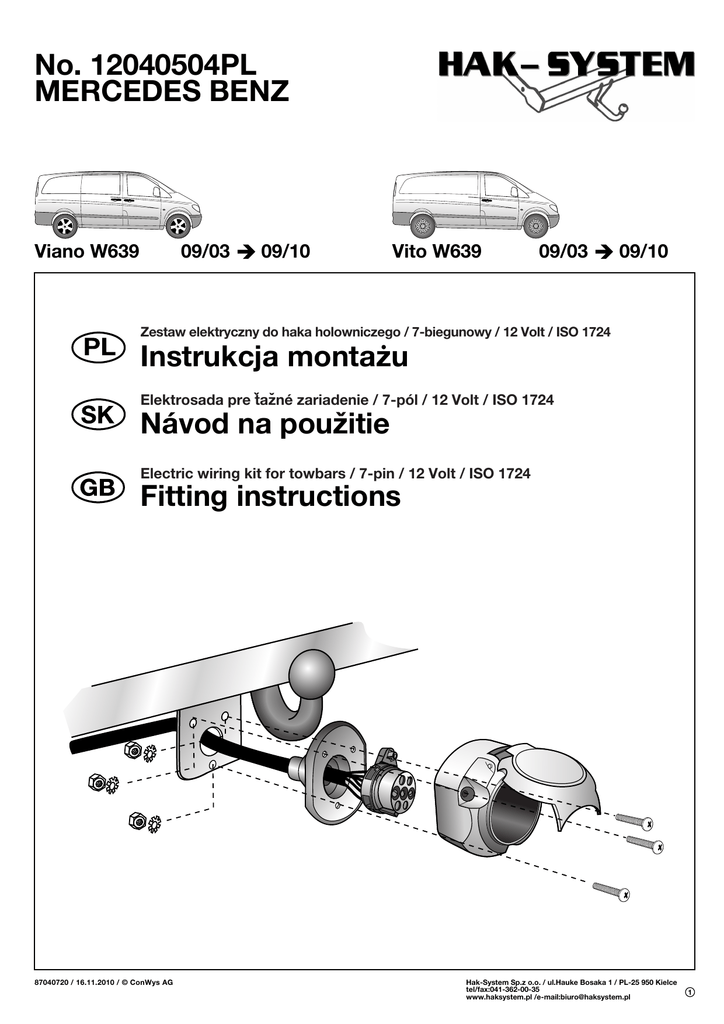 No. 12040504PL MERCEDES BENZ Viano W639 09/03 09/10 Vito W639 09/03 09/10 Zestaw elektryczny do haka holowniczego / 7-biegunowy / 12 Volt / ISO 1724 Instrukcja montazu Elektrosada pre tazné zariadenie / 7-pól / 12 Volt / ISO 1724 Návod na pouzitie Electric wiring kit for towbars / 7-pin / 12 Volt / ISO 1724 Fitting instructions 87040720 / 16.11.2010 / © ConWys AG Hak-System Sp.z o.o. / ul.Hauke Bosaka 1 / PL-25 950 Kielce tel/fax:041-362-00-35 www.haksystem.pl /e-mail:[email protected] 1 UWAGA! POZOR! Przed rozpoczeciem montazu wiazki elektrycznej nalezy dokladnie zapoznac sie z dolaczona instrukcja. Po zamontowaniu wiazki do samochodu instrukcje montazu nalezy dolaczyc do dokumentacji samochodu. Montaz wiazki elektrycznej musi byc przeprowadzony przez specialistyczny warsztat samochodowy. Montaz wiazki przez osoby niewykwalifikowane, lub dokonywanie zmian w polaczeniach wiazki (niezgodnych z dolaczona instrukcja) powoduje utrate gwarancji. Zamiana elektronicznych podzespolow w wiazce jest zabroniona. W przypadku jazdy bez przyczepy reduktory nie moga pozostawac w gniezdzie. Za wszystkie zmiany techniczne i elektroniczne dokonane w samochodzie lub w przyczepie po montazu wiazki i majace bezposredni wplyw na jej dzialanie nie bierzemy odpowiedzialnosci. Miedzy modulem sterujacym w wiazce elektrycznej a modulem sterujacym samochodu nie ma bezposredniej komunikacji. W przypadku gdy modul sterujacy samochodu generuje komunikat o bledach, ktore sa bezposredni lub posrednio spowodowane przez modul wiazki elektrycznej, nalezy ten modul odlaczyc i przeprowadzic test ponownie. Zmiany w instrukcji montazu wiazki dotyczace konstrukcji, wyposazenia kolorow, bledow moga sie zdarzyc. W przypadku gdy przyczepa nie jest wyposazona w swiatlo przeciwmgielne, nalezy je zamontowac. Montaz tejto elektrosady musi byt prevedena v specializovanom servise alebo primerane kvalifikovanou osobou. Pred zacatim montaze je nutne dokladne si precitat navod na pouzitie. Po ukonceni montaze je potrebne tento navod odlozit ku servisnym dokumentom vozidla. Pri neodbornej montazi alebo zmene elektrosady, pripadne zmene existujucich suciastok, zanika akykolvek narok na zaruku.Pri jazde bez privesu je nutne odpojit adapter zo zasuvky (ak je tento v prevadzke). Zmeny tykajuce sa konstrukcie, vybavenia, farieb,ako aj omyly su vyhradene. Vsetky specifikacie a ilustracie su nezavazne. Za technicke zmeny, pripadne zmeny elektroniky, ktore boli uskutocnene vyrobcom vozidla po uvedeni elektrosady do prevadzky, a ktore vedu k chybnym funkciam zasuvky alebo pridavnych zariadeni, nepreberame ziadnu zaruku. Modul privesu nie je schopny komunikovat s diagnostickym zariadenim . V pripade, ze testovacie mechanizmy generuju chybny protokol pri diagnoze, suvisiaci ci uz priamo alebo nepriamo s prevadzkou privesu, je nutne odpojit modul privesu od elektrosady a opakovane vykonat diagnozu. IMPORTANT! Ak prives nie je vybaveny hmlovym svetlom, je potrebne ho dodatocne namontovat. Installation of the towing electrics kit must be undertaken by a specialist workshop or an appropriately qualified person. Before starting work, you must read the installation instructions through completely. After installing the towing electrics kit, the installation instructions should be kept with the vehicle service documentation. In case of missing a rear fog lamp on the trailer, it should be retrofitted. All claims under the guarantee will lapse in case of improper use or modification of the towing electrics kit or any of its component parts. When driving without a trailer or load carrier, any adapter installed must be removed from the electrical socket. We reserve the right to alter the design, content or colour. We accept no liability for any errors in these instructions. All details and illustrations are nonbinding. The trailer module is not diagnostics-capable. If the manufacturer’s diagnostics processes or software-supported test mechanisms generate error reports directly or indirectly linked with trailer operation, the trailer module must be disconnected from the leads to the trailer socket and a new diagnostic process initiated. 87040720 / 16.11.2010 / © ConWys AG We accept no responsibility and give no guarantee for technical and electrical modifications made after the initial operation of the towing electrics kit by the vehicle manufacturer and which may lead, for example to malfunction of the trailer socket or its peripheries. Hak-System Sp.z o.o. / ul.Hauke Bosaka 1 / PL-25 950 Kielce tel/fax:041-362-00-35 www.haksystem.pl /e-mail:[email protected] 2 2x 3x 2x 10x 5x 90270328 12 6-11 17-21 87040720 / 16.11.2010 / © ConWys AG 3-4, 13-16 Hak-System Sp.z o.o. / ul.Hauke Bosaka 1 / PL-25 950 Kielce tel/fax:041-362-00-35 www.haksystem.pl /e-mail:[email protected] 3 o C o C UWAGA! POZOR! PL SK Wydajnosc ukladu chlodzenia w zaleznosci od mozliwosci musi byc zwiekszona w przypadku zamontowania dodatkowego wyposazenia (hak holowniczy). Prosze koniecznie dbac o zalecenie producenta samochodu!! IMPORTANT! The vehicle's cooling capacity may have to be increased when retrofitting a trailer coupling! You must observe the manu-facturer's instructions!! Vykon chladica vozidla musi byt pri doplneni vybavy o tazne zariadenie podla moznosti zvyseny! Prosim bezpodmienecne dbat na pokyny vyrobcu!! MANUAL UWAGA! POZOR! PL SK IMPORTANT! Aby zapobiec zbytecznym bledom w elektronice samochodu, nalezy przed rozpoczeciem montazu wiazki odlaczyc kleme (-) MINUS od akumulatora! Aby sa zabranilo zbytocnym chybam v palubnej sieti, musi byt odpojena akumulatorova svorka na negativny (minus) pol este pred zacatim montaze! In order to avoid mal-functions and damage to the vehicle’s electrical system the earth terminal must be disconnected from the vehicle’s battery before starting work! W przypadku nie odlaczenia klemy, szczegolnie przy montazu modulu CFC (CAN Bus) moze nastapic uszkodzenie tego modulu w wiazce jak rowniez uszkodzenie modulu sterujacego w samochodzie! Obzvla
