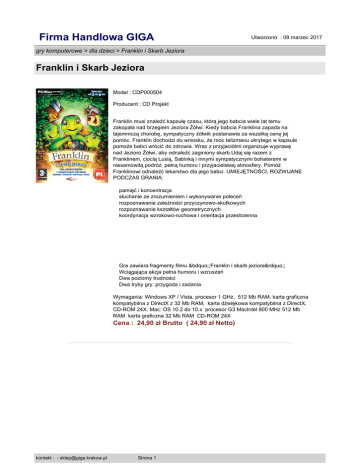 Firma Handlowa GIGA Utworzono : 08 marzec 2017 gry komputerowe > dla dzieci > Franklin i Skarb Jeziora Franklin i Skarb Jeziora Model : CDP000504 Producent : CD Projekt Franklin musi znaleźć kapsułę czasu, którą jego babcia wiele lat temu zakopała nad brzegiem Jeziora Żółwi. Kiedy babcia Franklina zapada na tajemniczą chorobę, sympatyczny żółwik postanawia za wszelką cenę jej pomóc. Franklin dochodzi do wniosku, że moc talizmanu ukrytego w kapsule pomoże babci wrócić do zdrowia. Wraz z przyjaciółmi organizuje wyprawę nad Jezioro Żółwi, aby odnaleźć zaginiony skarb.Udaj się razem z Franklinem, ciocią Lusią, Sabinką i innymi sympatycznymi bohaterami w niesamowitą podróż, pełną humoru i przyjacielskiej atmosfery. Pomóż Franklinowi odnaleźć lekarstwo dla jego babci. UMIEJĘTNOŚCI, ROZWIJANE PODCZAS GRANIA: pamięć i koncentracja słuchanie ze zrozumieniem i wykonywanie poleceń rozpoznawanie zależności przyczynowo-skutkowych rozpoznawanie kształtów geometrycznych koordynacja wzrokowo-ruchowa i orientacja przestrzenna Gra zawiera fragmenty filmu „;Franklin i skarb jeziora”; Wciągająca akcja pełna humoru i wzruszeń Dwa poziomy trudności Dwa tryby gry: przygoda i zadania Wymagania: Windows XP / Vista, procesor 1 GHz, 512 Mb RAM, karta graficzna kompatybilna z DirectX z 32 Mb RAM, karta dźwiękowa kompatybilna z DirectX, CD-ROM 24X. Mac: OS 10.2 do 10.x procesor G3 MacIntel 800 MHz 512 Mb RAM karta graficzna 32 Mb RAM CD-ROM 24X Cena : 24,90 zł Brutto ( 24,90 zł Netto) kontakt : - [email protected] Strona 1