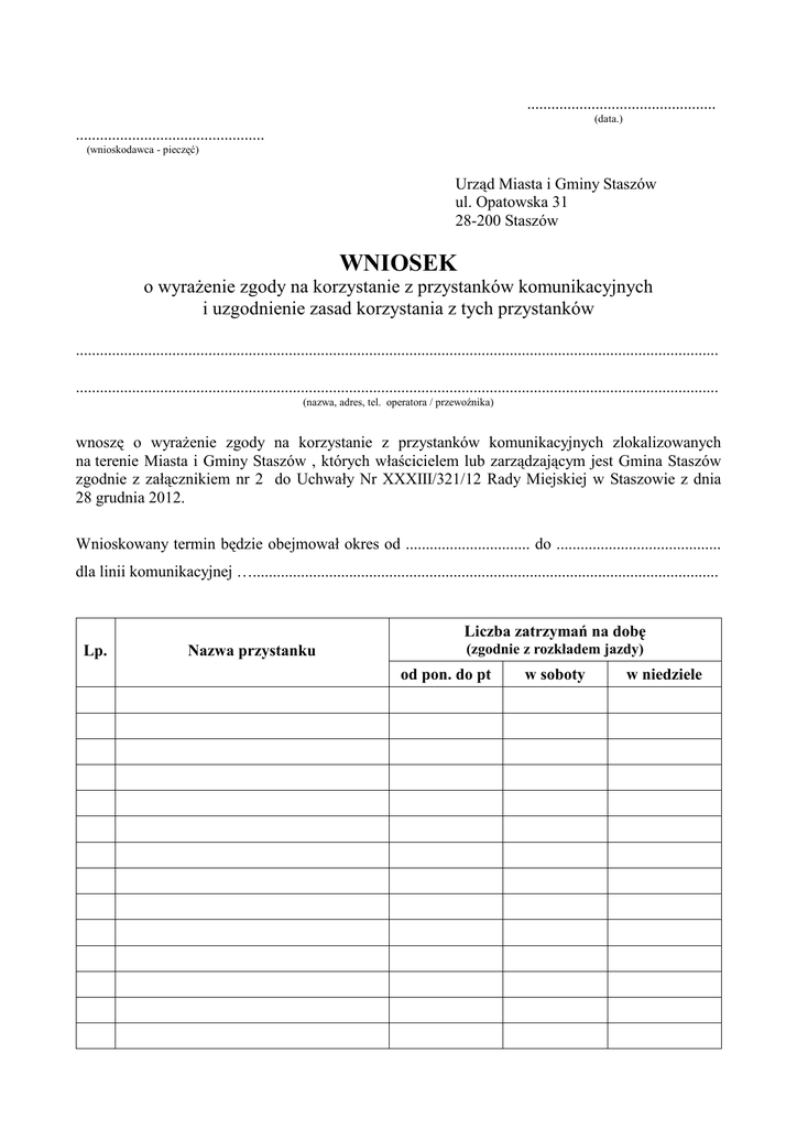 ............................................... (data.) ............................................... (wnioskodawca - pieczęć) Urząd Miasta i Gminy Staszów ul. Opatowska 31 28-200 Staszów WNIOSEK o wyraŜenie zgody na korzystanie z przystanków komunikacyjnych i uzgodnienie zasad korzystania z tych przystanków ................................................................................................................................................................ ................................................................................................................................................................ (nazwa, adres, tel. operatora / przewoźnika) wnoszę o wyraŜenie zgody na korzystanie z przystanków komunikacyjnych zlokalizowanych na terenie Miasta i Gminy Staszów , których właścicielem lub zarządzającym jest Gmina Staszów zgodnie z załącznikiem nr 2 do Uchwały Nr XXXIII/321/12 Rady Miejskiej w Staszowie z dnia 28 grudnia 2012. Wnioskowany termin będzie obejmował okres od ............................... do ......................................... dla linii komunikacyjnej ….................................................................................................................... Liczba zatrzymań na dobę Lp. Nazwa przystanku (zgodnie z rozkładem jazdy) od pon. do pt w soboty w niedziele Jednocześnie oświadczam, Ŝe akceptuję warunki i zasady korzystania z przystanków komunikacyjnych określone w załączniku nr 1 do Uchwały Nr XXXIII/321/12 Rady Miejskiej w Staszowie z dnia 28 grudnia 2012 w sprawie określenia przystanków komunikacyjnych, których właścicielem lub zarządzającym jest Gmina Staszów oraz warunków i zasad korzystania z tych przystanków. Do wniosku załączam:* 1. Projekt rozkładu jazdy, uwzględniający przystanki, godziny odjazdów środku transportowych, długość linii komunikacyjnej podaną w kilometrach i odległości między przystankami. 2. Wykaz obsługiwanych przystanków, określonych zgodnie z załącznikiem Nr 2 do do Uchwały Nr XXXIII/321/12 Rady Miejskiej w Staszowie z dnia 28 grudnia 2012 r. 3. Mapę połączeń komunikacyjnych z zaznaczoną linią komunikacyjną i przystankami. 4. Kserokopię zezwolenia na wykonywanie regularnych przewozów osób w krajowym rejestrze drogowym. 5. Kserokopię obowiązującego rozkładu jazdy poświadczona za zgodność z oryginałem. ................................................... (podpis wnioskodawcy) Uwaga! W przypadku braku kompletu dokumentów wnioskodawca zostanie wezwany do ich uzupełnienia. * Niepotrzebne skreślić.