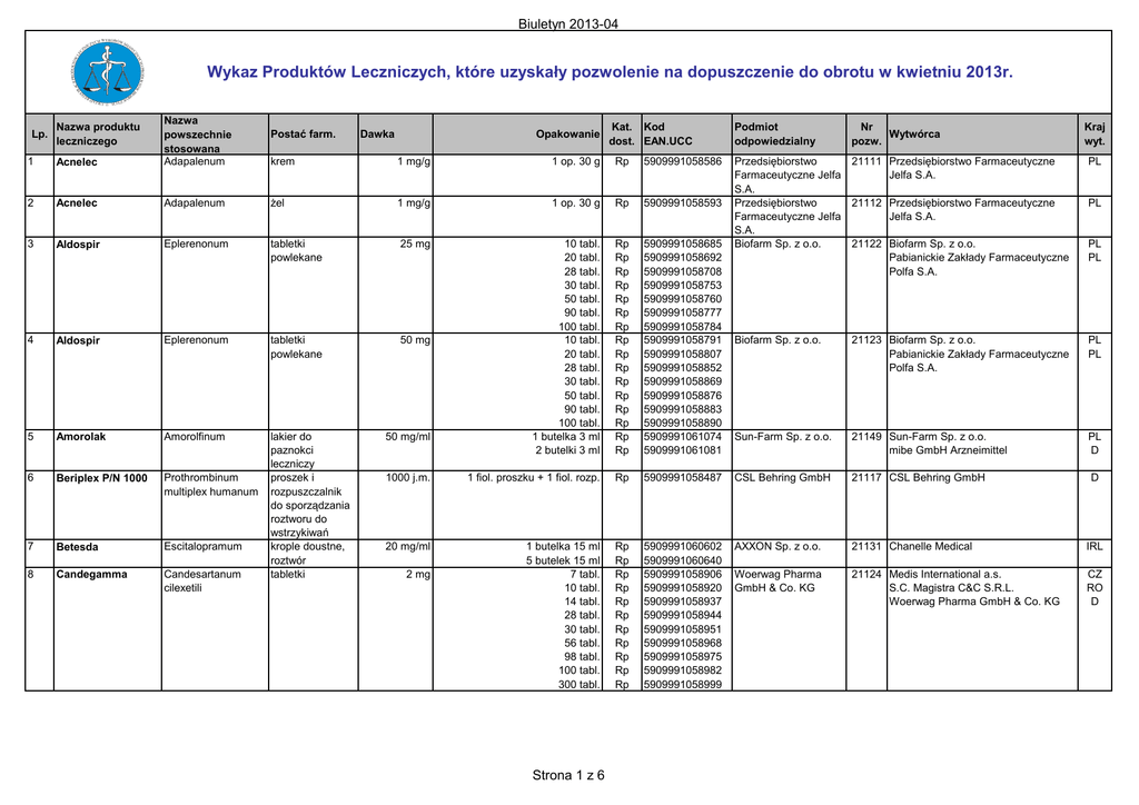 Biuletyn 2013-04 I PRODUKT CH ÓW NY BI CZ PRODUKTÓW CJI LE RA C ST YROBÓ W CH W ME ZY IC DY ZN Wykaz Produktów Leczniczych, które uzyskały pozwolenie na dopuszczenie do obrotu w kwietniu 2013r. CZ ÓJ OB YCH URZĄ D RE JE 1 Acnelec Nazwa powszechnie stosowana Adapalenum 2 Acnelec 3 Lp. Nazwa produktu leczniczego Postać farm. Dawka Opakowanie Kat. Kod dost. EAN.UCC krem 1 mg/g 1 op. 30 g Rp 5909991058586 Adapalenum żel 1 mg/g 1 op. 30 g Rp 5909991058593 Aldospir Eplerenonum tabletki powlekane 25 mg 4 Aldospir Eplerenonum tabletki powlekane 50 mg 5 Amorolak Amorolfinum Rp Rp Rp Rp Rp Rp Rp Rp Rp Rp Rp Rp Rp Rp Rp Rp 5909991058685 5909991058692 5909991058708 5909991058753 5909991058760 5909991058777 5909991058784 5909991058791 5909991058807 5909991058852 5909991058869 5909991058876 5909991058883 5909991058890 5909991061074 5909991061081 6 Beriplex P/N 1000 Prothrombinum multiplex humanum 1000 j.m. 1 fiol. proszku + 1 fiol. rozp. Rp 7 Betesda Escitalopramum 20 mg/ml 8 Candegamma Candesartanum cilexetili lakier do paznokci leczniczy proszek i rozpuszczalnik do sporządzania roztworu do wstrzykiwań krople doustne, roztwór tabletki 10 tabl. 20 tabl. 28 tabl. 30 tabl. 50 tabl. 90 tabl. 100 tabl. 10 tabl. 20 tabl. 28 tabl. 30 tabl. 50 tabl. 90 tabl. 100 tabl. 1 butelka 3 ml 2 butelki 3 ml 1 butelka 15 ml 5 butelek 15 ml 7 tabl. 10 tabl. 14 tabl. 28 tabl. 30 tabl. 56 tabl. 98 tabl. 100 tabl. 300 tabl. Rp Rp Rp Rp Rp Rp Rp Rp Rp Rp Rp 50 mg/ml 2 mg Strona 1 z 6 Podmiot odpowiedzialny Nr Wytwórca pozw. Kraj wyt. Przedsiębiorstwo 21111 Przedsiębiorstwo Farmaceutyczne Farmaceutyczne Jelfa Jelfa S.A. S.A. Przedsiębiorstwo 21112 Przedsiębiorstwo Farmaceutyczne Farmaceutyczne Jelfa Jelfa S.A. S.A. Biofarm Sp. z o.o. 21122 Biofarm Sp. z o.o. Pabianickie Zakłady Farmaceutyczne Polfa S.A. PL Biofarm Sp. z o.o. 21123 Biofarm Sp. z o.o. Pabianickie Zakłady Farmaceutyczne Polfa S.A. PL PL Sun-Farm Sp. z o.o. 21149 Sun-Farm Sp. z o.o. mibe GmbH Arzneimittel PL D 5909991058487 CSL Behring GmbH 21117 CSL Behring GmbH D 5909991060602 5909991060640 5909991058906 5909991058920 5909991058937 5909991058944 5909991058951 5909991058968 5909991058975 5909991058982 5909991058999 AXXON Sp. z o.o. 21131 Chanelle Medical IRL Woerwag Pharma GmbH & Co. KG 21124 Medis International a.s. S.C. Magistra C&C S.R.L. Woerwag Pharma GmbH & Co. KG CZ RO D PL PL PL Biuletyn 2013-04 Nazwa produktu Lp. leczniczego 9 Candegamma 10 Candegamma 11 Nazwa powszechnie stosowana Candesartanum cilexetili Postać farm. Dawka Opakowanie tabletki 4 mg Candesartanum cilexetili tabletki 8 mg Candegamma Candesartanum cilexetili tabletki 16 mg 12 Candegamma Candesartanum cilexetili tabletki 32 mg 13 Carzap HCT Candesartanum cilexetili + Hydrochlorothiazidu m tabletki 32 mg + 12,5 mg 14 Carzap HCT Candesartanum cilexetili + Hydrochlorothiazidu m tabletki 32 mg + 25 mg Kat. Kod dost. EAN.UCC Podmiot odpowiedzialny Nr Wytwórca pozw. Kraj wyt. 7 tabl. 10 tabl. 14 tabl. 28 tabl. 30 tabl. 56 tabl. 98 tabl. 100 tabl. 300 tabl. 7 tabl. 10 tabl. 14 tabl. 28 tabl. 30 tabl. 56 tabl. 98 tabl. 100 tabl. 300 tabl. 7 tabl. 10 tabl. 14 tabl. 28 tabl. 30 tabl. 56 tabl. 98 tabl. 100 tabl. 300 tabl. 7 tabl. 10 tabl. 14 tabl. 28 tabl. 30 tabl. 56 tabl. 98 tabl. 100 tabl. 300 tabl. 28 tabl. Rp Rp Rp Rp Rp Rp Rp Rp Rp Rp Rp Rp Rp Rp Rp Rp Rp Rp Rp Rp Rp Rp Rp Rp Rp Rp Rp Rp Rp Rp Rp Rp Rp Rp Rp Rp Rp 5909991059002 5909991059026 5909991059033 5909991059040 5909991059057 5909991059064 5909991059071 5909991059088 5909991059095 5909991059101 5909991059132 5909991059149 5909991059156 5909991059163 5909991059170 5909991059187 5909991059194 5909991059200 5909991059224 5909991059231 5909991059248 5909991059255 5909991059262 5909991059279 5909991059286 5909991059293 5909991059309 5909991059330 5909991059347 5909991059354 5909991059361 5909991059378 5909991059385 5909991059392 5909991059408 5909991059439 5909991057596 Woerwag Pharma GmbH & Co. KG 21125 Medis International a.s. S.C. Magistra C&C S.R.L. Woerwag Pharma GmbH & Co. KG CZ RO D Woerwag Pharma GmbH & Co. KG 21126 Medis International a.s. S.C. Magistra C&C S.R.L. Woerwag Pharma GmbH & Co. KG CZ RO D Woerwag Pharma GmbH & Co. KG 21127 Medis International a.s. S.C. Magistra C&C S.R.L. Woerwag Pharma GmbH & Co. KG CZ RO D Woerwag Pharma GmbH & Co. KG 21128 Medis International a.s. S.C. Magistra C&C S.R.L. Woerwag Pharma GmbH & Co. KG CZ RO D Zentiva, k.s. CY SK RO D PL 28 tabl. Rp 5909991058609 Zentiva, k.s. 21119 Aegis Ltd HBM Pharma s.r.o. S.C. Zentiva S.A. Winthrop Arzneimittel GmbH Zakłady Farmaceutyczne POLPHARMA S.A. 21120 Aegis Ltd HBM Pharma s.r.o. S.C. Zentiva S.A. Winthrop Arzneimittel GmbH Zakłady Farmaceutyczne POLPHARMA S.A. Strona 2 z 6 CY SK RO D PL Biuletyn 2013-04 Nazwa produktu Lp. leczniczego Nazwa powszechnie stosowana Cefotaximum 15 Cefotaxime FarmaPlus 16 Cefotaxime FarmaPlus Cefotaximum 17 Cefotaxime FarmaPlus Cefotaximum 18 Claritine Allergy Loratadinum 19 Exemestan Sandoz Exemestanum 20 Eziclen 21 FUSACID H 22 Gripex ActiCaps 23 Postać farm. proszek do sporządzania roztworu do wstrzykiwań proszek do sporządzania roztworu do wstrzykiwań proszek do sporządzania roztworu do wstrzykiwań lub do infuzji syrop tabletki powlekane Dawka Opakowanie Kat. Kod dost. EAN.UCC Podmiot odpowiedzialny Nr Wytwórca pozw. Kraj wyt. 500 mg 10 fiol. proszku Lz 5909991061173 FarmaPlus AS 21142 Strides Arcolab Polska Sp. z o.o. PL 1g 10 fiol. proszku Lz 5909991061159 FarmaPlus AS 21143 Strides Arcolab Polska Sp. z o.o. PL 2g 10 fiol. proszku Lz 5909991061166 FarmaPlus AS 21144 Strides Arcolab Polska Sp. z o.o. PL 1 mg/ml 1 butelka 60 ml OTC 5909991058272 MSD Polska Sp. z o.o. 21121 Schering-Plough Labo N.V. 25 mg 28 tabl. 30 tabl. 90 tabl. Rp Rp Rp 5909991058654 5909991058661 5909991058678 Sandoz GmbH B 21113 Accord Healthcare Ltd Cemelog BRS Ltd. S.C. Sandoz S.R.L. Salutas Pharma GmbH 21110 Beaufour Ipsen Industrie GB H RO D F Natrii sulfas anhydricus + Magnesii sulfas heptahydricus + Kalii sulfas Acid