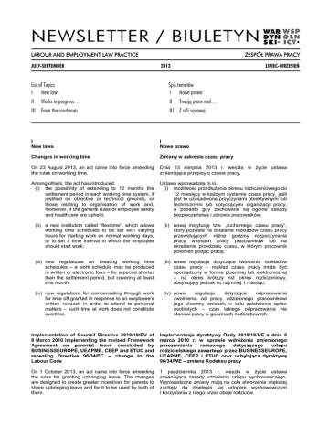 NEWSLETTER / BIULETYN BIULETY N LABOUR AND EMPLOYMENT LAW PRACTICE JULY-SEPTEMBER List of Topics I New laws II Works in progress… III From the courtroom ZESPÓŁ PRAWA PRACY 2013 LIPIEC-WRZESIEŃ Spis tematów I Nowe prawo II Trwają prace nad… III Z sali sądowej I New laws I Nowe prawo Changes in working time Zmiany w zakresie czasu pracy On 23 August 2013, an act came into force amending the rules on working time. Dnia 23 sierpnia 2013 r. weszła w życie ustawa zmieniająca przepisy o czasie pracy. Among others, the act has introduced: (i) the possibility of extending to 12 months the settlement period in each working time system, if justified on objective or technical grounds, or those relating to organisation of work and, moreover, if the general rules of employee safety and healthcare are upheld; Ustawa wprowadziła m.in.: (i) możliwość przedłużenia okresu rozliczeniowego do 12 miesięcy w każdym systemie czasu pracy, jeśli jest to uzasadnione przyczynami obiektywnymi lub technicznymi lub dotyczącymi organizacji pracy, a ponadto gdy zachowane są ogólne zasady bezpieczeństwa i zdrowia pracowników; (ii) a new institution called “flexitime”, which allows working time schedules to be set with varying hours for starting work on normal working days, or to set a time interval in which the employee should start work; (ii) nową instytucję tzw. „ruchomego czasu pracy”, który pozwala na ustalanie rozkładów czasu pracy przewidujących różne godziny rozpoczynania pracy w dniach pracy pracowników lub na określenie przedziału czasu, w którym pracownik powinien podjąć pracę; (iii) new regulations on creating working time schedules – a work schedule may be produced in written or electronic form – for a period shorter than the settlement period, but covering at least one month; (iii) nowe regulacje dotyczące tworzenia rozkładów czasu pracy – rozkład czasu pracy może być sporządzony w formie pisemnej lub elektronicznej – na okres krótszy niż okres rozliczeniowy, obejmujący jednak co najmniej 1 miesiąc; (iv) new regulations for compensating through work for time off granted in response to an employee's written request, in order to attend to personal matters – such time at work does not constitute overtime. (iv) nowe regulacje dotyczące odpracowania zwolnienia od pracy udzielonego pracownikowi jego pisemny wniosek, w celu załatwienia spraw osobistych – czas takiego odpracowania nie stanowi pracy w godzinach nadliczbowych. Implementation of Council Directive 2010/18/EU of 8 March 2010 implementing the revised Framework Agreement on parental leave concluded by BUSINESSEUROPE, UEAPME, CEEP and ETUC and repealing Directive 96/34/EC – change to the Labour Code Implementacja dyrektywy Rady 2010/18/UE z dnia 8 marca 2010 r. w sprawie wdrożenia zmienionego porozumienia ramowego dotyczącego urlopu rodzicielskiego zawartego przez BUSINESSEUROPE, UEAPME, CEEP i ETUC oraz uchylająca dyrektywę 96/34/WE – zmiana Kodeksu pracy On 1 October 2013, an act came into force amending the rules for granting upbringing leave. The changes are designed to create greater incentives for parents to share upbringing leave and for it to be used by both of them. 1 października 2013 r. weszła w życie ustawa zmieniająca zasady udzielania urlopu wychowawczego. Wprowadzone zmiany mają na celu stworzenie większej zachęty do dzielenia się urlopem wychowawczym i korzystania z niego przez oboje rodziców. With regard to existing regulations, the amendment has introduced the following changes: (i) granting to each parent or guardian of the child the exclusive right to one month of upbringing leave without the option of transferring it to the other parent/guardian; W odniesieniu do dotychczasowych regulacji, nowelizacja wprowadziła m.in. następujące zmiany: (i) przyznanie każdemu z rodziców lub opiekunów dziecka wyłącznego prawa do jednego miesiąca urlopu wychowawczego bez możliwości przeniesienia go na drugiego rodzica/opiekuna; (ii) an increase from 3 to 4 months of the upbringing leave period, which both parents or guardians may use simultaneously; (ii) zwiększenie z 3 do 4 miesięcy okresu urlopu wychowawczego, z którego mogą jednocześnie korzystać oboje rodzice lub opiekunowie; (iii) an increase from 4 to 5 in the number of sections, in which the upbringing leave may be used; (iii) zwiększenie z 4 do 5 części, w których może być wykorzystany urlop wychowawczy; (iv) deletion of the rule of proportionality of annual leave for employees returning to work from upbringing leave during the course of a calendar year – after the entry into force of the new regulations, such employees are entitled to the full extent of leave; (iv) zniesienie zasady proporcjonalności urlopu wypoczynkowego w stosunku do pracownika powracającego z urlopu wychowawczego w trakcie roku kalendarzowego – po wejściu w życie nowych przepisów taki pracownik jest uprawniony do urlopu wypoczynkowego w pełnym wymiarze; (v) a rule that for the duration of upbringing leave the limitation period for annual leave claims does not start and, if started, is subject to suspension. (v) zasadę, że bieg przedawnienia roszczenia o urlop wypoczynkowy nie rozpoczyna się, a rozpoczęty ulega zawieszeniu na czas korzystania z urlopu wychowawczego. The minimum wage in 2014: PLN 1,680 Minimalne wynagrodzenie w 2014 r. – 1680 zł From 1 January 2014, pursuant to the Council of Ministers regulation of 11 September 2013, the new binding level of the minimum wage for work will be: PLN 1,680. Zgodnie z rozporządzeniem Rady Ministrów z dnia 11 września 2013 r. od 1 stycznia 2014 r. obowiązywać będzie nowa wysokość minimalnego wynagrodzenia za pracę: 1680 zł. II Work in progress… II Trwają prace nad… Changes in the rules governing work on Sundays and public holidays Zmiany w przepisach regulujących pracę w niedziele i święta On 24 May 2013, a members’ draft amendment