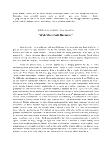 Przez adwent, roraty oraz w święta Bożego Narodzenia towarzyszyły nam figurki św. Rodziny z Nazaretu, które wyrzeźbił zanany wielu w parafii - pan Aron Knosala z Opola. A jaką rodzinę on sam na co dzień "rzeźbi"? Przekonajcie się sami, czytając opowieść o pięknej miłości: miłości do Boga, miłości małżeńskiej, a także miłości rodzicielskiej. Źródło - Gość Niedzielny - Anna Kwaśnicka "Wybrali cichość Nazaretu" Wybrali siebie i temu wyborowi byli wierni każdego dnia. Agnieszka, gdy dowiedziała się, że jest po raz kolejny w ciąży, odstawiła leki, by nie zaszkodzić życiu, które nosiła pod sercem. Gdy badania wykazały, że urodzi bliźniaki, z których jedno ma wadę genetyczną, przez myśl jej nie przeszło, by – jak to niektórzy lekarze jej podpowiadali – problem usunąć legalnie. Przed rokiem urodziła zdrową Elizę i Dawida, który ma zespół Downa. Siedem miesięcy później zdiagnozowano u niej ostrą białaczkę szpikową. Zmarła tego samego dnia, którego trafiła do szpitala. Jesteś mi przeznaczony. Z Aronem poznali się w drugiej połowie lat 80. w ruchu charyzmatycznym przy parafii św. Apostołów Piotra i Pawła w Opolu. Po raz pierwszy zobaczyłem Agnisię, kiedy przyszła na moje urodziny. Stała w drzwiach z lilią w rękach. Wyglądała jak anioł – opowiada Aron Knosala. To był czas, gdy oboje rozeznawali swoje powołanie. Aron myślał o Towarzystwie Jezusowym. Również Agnieszka była otwarta na myśli o pójściu do klasztoru. W 1989 roku na pielgrzymce na Jasną Górę prosiłem Jezusa o pomoc w wyborze drogi. Modliłem się, że jeśli miałbym wybrać stan małżeński, to proszę, by przeznaczona mi kobieta podeszła do mnie – wspomina Aron. Wtedy, w święto Matki Boskiej Częstochowskiej, po Apelu Jasnogórskim podeszła do mnie Agnisia. Drżącym głosem powiedziała mi, że wiele się modliła i rozeznała, że jestem jej przeznaczony. Zamurowało mnie. Aga miała chłopaka, a podeszła do mnie – opowiada Aron. Oboje pojechali do Starej Wsi na rekolekcje do o. Bronisława Mokrzyckiego SJ. Wrócili jako narzeczeni. Życie dla ewangelizacji. Razem założyli grupę ewangelizacyjną „Pantomima”. Występowali w parafiach, na ulicach. Grali przedstawienia w czasie Światowych Dni Młodzieży w Częstochowie. Byli aktywni, spalali się dla głoszenia słowa Bożego. Tego pragnęli. W ich codzienności było wiele znaków Bożej obecności. Choćby wtedy, gdy myśląc o ślubie, zastanawiali się, gdzie będą mieszkać. Nie mieli ani mieszkania, ani domu. Pojechali więc na Jasną Górę, by modlić się o pomoc, a gdy wieczorem wrócili, czekała na nich kartka: „Była pani z Naroka, chce ci wynająć dom na 5 lat”. – To był czas nasycania się Bożą miłością – podsumowuje Aron. Pobrali się na początku 1991 roku. Krótko po ślubie Agnieszka przeżyła traumatyczne wydarzenie. W dniu swoich urodzin, wracając z Półwsi do Naroka, nie zdążyła na autobus, więc łapała stopa. Kierowca, z którym pojechała, nie zatrzymał się w Naroku, ale dodał gazu i zaczął syczeć, że ją zabije. – Kiedy zaczęli dojeżdżać do linii lasu, Agusia zrozumiała, że za chwilę zginie. Zawołała do Boga, żałując, że nigdy nie urodzi dzieci, a marzyła o szóstce. Wtedy przed samochodem nagle pojawiło się światło, a kierowca zmienił swoje zachowanie. Wystraszył się, zaczął przepraszać, w końcu zatrzymał samochód, a Agnieszka uciekła. Miesiąc później inna dziewczyna w tym samym miejscu łapała stopa. Znaleziono ją martwą w lesie za Sławicami. Sądzę, że to był ten sam człowiek – mówi Aron, podkreślając, że jego żona wiedziała, że zostało jej darowane życie. Na pierwszym miejscu rodzina. Kiedy Agnieszka zaszła w ciążę, w naszym życiu zaczęło brakować czasu, pojawiło się zmęczenie, a także niepokój. Poprosiliśmy wtedy jeszcze błogosławioną s. Faustynę o pomoc i pojechaliśmy do o. Mokrzyckiego na rozmowę. Autostopem, 400 kilometrów. Wysłuchał nas i dał nam krótką receptę: „uciąć to wszystko”. Wszystko, czyli „Pantomimę”, ewangelizację, nasze funkcje we wspólnocie. „Jak to? Przecież podjąłem się tych zobowiązań” – pytałem. Ale o. Mokrzycki powiedział mi, że mocą daną przez Boga Kościołowi i kapłanom rozwiązuje te zobowiązania – wspomina Aron. Tak też zrobili, ucięli swoje zaangażowanie w ruchu. Ich decyzja nie została zrozumiana we wspólnocie. Usłyszeli wiele gorzkich słów, niemniej podjętej decyzji nie zmienili. Całe swoje zaangażowanie skierowali na rodzinę. Na świat przyszła Faustyna, dwa lata później Ania. – Gdy zbliżały się moje 33. urodziny, zastanawialiśmy się, co przyniesie „wiek Chrystusowy”, nasz nowy czas. Krótko po moich urodzinach Agnieszka bardzo ciężko zachorowała – opowiada. – By zająć się rodziną, zwolniłem się z pracy. Gotowałem, robiłem zakupy, zajmowałem się Agnisią i córeczkami, a nocą wykonywałem zlecenia. Tak naprawdę zawalił się nasz świat. Modliłem się, ale nic się nie działo. Nie było znaków, tak jak kiedyś – mówi. Po trzech latach choroba Agnieszki została zdiagnozowana. Otrzymała silne leki, które miały wiele skutków ubocznych. Utraciła swoją piękną, smukłą sylwetkę, jej krucze włosy mocno się przerzedziły. Nie narzekała. Akceptowała te zmiany. Tak jak wcześniej akceptowała przytyki, że zamiast kariery wybrała bycie kurą domową – podkreśla Aron. Z czasem na świat przyszły Oliwia i Patrycja. Szczęście w codzienności. Świadectwo Agnieszki i Arona pokazuje, że sukcesów w życiu małżeńskim i rodzinnym nie trzeba mierzyć kryteriami podpowiadanymi przez współczesną kulturę. Najważniejsze są wzajemna miłość i czas dla siebie. Trzeba być w pełni zaangażowanym w życie współmałżonka i dzieci. Agnieszka była intelektualistką, miała wyższe wykształcenie, a w