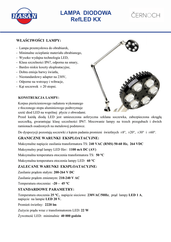 WŁAŚCIWOŚCI LAMPY: - Lampa przemysłowa do obrabiarek, Minimalne ocieplanie materiału obrabianego, Wysoko wydajna technologia LED, Klasa szczelności IP67, odporna na smary, Bardzo niskie koszty eksploatacyjne, Dobra emisja barwy światła, Niestandardowy adapter na 230V, Odporne na wstrząsy i wibracje, Kąt soczewek ± 20 stopni. KONSTRUKCJA LAMPY: Korpus pierścieniowego radiatora wykonanego z tłoczonego stopu aluminiowego podtrzymuje sześć diod LED na wspólnej płycie z obwodami. Przed każdą diodą LED jest umieszczona asferyczna szklana soczewka, zabezpieczona okrągłą uszczelką, gwarantując klasę szczelności IP67. Mocowanie lampy na trzech przegubach i dwóch ramionach osadzonych na metalowej podstawce. Do dyspozycji pozostają soczewki z kątem padania promieni świetlnych ±8°, ±20°, ±30° i ±60°. GRANICZNE WARUNKI EKSPLOATACYJNE: Maksymalne napięcie zasilania transformatora TS: 240 VAC (RMS) 50-60 Hz, 264 VDC Maksymalny prąd lampy LED Ifav: 1100 mA DC (AV) Maksymalna temperatura otoczenia transformatora TS: 50 °C Maksymalna temperatura otoczenia lampy LED: 60 °C ZALECANE WARUNKI EKSPLOATACYJNE: Zasilanie prądem stałym: 200-264 V DC Zasilanie prądem zmiennym: 210-240 V AC Temperatura otoczenia: -20 – 45 °C STANDARDOWE PARAMETRY: Temperatura otoczenia 25 °C, napięcie sieciowe 230VAC/50Hz, prąd lampy LED 1 A, napięcie na lampie LED 20 V. Promień świetlny: 2220 lm Zużycie prądu wraz z transformatorem LED: 22 W Żywotność LED: minimalnie 40 000 godzin WYMIARY: Wysokość podstawki: 46 mm Długość ramienia: 400 mm Średnica aluminiowego reflektora LED: 134 mm Wysokość reflektora łącznie z soczewkami: 54 mm Wymiary montażowe podstawki mocującej lampę LED: SPOSÓB ZAMAWIANIA: TYP Mocowanie REFLED/KX1/TS20D podstawka metalowa podstawka metalowa podstawka metalowa podstawka metalowa podstawka metalowa podstawka metalowa podstawka metalowa podstawka metalowa REFLED/KX0/TS20D REFLED/KX1/TS8D REFLED/KX0/TS8D REFLED/KX1/TS30D REFLED/KX0/TS30D REFLED/KX1/TS60D REFLED/KX0/TS60D Źródło prądu dla LED TS 230VAC / 1A DC Kąt Wyjście soczewki ±20° dławik kablowy TS 230VAC / 1A DC ±20° pod podstawką TS 230VAC / 1A DC ±8° dławik kablowy TS 230VAC / 1A DC ±8° pod podstawką TS 230VAC / 1A DC ±30° dławik kablowy TS 230VAC / 1A DC ±30° pod podstawką TS 230VAC / 1A DC ±60° dławik kablowy TS 230VAC / 1A DC ±60° pod podstawką