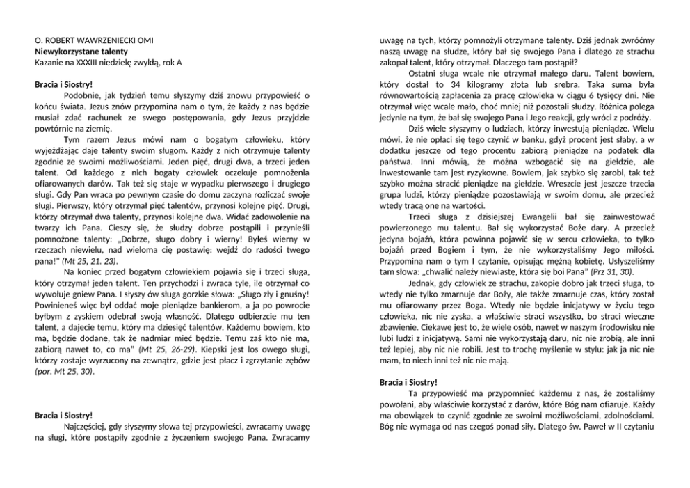O. ROBERT WAWRZENIECKI OMI Niewykorzystane talenty Kazanie