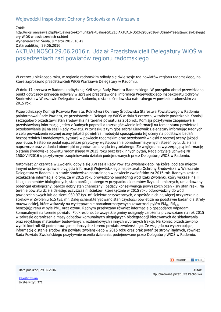 Wojewódzki Inspektorat Ochrony Środowiska w Warszawie Źródło: http://wios.warszawa.pl/pl/aktualnosci-i-komunika/aktualnosci/1210,AKTUALNOSCI-29062016-r-Udzial-Przedstawicieli-Delegat ury-WIOS-w-posiedzeniach-ra.html Wygenerowano: Środa, 8 marca 2017, 10:42 Data publikacji 29.06.2016 AKTUALNOŚCI 29.06.2016 r. Udział Przedstawicieli Delegatury WIOŚ w posiedzeniach rad powiatów regionu radomskiego W czerwcu bieżącego roku, w regionie radomskim odbyły się dwie sesje rad powiatów regionu radomskiego, na które zaproszono przedstawicieli WIOŚ Warszawa Delegatury w Radomiu. W dniu 17 czerwca w Radomiu odbyła się XVII sesja Rady Powiatu Radomskiego. W porządku obrad przewidziano punkt dotyczący przyjęcia uchwały w sprawie przedstawionej informacji Wojewódzkiego Inspektoratu Ochrony Środowiska w Warszawie Delegatura w Radomiu, o stanie środowiska naturalnego w powiecie radomskim za 2015 rok. Przewodniczący Komisji Rozwoju Powiatu, Rolnictwa i Ochrony Środowiska Starostwa Powiatowego w Radomiu poinformował Radę Powiatu, że przedstawiciel Delegatury WIOŚ w dniu 9 czerwca, w trakcie posiedzenia Komisji szczegółowo przedstawił stan środowiska na terenie powiatu za 2015 rok. Komisja pozytywnie zaopiniowała przedstawioną informację. Jeden z Radnych poprosił o uszczegółowienie informacji na temat stanu powietrza i przedstawienie jej na sesji Rady Powiatu. W związku z tym głos zabrał Kierownik Delegatury informując Radnych o celu prowadzenia rocznej oceny jakości powietrza, metodyki sporządzania tej oceny na podstawie badań bezpośrednich i modelowych, sytuacji w powiecie radomskim oraz przedstawił wnioski z rocznej oceny jakości powietrza. Następnie podał najczęstsze przyczyny występowania ponadnormatywnych stężeń pyłu, działania naprawcze oraz zadania i obowiązki organów samorządu terytorialnego. Ze względu na wyczerpującą informację o stanie środowiska powiatu radomskiego w 2015 roku oraz brak innych pytań, Rada przyjęła uchwałę Nr 150/XVII/2016 o pozytywnym zaopiniowaniu działań podejmowanych przez Delegaturę WIOŚ w Radomiu. Natomiast 27 czerwca w Zwoleniu odbyła się XVI sesja Rady Powiatu Zwoleńskiego, na której podjęto między innymi uchwałę w sprawie przyjęcia informacji Wojewódzkiego Inspektoratu Ochrony Środowiska w Warszawie Delegatura w Radomiu, o stanie środowiska naturalnego w powiecie zwoleńskim za 2015 rok. Radnym została przekazana informacja o tym, że w 2015 roku prowadzono monitoring wód rzeki Zwoleńki, który wskazał na III klasę elementów biologicznych, stan poniżej dobrego w przypadku elementów fizykochemicznych, umiarkowany potencjał ekologiczny, bardzo dobry stan chemiczny i będący konsekwencją powyższych ocen – zły stan rzeki. Na terenie powiatu działa dziesięć oczyszczalni ścieków, które łącznie w 2015 roku odprowadziły do wód powierzchniowych lub do ziemi 939,97 tys. m3 ścieków oczyszczonych, a spośród nich najwięcej oczyszczalnia ścieków w Zwoleniu 615 tys. m3. Dalej scharakteryzowano stan czystości powietrza na podstawie badań dla strefy mazowieckiej, które wskazały na występowanie ponadnormatywnych zawartości pyłów PM10, PM2,5, benzo(a)pirenu w pyle PM10 oraz ozonu. Radnym przekazano również informacje o gospodarce odpadami komunalnymi na terenie powiatu. Podkreślono, że wszystkie gminy osiągnęły założenia przewidziane na rok 2015 w zakresie ograniczenia masy odpadów komunalnych ulegających biodegradacji kierowanych do składowania oraz recyklingu materiałów budowlanych, rozbiórkowych i innych wybranych frakcji. Na koniec przedstawiono wyniki kontroli 48 podmiotów gospodarczych z terenu powiatu zwoleńskiego. Ze względu na wyczerpującą informację o stanie środowiska powiatu zwoleńskiego w 2015 roku oraz brak pytań ze strony Radnych, również Rada Powiatu Zwoleńskiego pozytywnie oceniła działania, podejmowane przez Delegaturę WIOŚ w Radomiu. Data publikacji 29.06.2016 Rejestr zmian Liczba wizyt: 371 Autor: Opublikowane przez Ewa Pacholska