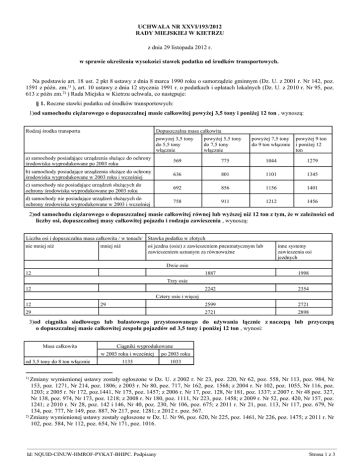 UCHWAŁA NR XXVI/193/2012 RADY MIEJSKIEJ W KIETRZU z dnia 29 listopada 2012 r. w sprawie określenia wysokości stawek podatku od środków transportowych. Na podstawie art. 18 ust. 2 pkt 8 ustawy z dnia 8 marca 1990 roku o samorządzie gminnym (Dz. U. z 2001 r. Nr 142, poz. 1591 z późn. zm.1) ), art. 10 ustawy z dnia 12 stycznia 1991 r. o podatkach i opłatach lokalnych (Dz. U. z 2010 r. Nr 95, poz. 613 z późn zm.2) ) Rada Miejska w Kietrzu uchwala, co następuje: § 1. Roczne stawki podatku od środków transportowych: 1)od samochodu ciężarowego o dopuszczalnej masie całkowitej powyżej 3,5 tony i poniżej 12 ton , wynoszą: Rodzaj środka transportu Dopuszczalna masa całkowita powyzej 3,5 tony do 5,5 tony włącznie powyżej 5,5 tony do 7,5 tony włącznie powyżej 7,5 tony do 9 ton włącznie powyżej 9 ton i poniżej 12 ton a) samochody posiadające urządzenia służące do ochrony środowiska wyprodukowane po 2003 roku 569 775 1044 1279 b) samochody posiadające urządzenia służące do ochrony środowiska wyprodukowane w 2003 roku i wcześniej 636 801 1101 1345 c) samochody nie posiadające urządzeń służących do ochrony środowiska wyprodukowane po 2003 roku 692 856 1156 1401 d) samochody nie posiadające urządzeń służących do ochrony środowiska wyprodukowane w 2003 i wcześniej 758 911 1212 1456 2)od samochodu ciężarowego o dopuszczalnej masie całkowitej równej lub wyższej niż 12 ton z tym, że w zależności od liczby osi, dopuszczalnej masy całkowitej pojazdu i rodzaju zawieszenia , wynoszą: Liczba osi i dopuszczalna masa całkowita / w tonach/ Stawka podatku w złotych nie mniej niż mniej niż oś jezdna (osie) z zawieszeniem pneumatycznym lub zawieszeniem uznanym za równoważne inne systemy zawieszenia osi jezdnych Dwie osie 12 1887 1998 2242 2354 2599 2721 2721 2898 Trzy osie 12 Cztery osie i więcej 12 29 29 3)od ciągnika siodłowego lub balastowego przystosowanego do używania łącznie z naczepą lub przyczepą o dopuszczalnej masie całkowitej zespołu pojazdów od 3,5 tony i poniżej 12 ton , wynosi: Masa całkowita od 3,5 tony do 8 ton włącznie Ciągniki wyprodukowane w 2003 roku i wcześniej po 2003 roku 1133 1033 1) Zmiany wymienionej ustawy zostały ogłoszone w Dz. U. z 2002 r. Nr 23, poz. 220, Nr 62, poz. 558, Nr 113, poz. 984, Nr 153, poz. 1271, Nr 214, poz. 1806; z 2003 r. Nr 80, poz. 717, Nr 162, poz. 1568; z 2004 r. Nr 102, poz. 1055, Nr 116, poz. 1203; z 2005 r. Nr 172, poz.1441, Nr 175, poz. 1457; z 2006 r. Nr 17, poz. 128, Nr 181, poz. 1337; z 2007 r. Nr 48 poz. 327, Nr 138, poz. 974, Nr 173, poz. 1218; z 2008 r. Nr 180, poz. 1111, Nr 223, poz. 1458; z 2009 r. Nr 52, poz. 420, Nr 157, poz. 1241; z 2010 r. Nr 28, poz. 142 i 146, Nr 40, poz. 230, Nr 106, poz. 675; z 2011 r. Nr 21, poz. 113, Nr 117, poz. 679, Nr 134, poz. 777, Nr 149, poz. 887, Nr 217, poz. 1281; z 2012 r. poz. 567. 2) Zmiany wymienionej ustawy zostały ogłoszone w Dz. U. Nr 96, poz. 620, Nr 225, poz. 1461, Nr 226, poz. 1475; z 2011 r. Nr 102, poz. 584, Nr 112, poz. 654, Nr 171, poz. 1016. ————————————————————————————————————————————————————————— Id: NQUID-CINUW-HMROF-PYKAT-BHIPC. Podpisany Strona 1 z 3 powyżej 8 ton i poniżej 12 ton 1734 1622 4)od ciągnika siodłowego lub balastowego przystosowanego do używania łącznie z naczepą lub przyczepą o dopuszczalnej masie całkowitej zespołu pojazdów równej lub wyższej niż 12 ton w zależności od liczby osi, dopuszczalnej masy całkowitej pojazdu i rodzaju zawieszenia , wynoszą: Liczba osi i dopuszczalna masa całkowita zespołu pojazdów: ciągnik siodłowy + naczepa, ciągnik balastowy + przyczepa / w tonach/ nie mniej niż Stawka podatku w złotych mniej niż oś jezdna (osie) z zawieszeniem pneumatycznym lub zawieszeniem uznanym za równoważne inne systemy zawieszenia osi jezdnych Dwie osie 12 31 31 2055 2165 2165 2298 Trzy osie 12 36 2109 2220 36 40 2220 2231 2276 2954 40 5)od przyczepy lub naczepy, które łącznie z pojazdem silnikowym posiadają dopuszczalną masę całkowitą od 7 ton i poniżej 12 ton, z wyjątkiem związanych wyłącznie z działalnością rolniczą prowadzoną przez podatnika podatku rolnego , wynoszą: Masa całkowita Przyczepy i naczepy wyprodukowane w 2003 roku i wcześniej po 2003 roku od 7 ton do 10 ton włącznie 1017 899 powyżej 10 ton i poniżej 12 ton 1496 1384 6)od przyczepy lub naczepy, które łącznie z pojazdem silnikowym posiadają dopuszczalną masę całkowitą równą lub wyższą niż 12 ton z wyjątkiem związanych wyłącznie z działalnością rolniczą prowadzoną przez podatnika podatku rolnego, z tym, że w zależności od liczby osi, dopuszczalnej masy całkowitej pojazdu i rodzaju zawieszenia , wynoszą: Liczba osi i dopuszczalna masa całkowita zespołu pojazdów: naczepa / przyczepa + pojazd silnikowy / w tonach/ nie mniej niż mniej niż Stawka podatku w złotych oś jezdna (osie) z zawieszeniem pneumatycznym lub zawieszeniem uznanym za równoważn inne systemy zawieszenia osi jezdnych 1567 1722 1741 1763 Jedna oś 12 36 36 Dwie osie 12 36 1500 1734 36 38 1708 1763 1797 2097 1678 1734 1763 1763 38 Trzy osie 12 36 36 7)od autobusu z tym, że w zależności od ilości miejsc do siedzenia oraz jego roku wyprodukowania , wynoszą: Ilość miejsc do siedzenia Autobusy wyprodukowane w 2003 roku i wcześniej po 2003 roku do 15 miejsc 700 634 powyżej 15 miejsc mniejszej niż 30 miejsc 1467 1357 równej lun wyższej niż 30 miejsc 2134 1946 ————————————————————————————————————————————————————————— Id: NQUID-CINUW-HMROF-PYKAT-BHIPC. Podpisany Strona 2 z 3 § 2. Traci moc uchwała Nr XIV/113/2011 Rady Miejskiej w Kietrzu z dnia 24 listopada 2011 r. w sprawie określenia wysokości stawek podatku od środków transportowych. § 