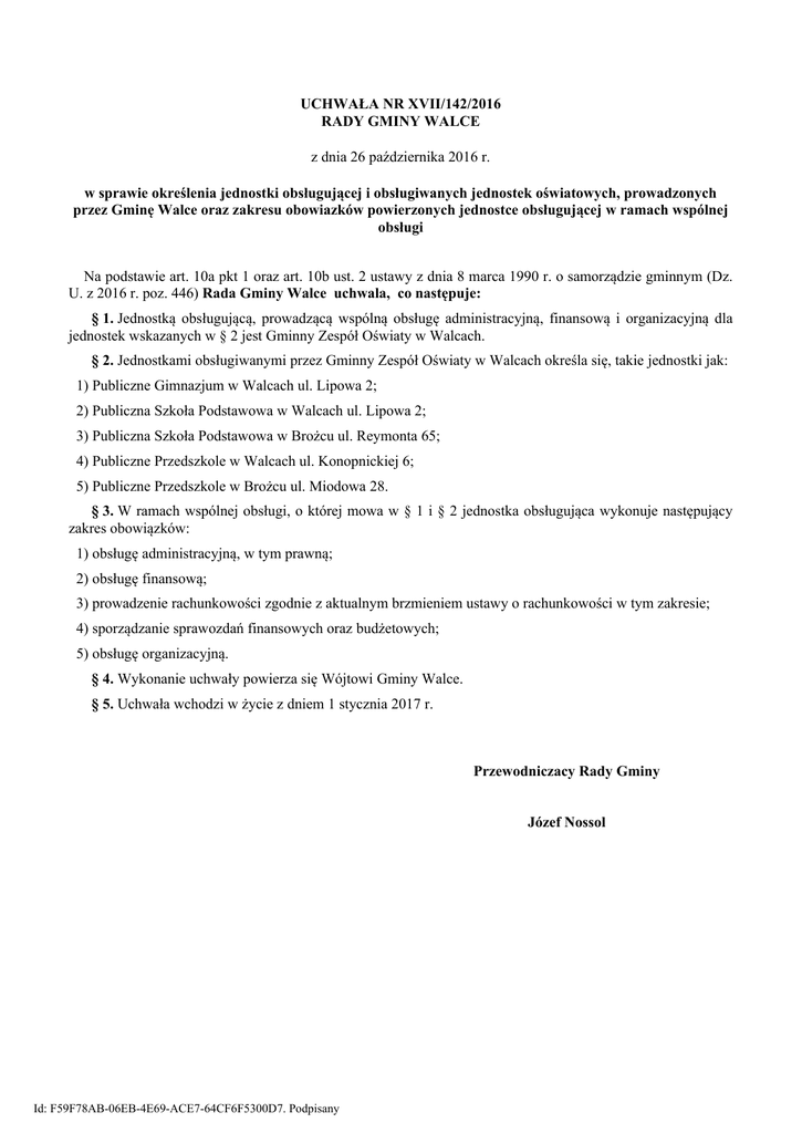UCHWAŁA NR XVII/142/2016 RADY GMINY WALCE z dnia 26 października 2016 r. w sprawie określenia jednostki obsługującej i obsługiwanych jednostek oświatowych, prowadzonych przez Gminę Walce oraz zakresu obowiazków powierzonych jednostce obsługującej w ramach wspólnej obsługi Na podstawie art. 10a pkt 1 oraz art. 10b ust. 2 ustawy z dnia 8 marca 1990 r. o samorządzie gminnym (Dz. U. z 2016 r. poz. 446) Rada Gminy Walce uchwala, co następuje: § 1. Jednostką obsługującą, prowadzącą wspólną obsługę administracyjną, finansową i organizacyjną dla jednostek wskazanych w § 2 jest Gminny Zespół Oświaty w Walcach. § 2. Jednostkami obsługiwanymi przez Gminny Zespół Oświaty w Walcach określa się, takie jednostki jak: 1) Publiczne Gimnazjum w Walcach ul. Lipowa 2; 2) Publiczna Szkoła Podstawowa w Walcach ul. Lipowa 2; 3) Publiczna Szkoła Podstawowa w Brożcu ul. Reymonta 65; 4) Publiczne Przedszkole w Walcach ul. Konopnickiej 6; 5) Publiczne Przedszkole w Brożcu ul. Miodowa 28. § 3. W ramach wspólnej obsługi, o której mowa w § 1 i § 2 jednostka obsługująca wykonuje następujący zakres obowiązków: 1) obsługę administracyjną, w tym prawną; 2) obsługę finansową; 3) prowadzenie rachunkowości zgodnie z aktualnym brzmieniem ustawy o rachunkowości w tym zakresie; 4) sporządzanie sprawozdań finansowych oraz budżetowych; 5) obsługę organizacyjną. § 4. Wykonanie uchwały powierza się Wójtowi Gminy Walce. § 5. Uchwała wchodzi w życie z dniem 1 stycznia 2017 r. Przewodniczacy Rady Gminy Józef Nossol Id: F59F78AB-06EB-4E69-ACE7-64CF6F5300D7. Podpisany