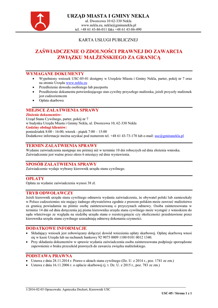 URZĄD MIASTA I GMINY NEKLA ul. Dworcowa 10 62-330 Nekla www.nekla.eu, [email protected] tel. +48 61 43-86-011 faks +48 61 43-86-490 KARTA USŁUGI PUBLICZNEJ ZAŚWIADCZENIE O ZDOLNOŚCI PRAWNEJ DO ZAWARCIA ZWIĄZKU MAŁŻEŃSKIEGO ZA GRANICĄ WYMAGANE DOKUMENTY Wypełniony wniosek USC-05-01 dostępny w Urzędzie Miasta i Gminy Nekla, parter, pokój nr 7 oraz na stronie Urzędu www.nekla.eu Przedłożenie dowodu osobistego lub paszportu Przedłożenie dokumentu potwierdzającego stan cywilny przyszłego małżonka, jeżeli przyszły małżonek jest cudzoziemcem Opłata skarbowa MIEJSCE ZAŁATWIENIA SPRAWY Złożenie dokumentów: Urząd Stanu Cywilnego, parter, pokój nr 7 w budynku Urzędu Miasta i Gminy Nekla, ul. Dworcowa 10, 62-330 Nekla Godziny obsługi klientów: poniedziałek 8:00 - 16:00, wtorek - piątek 7:00 – 15:00 Dodatkowe informacje można uzyskać pod numerem tel. +48 61 43-73-178 lub e-mail: [email protected] TERMIN ZAŁATWIENIA SPRAWY Wydanie zaświadczenia następuje nie później niż w terminie 10 dni roboczych od dnia złożenia wniosku. Zaświadczenie jest ważne przez okres 6 miesięcy od dnia wystawienia. SPOSÓB ZAŁATWIENIA SPRAWY Zaświadczenie wydaje wybrany kierownik urzędu stanu cywilnego. OPŁATY Opłata za wydanie zaświadczenia wynosi 38 zł. TRYB ODWOŁAWCZY Jeżeli kierownik urzędu stanu cywilnego odmawia wydania zaświadczenia, że obywatel polski lub zamieszkały w Polsce cudzoziemiec nie mający żadnego obywatelstwa zgodnie z prawem polskim może zawrzeć małżeństwo za granicą powiadamia na piśmie osobę zainteresowaną o przyczynach odmowy. Osoba zainteresowana w terminie 14 dni od dnia doręczenia jej pisma kierownika urzędu stanu cywilnego może wystąpić z wnioskiem do sądu właściwego ze względu na siedzibę urzędu stanu o rozstrzygnięcie czy okoliczności przedstawione przez kierownika urzędu stanu cywilnego uzasadniają odmowę dokonania czynności. DODATKOWE INFORMACJE Składający wniosek jest zobowiązany dołączyć dowód wniesienia opłaty skarbowej. Opłatę skarbową wnosi się w kasie Urzędu lub na rachunek bankowy 92 9075 0009 1100 0101 0012 1340. Przy składaniu dokumentów w sprawie wydania zaświadczenia osoba zainteresowana podpisuje sporządzone zapewnienie o braku przeszkód prawnych do zawarcia związku małżeńskiego. PODSTAWA PRAWNA Ustawa z dnia 28.11.2014 r. Prawo o aktach stanu cywilnego (Dz. U. z 2014 r., poz. 1741 ze zm.) Ustawa z dnia 16.11.2006 r. o opłacie skarbowej (j. t. Dz. U. z 2015 r., poz. 783 ze zm.) 1/2016-02-03 Opracowała: Agnieszka Deckert, Kierownik USC USC-05 / Strona 1 z 1