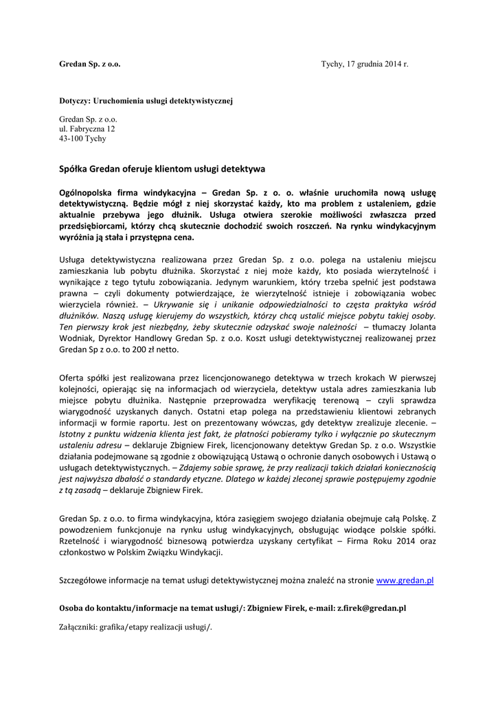 Gredan Sp. z o.o. Tychy, 17 grudnia 2014 r. Dotyczy: Uruchomienia usługi detektywistycznej Gredan Sp. z o.o. ul. Fabryczna 12 43-100 Tychy Spółka Gredan oferuje klientom usługi detektywa Ogólnopolska firma windykacyjna – Gredan Sp. z o. o. właśnie uruchomiła nową usługę detektywistyczną. Będzie mógł z niej skorzystać każdy, kto ma problem z ustaleniem, gdzie aktualnie przebywa jego dłużnik. Usługa otwiera szerokie możliwości zwłaszcza przed przedsiębiorcami, którzy chcą skutecznie dochodzić swoich roszczeń. Na rynku windykacyjnym wyróżnia ją stała i przystępna cena. Usługa detektywistyczna realizowana przez Gredan Sp. z o.o. polega na ustaleniu miejscu zamieszkania lub pobytu dłużnika. Skorzystać z niej może każdy, kto posiada wierzytelność i wynikające z tego tytułu zobowiązania. Jedynym warunkiem, który trzeba spełnić jest podstawa prawna – czyli dokumenty potwierdzające, że wierzytelność istnieje i zobowiązania wobec wierzyciela również. – Ukrywanie się i unikanie odpowiedzialności to częsta praktyka wśród dłużników. Naszą usługę kierujemy do wszystkich, którzy chcą ustalić miejsce pobytu takiej osoby. Ten pierwszy krok jest niezbędny, żeby skutecznie odzyskać swoje należności – tłumaczy Jolanta Wodniak, Dyrektor Handlowy Gredan Sp. z o.o. Koszt usługi detektywistycznej realizowanej przez Gredan Sp z o.o. to 200 zł netto. Oferta spółki jest realizowana przez licencjonowanego detektywa w trzech krokach W pierwszej kolejności, opierając się na informacjach od wierzyciela, detektyw ustala adres zamieszkania lub miejsce pobytu dłużnika. Następnie przeprowadza weryfikację terenową – czyli sprawdza wiarygodność uzyskanych danych. Ostatni etap polega na przedstawieniu klientowi zebranych informacji w formie raportu. Jest on prezentowany wówczas, gdy detektyw zrealizuje zlecenie. – Istotny z punktu widzenia klienta jest fakt, że płatności pobieramy tylko i wyłącznie po skutecznym ustaleniu adresu – deklaruje Zbigniew Firek, licencjonowany detektyw Gredan Sp. z o.o. Wszystkie działania podejmowane są zgodnie z obowiązującą Ustawą o ochronie danych osobowych i Ustawą o usługach detektywistycznych. – Zdajemy sobie sprawę, że przy realizacji takich działań koniecznością jest najwyższa dbałość o standardy etyczne. Dlatego w każdej zleconej sprawie postępujemy zgodnie z tą zasadą – deklaruje Zbigniew Firek. Gredan Sp. z o.o. to firma windykacyjna, która zasięgiem swojego działania obejmuje całą Polskę. Z powodzeniem funkcjonuje na rynku usług windykacyjnych, obsługując wiodące polskie spółki. Rzetelność i wiarygodność biznesową potwierdza uzyskany certyfikat – Firma Roku 2014 oraz członkostwo w Polskim Związku Windykacji. Szczegółowe informacje na temat usługi detektywistycznej można znaleźć na stronie www.gredan.pl Osoba do kontaktu/informacje na temat usługi/: Zbigniew Firek, e-mail: [email protected] Załączniki: grafika/etapy realizacji usługi/.