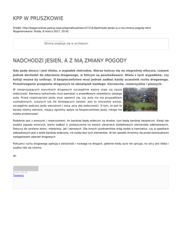 KPP W PRUSZKOWIE Źródło: http://kpppruszkow.policja.waw.pl/ppr/aktualnosci/27116,Nadchodzi-jesien-a-z-nia-zmiany-pogody.html Wygenerowano: Środa, 8 marca 2017, 10:42 Strona znajduje się w archiwum. NADCHODZI JESIEŃ, A Z NIĄ ZMIANY POGODY Gdy pada deszcz i jest ślisko, o wypadek nietrudno. Nieraz kończy się na niegroźnej stłuczce, czasem jednak dochodzi do zdarzenia drogowego, w którym są poszkodowani. Wielu z tych wypadków, czy kolizji można by uniknąć. O bezpieczeństwo musi jednak zadbać każdy uczestnik ruchu drogowego. Przestrzeganie przepisów drogowych to obowiązek każdego- kierowców, rowerzystów i pieszych. W niesprzyjających warunkach drogowych szczególnie ważna staje się nasza widoczność. Kierowca samochodu musi pamiętać o prawidłowym oświetleniu swojego auta. Przed rozpoczęciem jazdy musi upewnić się, czy auto nie ma przypadkiem uszkodzonych, zużytych lub źle działających świateł. Jest to niezwykle ważne, szczególnie podczas jazdy wieczorem i nocą, przy złej widoczności. O tym, że jest to bardzo istotny element, mający ogromny wpływ na bezpieczeństwo jazdy, nikogo nie trzeba przekonywać. Podobnie jest z pieszymi i rowerzystami. Im bardziej będą widoczni na drodze, tym będą bardziej bezpieczni. Kiedy tak szybko zapada zmierzch, warto zadbać o umieszczenie na swoich ubraniach dodatkowych elementów odblaskowych. Dotyczy do zarówno dzieci, młodzieży, jak i dorosłych. Dla innych użytkowników dróg osoba w kamizelce, czy w opaskach odblaskowych jest o wiele bardziej widoczna, niż osoba bez tych elementów. W ten sposób chronimy się przed ewentualnymi następstwami zdarzeń drogowych. Policjanci ruchu drogowego apelują o ostrożność i rozwagę na drogach, głównie kiedy aura nie sprzyja, na ulicy jest ślisko i szybko robi się ciemno. dn Ocena: 0/5 (0) Tweetnij