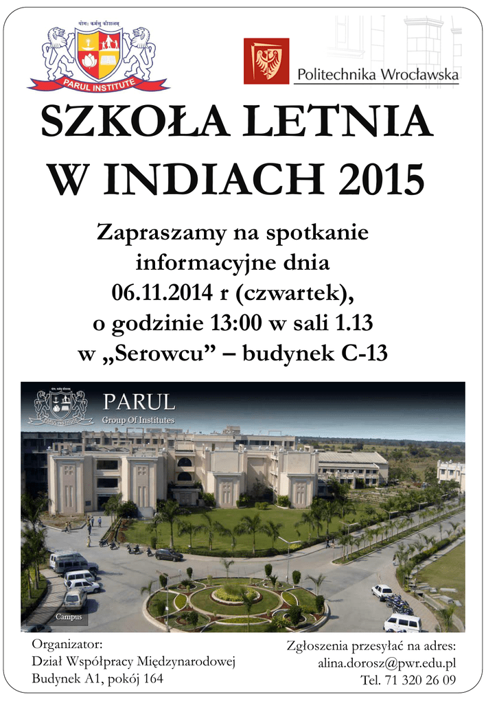 SZKOŁA LETNIA W INDIACH 2015 Zapraszamy na spotkanie informacyjne dnia 06.11.2014 r (czwartek), o godzinie 13:00 w sali 1.13 w „Serowcu” – budynek C-13 Organizator: Dział Współpracy Międzynarodowej Budynek A1, pokój 164 Zgłoszenia przesyłać na adres: [email protected] Tel. 71 320 26 09