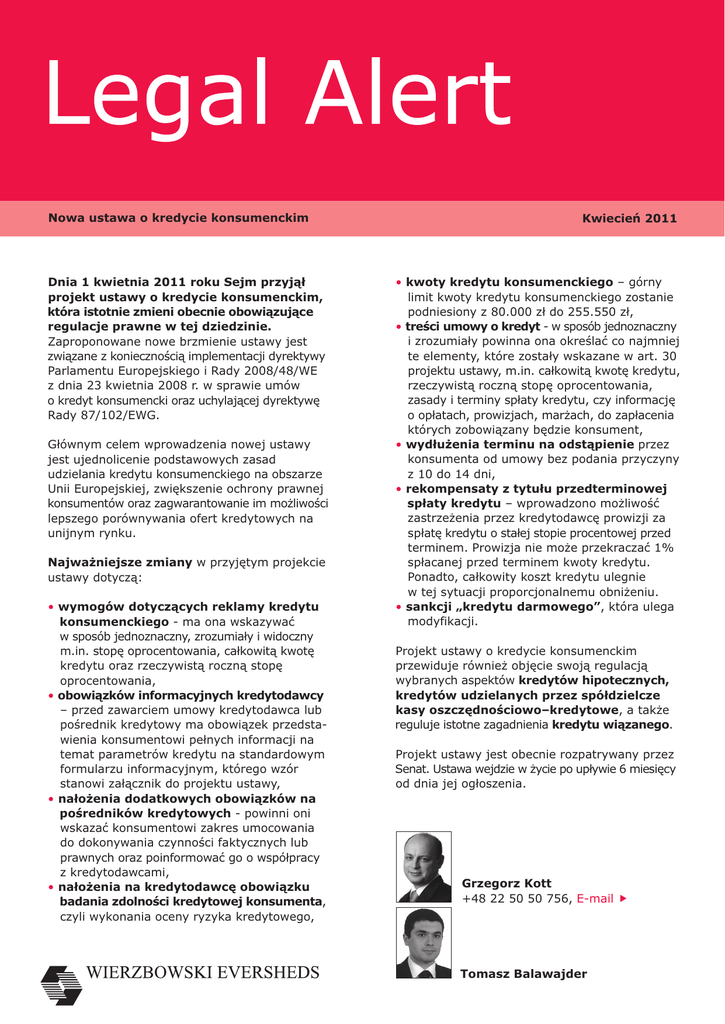 Nowa ustawa o kredycie konsumenckim Dnia 1 kwietnia 2011 roku Sejm przyj¹³ projekt ustawy o kredycie konsumenckim, która istotnie zmieni obecnie obowi¹zuj¹ce regulacje prawne w tej dziedzinie. Zaproponowane nowe brzmienie ustawy jest zwi¹zane z koniecznoœci¹ implementacji dyrektywy Parlamentu Europejskiego i Rady 2008/48/WE z dnia 23 kwietnia 2008 r. w sprawie umów o kredyt konsumencki oraz uchylaj¹cej dyrektywê Rady 87/102/EWG. G³ównym celem wprowadzenia nowej ustawy jest ujednolicenie podstawowych zasad udzielania kredytu konsumenckiego na obszarze Unii Europejskiej, zwiêkszenie ochrony prawnej konsumentów oraz zagwarantowanie im mo¿liwoœci lepszego porównywania ofert kredytowych na unijnym rynku. Najwa¿niejsze zmiany w przyjêtym projekcie ustawy dotycz¹: • wymogów dotycz¹cych reklamy kredytu konsumenckiego - ma ona wskazywaæ w sposób jednoznaczny, zrozumia³y i widoczny m.in. stopê oprocentowania, ca³kowit¹ kwotê kredytu oraz rzeczywist¹ roczn¹ stopê oprocentowania, • obowi¹zków informacyjnych kredytodawcy – przed zawarciem umowy kredytodawca lub poœrednik kredytowy ma obowi¹zek przedstawienia konsumentowi pe³nych informacji na temat parametrów kredytu na standardowym formularzu informacyjnym, którego wzór stanowi za³¹cznik do projektu ustawy, • na³o¿enia dodatkowych obowi¹zków na poœredników kredytowych - powinni oni wskazaæ konsumentowi zakres umocowania do dokonywania czynnoœci faktycznych lub prawnych oraz poinformowaæ go o wspó³pracy z kredytodawcami, • na³o¿enia na kredytodawcê obowi¹zku badania zdolnoœci kredytowej konsumenta, czyli wykonania oceny ryzyka kredytowego, Kwiecieñ 2011 • kwoty kredytu konsumenckiego – górny limit kwoty kredytu konsumenckiego zostanie podniesiony z 80.000 z³ do 255.550 z³, • treœci umowy o kredyt - w sposób jednoznaczny i zrozumia³y powinna ona okreœlaæ co najmniej te elementy, które zosta³y wskazane w art. 30 projektu ustawy, m.in. ca³kowit¹ kwotê kredytu, rzeczywist¹ roczn¹ stopê oprocentowania, zasady i terminy sp³aty kredytu, czy informacjê o op³atach, prowizjach, mar¿ach, do zap³acenia których zobowi¹zany bêdzie konsument, • wyd³u¿enia terminu na odst¹pienie przez konsumenta od umowy bez podania przyczyny z 10 do 14 dni, • rekompensaty z tytu³u przedterminowej sp³aty kredytu – wprowadzono mo¿liwoœæ zastrze¿enia przez kredytodawcê prowizji za sp³atê kredytu o sta³ej stopie procentowej przed terminem. Prowizja nie mo¿e przekraczaæ 1% sp³acanej przed terminem kwoty kredytu. Ponadto, ca³kowity koszt kredytu ulegnie w tej sytuacji proporcjonalnemu obni¿eniu. • sankcji „kredytu darmowego”, która ulega modyfikacji. Projekt ustawy o kredycie konsumenckim przewiduje równie¿ objêcie swoj¹ regulacj¹ wybranych aspektów kredytów hipotecznych, kredytów udzielanych przez spó³dzielcze kasy oszczêdnoœciowo–kredytowe, a tak¿e reguluje istotne zagadnienia kredytu wi¹zanego. Projekt ustawy jest obecnie rozpatrywany przez Senat. Ustawa wejdzie w ¿ycie po up³ywie 6 miesiêcy od dnia jej og³oszenia. Grzegorz Kott +48 22 50 50 756, E-mail ? Tomasz Balawajder