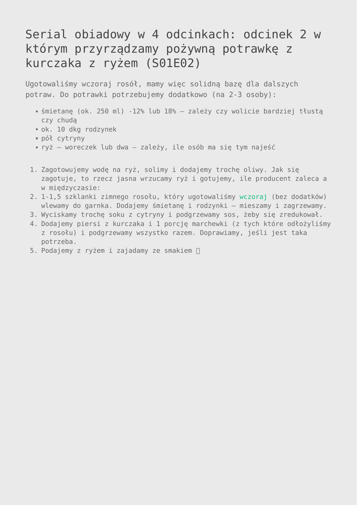 Serial obiadowy w 4 odcinkach: odcinek 2 w którym przyrządzamy pożywną potrawkę z kurczaka z ryżem (S01E02) Ugotowaliśmy wczoraj rosół, mamy więc solidną bazę dla dalszych potraw. Do potrawki potrzebujemy dodatkowo (na 2-3 osoby): śmietanę (ok. 250 ml) -12% lub 18% – zależy czy wolicie bardziej tłustą czy chudą ok. 10 dkg rodzynek pół cytryny ryż – woreczek lub dwa – zależy, ile osób ma się tym najeść 1. Zagotowujemy wodę na ryż, solimy i dodajemy trochę oliwy. Jak się zagotuje, to rzecz jasna wrzucamy ryż i gotujemy, ile producent zaleca a w międzyczasie: 2. 1-1,5 szklanki zimnego rosołu, który ugotowaliśmy wczoraj (bez dodatków) wlewamy do garnka. Dodajemy śmietanę i rodzynki – mieszamy i zagrzewamy. 3. Wyciskamy trochę soku z cytryny i podgrzewamy sos, żeby się zredukował. 4. Dodajemy piersi z kurczaka i 1 porcję marchewki (z tych które odłożyliśmy z rosołu) i podgrzewamy wszystko razem. Doprawiamy, jeśli jest taka potrzeba. 5. Podajemy z ryżem i zajadamy ze smakiem Jutro powrót zupy – zostańcie z nami