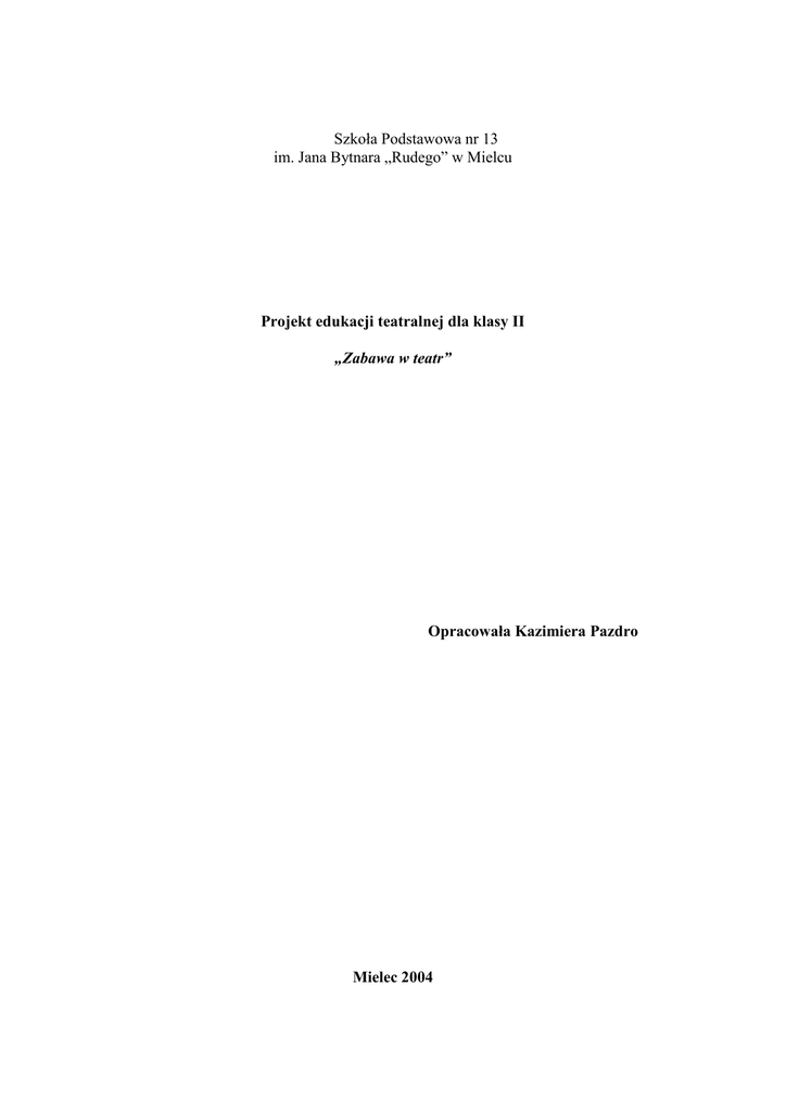 Szkoła Podstawowa nr 13 im. Jana Bytnara „Rudego” w Mielcu Projekt edukacji teatralnej dla klasy II „Zabawa w teatr” Opracowała Kazimiera Pazdro Mielec 2004 Wstęp Trudno przecenić wpływ teatru na rozwój aktywności, bogactwo języka oraz poziom kultury dziecka w młodszym wieku szkolnym. Proponowanie róŜnorodnych technik teatralnych, angaŜowanie zespołu w przygotowanie przedstawienia zapobiega monotonii procesu edukacyjnego, jest świetną formą pracy w grupie a takŜe daje uczniom moŜliwość zaprezentowania indywidualnych talentów czy wyraŜenia ekspresji. Inscenizacje wpływają pozytywnie na rozwój zainteresowań czytelniczych, dają moŜliwość zapoznania uczniów z szeroką gamą utworów literackich, a takŜe przygotowują przyszłego widza teatralnego. Sposób realizacji i charakterystyka projektu Projekt będzie obejmował szeroki wachlarz technik teatralnych, aby dzieci mogły uzyskać pełny obraz pracy w teatrze. Edukację teatralną opieram na dwóch elementach: wizycie w teatrze oraz przygotowaniu własnej inscenizacji. Pobyt w teatrze to dla dzieci niezapomniane przeŜycie. Bezpośredni kontakt z twórcami i rekwizytami to doskonała moŜliwość poszerzenia słownictwa oraz bliŜszego przyjrzenia się pracy wielu ludzi. Przedstawienie to dla małego widza źródło róŜnorodnych przeŜyć i doznań. Wizyta w teatrze dostarcza mnóstwo materiału do pracy z dziećmi. Po powrocie będziemy opowiadać treść spektaklu i oceniać postępowanie bohaterów. Podzielimy się wraŜeniami i wspólnie napiszemy sprawozdanie. Z pewnością przywieziemy kilka plakatów i następnie wykonamy własne. Edukacja teatralna nie byłaby pełna, gdyby sprowadzała się jedynie do biernego odbioru sztuki. W szkole sami pracować będziemy nad przygotowaniem przedstawienia dla kolegów z innych klas. Praca nad inscenizacją rozwija samodzielne myślenie i działanie. Występ poprzedzać będą liczne prace z tekstem, ćwiczenia nad dykcją i poprawną artykulacją, np. z wykorzystaniem magnetofonu. Gry zaczerpnięte z pedagogiki zabawy pozwolą zintegrować zespół. Nie zabraknie takŜe ćwiczeń dramowych typu, dokończ opowiadanie, zabaw mimicznych czy wygłaszania róŜnorodnych tekstów z pamięci. Poprzez słowo, ruch, mimikę dzieci nabywają umiejętności wypowiadania się, przeŜywania, są otwarte i aktywne. Przedstawienie będzie inspiracją do tworzenia prac plastycznych z wykorzystaniem urozmaiconych technik. Wykonamy rekwizyty, zaproszenia, dekoracje oraz dobierzemy stroje. AranŜowanie sytuacji dydaktycznych ma słuŜyć nie tylko przyrostowi wiedzy i umiejętności poznawczych, ale takŜe wychowaniu. Klasowe przedstawienie to okazja do zawiązania specyficznych kontaktów miedzy dziećmi oraz uczniami a nauczycielem. Działalność dzieci skupiona wokół inscenizacji jest jedną z form wszechstronnego ich uaktywniania. Taka róŜnorodność propozycji pomaga zrealizować główny cel, jakim jest rozbudzenie u uczniów zainteresowania teatrem. Zabawa w teatr daje moŜliwość zrealizowania się wszystkim dzieciom, kaŜdemu, bowiem moŜemy zaproponować jakiś waŜny odcinek pracy. Poprzez działania zespołowe umoŜliwię dzieciom zrozumienie znaczenia współpracy i konieczność liczenia się z innymi ludźmi. Zajęcia pozwolą mi zrealizować wiele waŜnych celów dydaktycznych i wychowawczych, a dla dzieci będą źródłem niezapomnianych doświadczeń i przeŜyć. Projekt ma charakter otwarty - moŜna go uzupełniać i modyfikować w trakcie realizacji. Cele projektu Cel główny: - Rozwijanie zainteresowań czytelniczych i teatralnych Cele szczegółowe: - Pobudzanie twórczej aktywności dziecka - Zapoznanie uczniów z szeroką gamą utworów literackich - Wzbogacanie słownictwa dziecka o wyrazy związane z teatrem - Nabywanie umiejętności wypowiadania się poprzez słowo, mimikę, ruch - Doskonalenie techniki czytania, pamięci - Kształcenie smaku estetycznego, wraŜliwości na piękno - Kształtowanie podstawowych nawyków społecznego współŜycia, dyscypliny i odpowiedzialności zbiorowej i indywidualnej - Kształcenie wyobraźni i fantazji - Rozwijanie samodzielnego myślenia i działania - Poznanie pracy ludzi związanych z teatrem Termin realizacji Projekt realizowany będzie w klasie drugiej podczas lekcji zintegrowanych i na zajęciach pozalekcyjnych w roku szkolnym 2004/2005 2 Zadania Zagadnienie Formy realizacji Osiągnięcia uczniów Kontakty z Oglądanie spektakli w teatrze „Maska” Potrafi zachować się w teatrze. Jest prawdziwym w Rzeszowie i w teatrze im L. Solskiego aktywnym odbiorcą kultury. teatrem w Tarnowie Uczestniczenie w spotkaniu z aktorem Wie, na czym polega praca aktora. Spotkanie z reŜyserem Poznaje proces powstawania spektaklu. Zwiedzenie kulis i sali prób Docenia pracę ludzi związanych z teatrem. Odwiedzenie Muzeum Lalek Teatralnych Zna lalki teatralne wykonane róŜnymi technikami. Poznaje zbiory muzealne. Gromadzenie plakatów z przedstawień Potrafi odczytać z plakatu teatralnych najwaŜniejsze informacje Zaproszenie do szkoły grupy teatru Kształtuje i rozwija swoją objazdowego z ciekawym przedstawieniem wyobraźnię Śledzenie repertuaru Teatru im. L. Solskiego Interesuje się teatrem. Potrafi w Tarnowie i Teatru „Maska” w Rzeszowie korzystać z Internetu. na stronach internetowych www.teatrmaska.sih.pl Przygotowy- Wybieranie techniki wykonania inscenizacji wanie Zna techniki: Ŝywego planu, teatru lalki i teatru cieni i prezentowanie Prezentowanie przygotowanych przedstawień Umie odpowiednio poruszać się inscenizacji dzieciom z innych klas, rodzicom i poza i mówić na scenie. Pokonuje szkołą nieśmiałość, pozbywa się kompleksów. Projektowanie i tworzenie dekoracji do Umie współpracować w zespole. przedstawień Wykonywanie strojów dla Ŝywego aktora Potrafi samodzielnie myśleć i dla lalek i działać. 3 Wybieranie utworów muzycznych Potrafi dobrać muzyką do nastroju stan