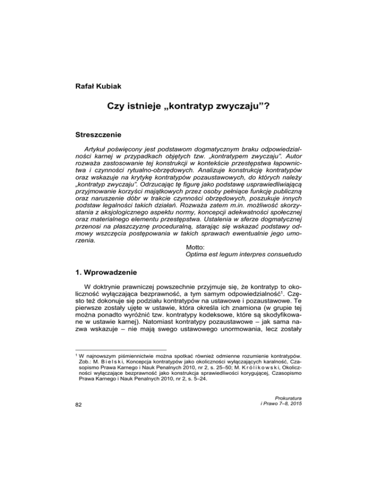 R. Kubiak Rafał Kubiak Czy istnieje „kontratyp zwyczaju”? Streszczenie Artykuł poświęcony jest podstawom dogmatycznym braku odpowiedzialności karnej w przypadkach objętych tzw. „kontratypem zwyczaju”. Autor rozważa zastosowanie tej konstrukcji w kontekście przestępstwa łapownictwa i czynności rytualno-obrzędowych. Analizuje konstrukcję kontratypów oraz wskazuje na krytykę kontratypów pozaustawowych, do których należy „kontratyp zwyczaju”. Odrzucając tę figurę jako podstawę usprawiedliwiającą przyjmowanie korzyści majątkowych przez osoby pełniące funkcję publiczną oraz naruszenie dóbr w trakcie czynności obrzędowych, poszukuje innych podstaw legalności takich działań. Rozważa zatem m.in. możliwość skorzystania z aksjologicznego aspektu normy, koncepcji adekwatności społecznej oraz materialnego elementu przestępstwa. Ustalenia w sferze dogmatycznej przenosi na płaszczyznę proceduralną, starając się wskazać podstawy odmowy wszczęcia postępowania w takich sprawach ewentualnie jego umorzenia. Motto: Optima est legum interpres consuetudo 1. Wprowadzenie W doktrynie prawniczej powszechnie przyjmuje się, że kontratyp to okoliczność wyłączająca bezprawność, a tym samym odpowiedzialność1. Często też dokonuje się podziału kontratypów na ustawowe i pozaustawowe. Te pierwsze zostały ujęte w ustawie, która określa ich znamiona (w grupie tej można ponadto wyróżnić tzw. kontratypy kodeksowe, które są skodyfikowane w ustawie karnej). Natomiast kontratypy pozaustawowe – jak sama nazwa wskazuje – nie mają swego ustawowego unormowania, lecz zostały 1 W najnowszym piśmiennictwie można spotkać również odmienne rozumienie kontratypów. Zob.: M. B i e l s k i, Koncepcja kontratypów jako okoliczności wyłączających karalność, Czasopismo Prawa Karnego i Nauk Penalnych 2010, nr 2, s. 25–50; M. K r ó l i k o w s k i, Okoliczności wyłączające bezprawność jako konstrukcja sprawiedliwości korygującej, Czasopismo Prawa Karnego i Nauk Penalnych 2010, nr 2, s. 5–24. 82 Prokuratura i Prawo 7–8, 2015 Czy istnieje „kontratyp zwyczaju”? opracowane w doktrynie i uznane w orzecznictwie2. Ich katalog nie jest więc precyzyjnie określony i podlega zmianie3 (niektóre z takich kontratypów tracą na aktualności, np. kontratyp pojedynku, inne są opracowywane, np. kontratyp dopuszczalnego ryzyka, który w pewnym fragmencie został skodyfikowany w art. 27 k.k. jako kontratyp dozwolonego eksperymentu, albo też kontratyp sztuki4). Ze względu na brak ustawowego unormowania przedstawiciele doktryny wskazują różne kontratypy pozaustawowe, odmiennie określając też ich znamiona. Do najczęściej wymienianych tego rodzaju okoliczności należą: czynności lecznicze i kosmetyczne, uprawianie sportu, zgoda pokrzywdzonego, karcenie małoletnich. W grupie tej znajduje się także zwyczaj. Czy w istocie istnieją jednak takie kontratypy, czy nie można znaleźć innych podstaw braku (uwolnienia) odpowiedzialności w sytuacji, w której tradycyjnie przyjmuje się zastosowanie kontratypu pozaustawowego? Przedmiotem niniejszego opracowania będzie próba odpowiedzi na to pytanie w kontekście kontratypu zwyczaju, który zostanie szerzej zaprezentowany jako okoliczność powodująca brak odpowiedzialności w przypadku przyjmowania korzyści majątkowych lub osobistych przez osoby pełniące funkcje publiczne oraz czynności rytualno-obrzędowych, w wyniku których może 2 Por. S. L e l e n t a l, (w:) J. W a s z c z y ń s k i (red.), Prawo karne w zarysie. Nauka o ustawie karnej i przestępstwie, Łódź 1992, s. 158. Zdaniem J. W a r y l e w s k i e g o, kontratypy pozaustawowe cechują się tym, że ich znamiona „nie zostały w żadnej ustawie w całości (wyczerpująco) określone, co nie przeszkadza temu, że w przypadku części kontratypów pozaustawowych możemy w ustawach znaleźć część ich znamion, a w każdym razie pewne uzasadnienie dla ich funkcjonowania” – t e g o ż, Zasada ustawowej określoności przesłanek odpowiedzialności karnej a kontratypy pozaustawowe, (w:) J. M a j e w s k i (red.), Okoliczności wyłączające bezprawność czynu. Materiały z IV Bielańskiego Kolokwium Karnistycznego z dnia 16 maja 2007 r., Toruń 2008, s. 23, przypis 3. Występowanie kontratypów pozaustawowych zostało potwierdzone także w orzecznictwie sądowym. Na przykład w postanowieniu z dnia 7 stycznia 2008 r. (sygn. V KK 158/07, OSP 2008, nr 11, poz. 114) Sąd Najwyższy uznał, że: „Istnieją kontratypy, których znamiona zostały ustalone w drodze praktyki wymiaru sprawiedliwości lub zostały sformułowane w drodze koncepcji doktrynalnych w nauce prawa karnego. Są to kontratypy pozaustawowe, wśród których należy wyróżnić zgodę pokrzywdzonego, zabiegi lecznicze, karcenie nieletnich i ryzyko sportowe”. 3 Por. M. B o j a r s k i (red.), Prawo karne materialne. Część ogólna i szczególna, Warszawa 2010, s. 170. 4 Zob. szerzej: M. F i l a r, Sztuka i zagadnienia pornografii, Nowe Prawo 1978, nr 10, s. 1432–1433; J. J. N a l e w a j k o, R. K u b i a k, Sztuka jako okoliczność wyłączająca bezprawność?, Palestra 2000, nr 9, s. 31–43; J. W a r y l e w s k i, Pasja czy obraza uczuć religijnych? Spór wokół art. 196 kodeksu karnego, (w:) L. L e s z c z y ń s k i, E. S k r ę t o w i c z, Z. H o ł d a (red.), W kręgu teorii i praktyki prawa karnego. Księga poświęcona pamięci Profesora Andrzeja Wąska, Lublin 2005, s. 378–379; t e g o ż, Prawnokarne uwarunkowania wolności w zakresie ekspresji seksualnej oraz twórczości (m.in. artystycznej, naukowej i dziennikarskiej), (w:) M. M o z g a w a (red.), Prawnokarne aspekty wolności, Materiały z Konferencji, Arłamów, 16–18 maja 2005 r., Kraków 2006, s. 95–100; M. B u d y n - K u l i k, M. K u l i k, Wolność działalności artystycznej jako okoliczność wyłączająca odpowiedzialność karną, (w:) M. M o z g 