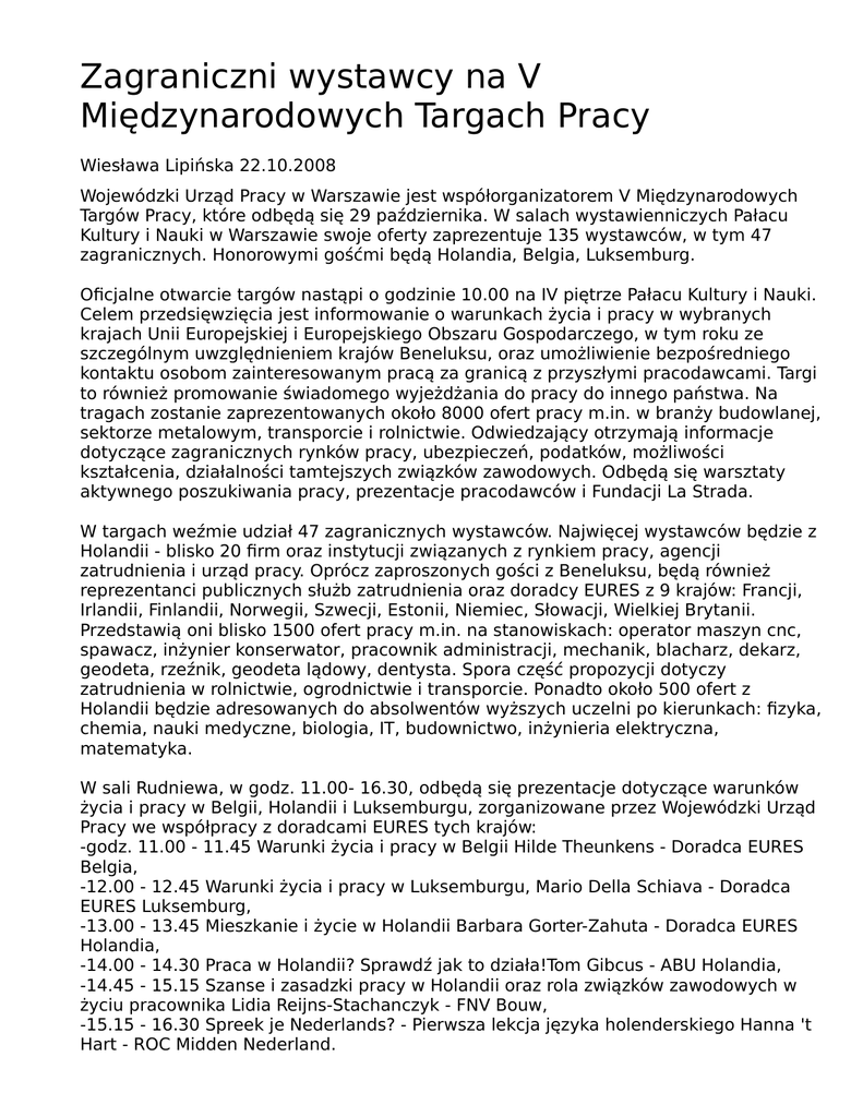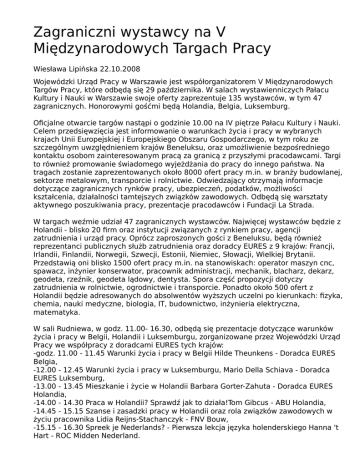 Zagraniczni wystawcy na V Międzynarodowych Targach Pracy Wiesława Lipińska 22.10.2008 Wojewódzki Urząd Pracy w Warszawie jest współorganizatorem V Międzynarodowych Targów Pracy, które odbędą się 29 października. W salach wystawienniczych Pałacu Kultury i Nauki w Warszawie swoje oferty zaprezentuje 135 wystawców, w tym 47 zagranicznych. Honorowymi gośćmi będą Holandia, Belgia, Luksemburg. Oficjalne otwarcie targów nastąpi o godzinie 10.00 na IV piętrze Pałacu Kultury i Nauki. Celem przedsięwzięcia jest informowanie o warunkach życia i pracy w wybranych krajach Unii Europejskiej i Europejskiego Obszaru Gospodarczego, w tym roku ze szczególnym uwzględnieniem krajów Beneluksu, oraz umożliwienie bezpośredniego kontaktu osobom zainteresowanym pracą za granicą z przyszłymi pracodawcami. Targi to również promowanie świadomego wyjeżdżania do pracy do innego państwa. Na tragach zostanie zaprezentowanych około 8000 ofert pracy m.in. w branży budowlanej, sektorze metalowym, transporcie i rolnictwie. Odwiedzający otrzymają informacje dotyczące zagranicznych rynków pracy, ubezpieczeń, podatków, możliwości kształcenia, działalności tamtejszych związków zawodowych. Odbędą się warsztaty aktywnego poszukiwania pracy, prezentacje pracodawców i Fundacji La Strada. W targach weźmie udział 47 zagranicznych wystawców. Najwięcej wystawców będzie z Holandii - blisko 20 firm oraz instytucji związanych z rynkiem pracy, agencji zatrudnienia i urząd pracy. Oprócz zaproszonych gości z Beneluksu, będą również reprezentanci publicznych służb zatrudnienia oraz doradcy EURES z 9 krajów: Francji, Irlandii, Finlandii, Norwegii, Szwecji, Estonii, Niemiec, Słowacji, Wielkiej Brytanii. Przedstawią oni blisko 1500 ofert pracy m.in. na stanowiskach: operator maszyn cnc, spawacz, inżynier konserwator, pracownik administracji, mechanik, blacharz, dekarz, geodeta, rzeźnik, geodeta lądowy, dentysta. Spora część propozycji dotyczy zatrudnienia w rolnictwie, ogrodnictwie i transporcie. Ponadto około 500 ofert z Holandii będzie adresowanych do absolwentów wyższych uczelni po kierunkach: fizyka, chemia, nauki medyczne, biologia, IT, budownictwo, inżynieria elektryczna, matematyka. W sali Rudniewa, w godz. 11.00- 16.30, odbędą się prezentacje dotyczące warunków życia i pracy w Belgii, Holandii i Luksemburgu, zorganizowane przez Wojewódzki Urząd Pracy we współpracy z doradcami EURES tych krajów: -godz. 11.00 - 11.45 Warunki życia i pracy w Belgii Hilde Theunkens - Doradca EURES Belgia, -12.00 - 12.45 Warunki życia i pracy w Luksemburgu, Mario Della Schiava - Doradca EURES Luksemburg, -13.00 - 13.45 Mieszkanie i życie w Holandii Barbara Gorter-Zahuta - Doradca EURES Holandia, -14.00 - 14.30 Praca w Holandii? Sprawdź jak to działa!Tom Gibcus - ABU Holandia, -14.45 - 15.15 Szanse i zasadzki pracy w Holandii oraz rola związków zawodowych w życiu pracownika Lidia Reijns-Stachanczyk - FNV Bouw, -15.15 - 16.30 Spreek je Nederlands? - Pierwsza lekcja języka holenderskiego Hanna 't Hart - ROC Midden Nederland. Współorganizatorami targów są: Wojewódzki Urząd Pracy w Warszawie oraz Urząd Pracy m. st. Warszawy, Centralny Ośrodek Aktywizacji Zawodowej, Uniwersytet Warszawski, Urząd m. st. Warszawy, Polskie Stowarzyszenie Na Rzecz Osób z Upośledzeniem Umysłowym, Fundacja TUS, ZDZ Warszawa. Udział w targach jest bezpłatny dla pracodawców i zwiedzających. Szczegółowe informacje można znaleźć na stronie www.mtp.um.warszawa.pl. Serdecznie zapraszamy.